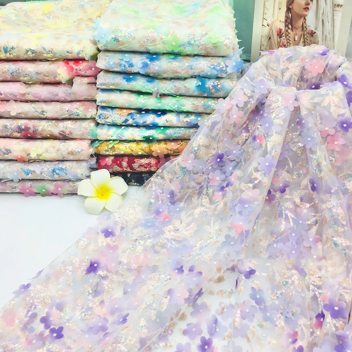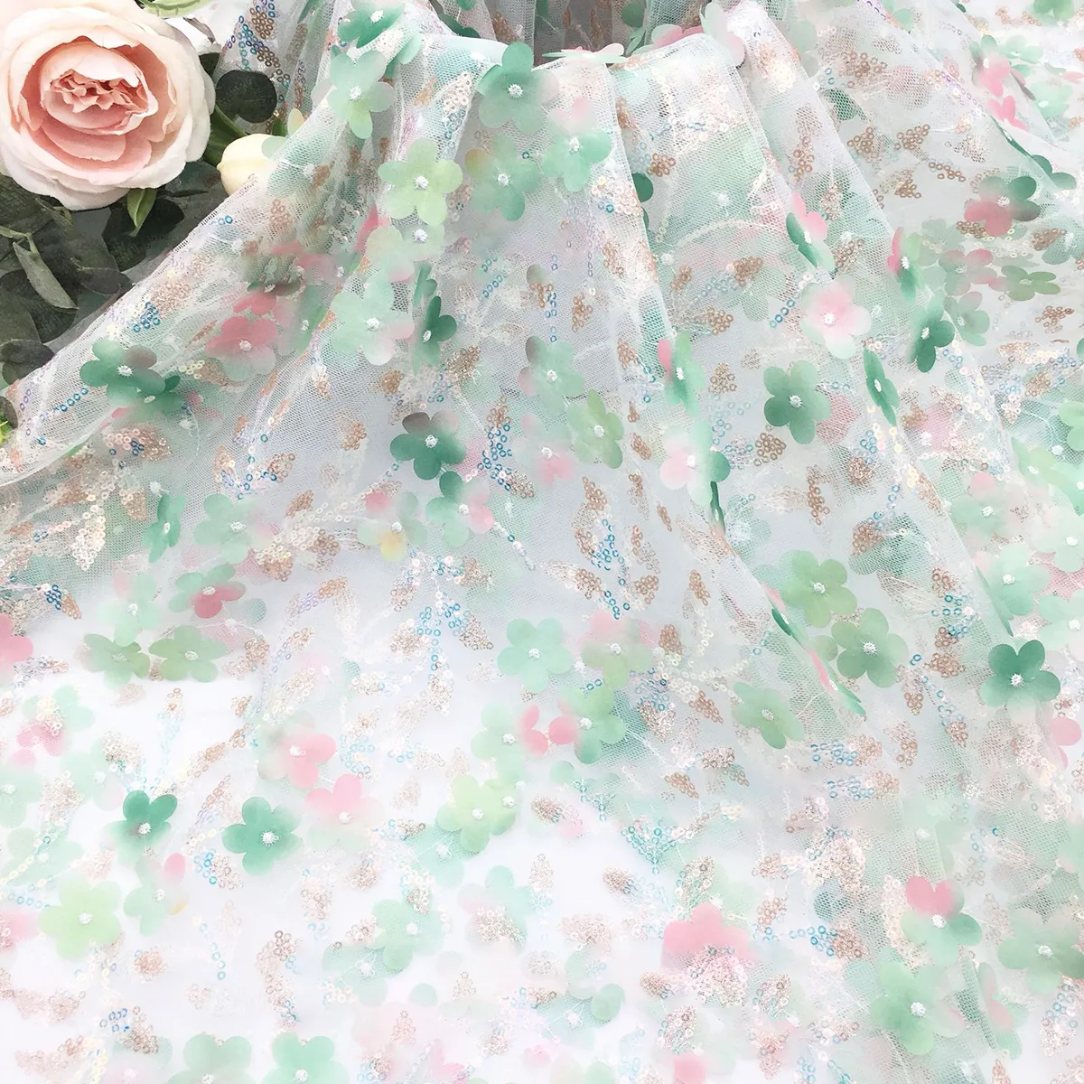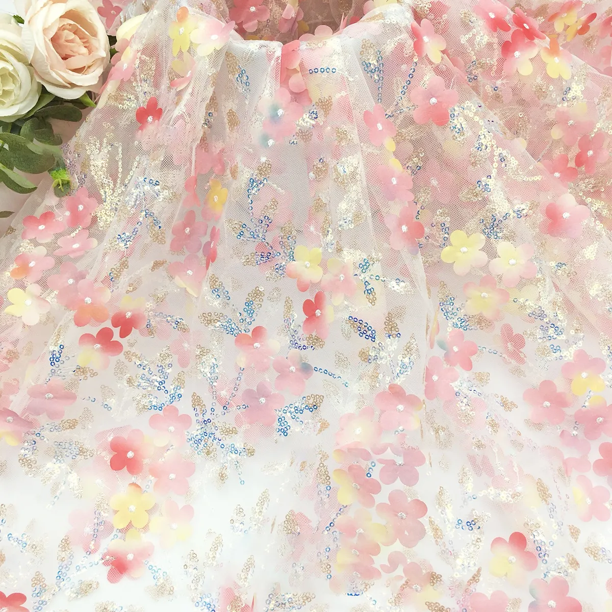 Dreamy 3D Floral Blossom & Sequin Embroidery Fabric