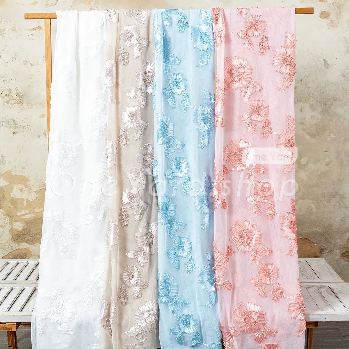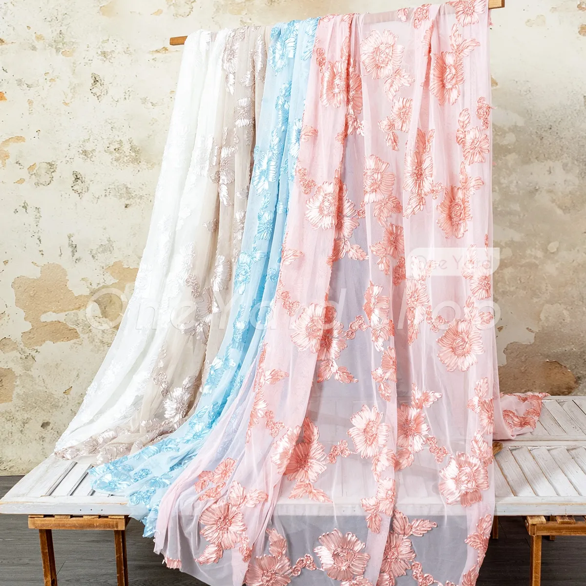 3D Hibiscus Ribbon Floral Stretch Embroidery Fabric