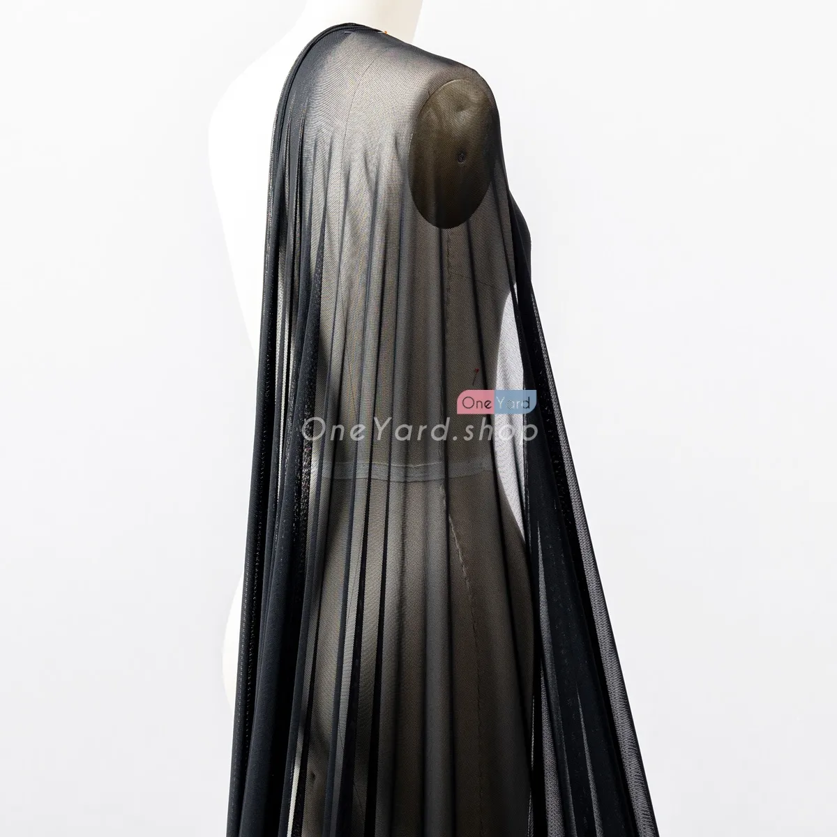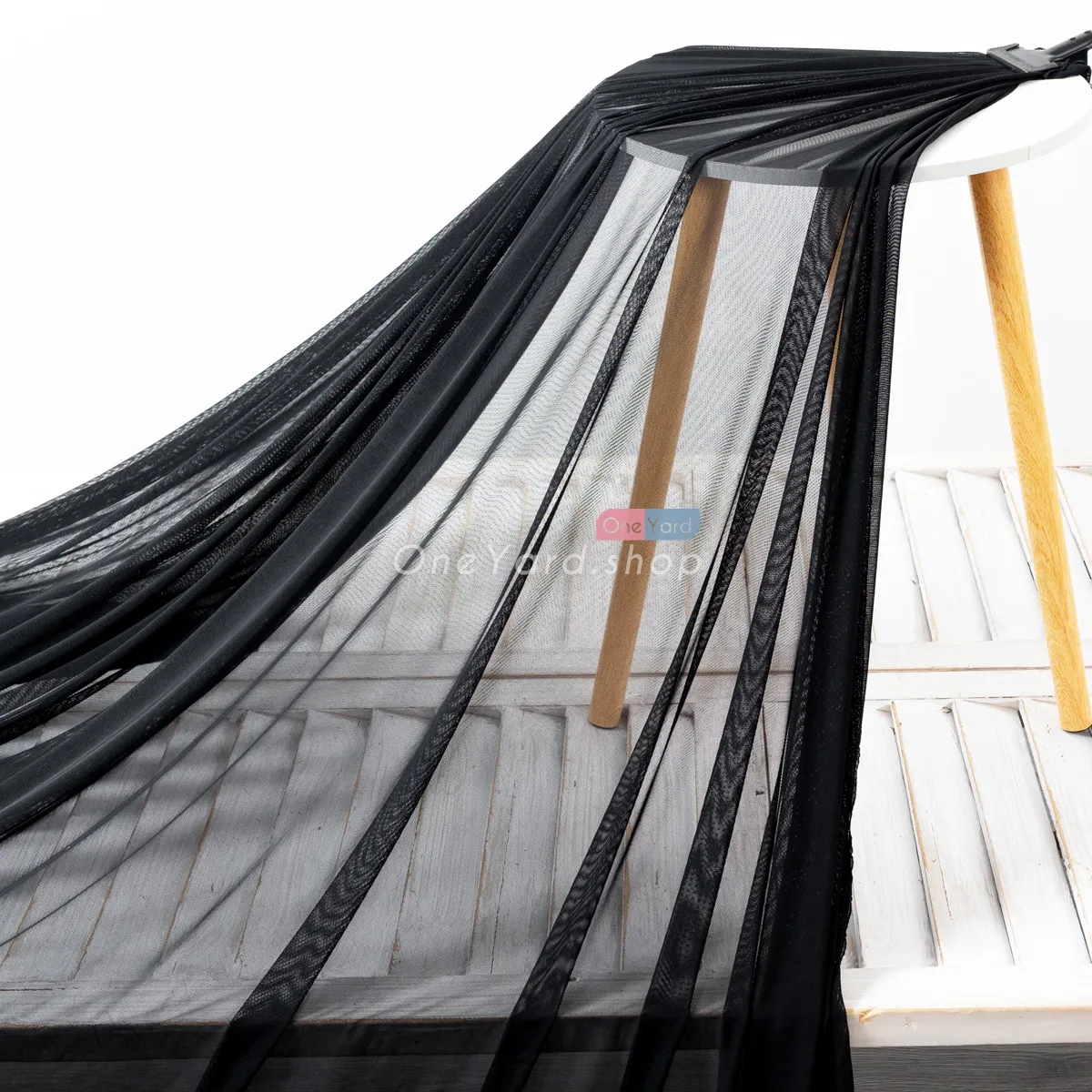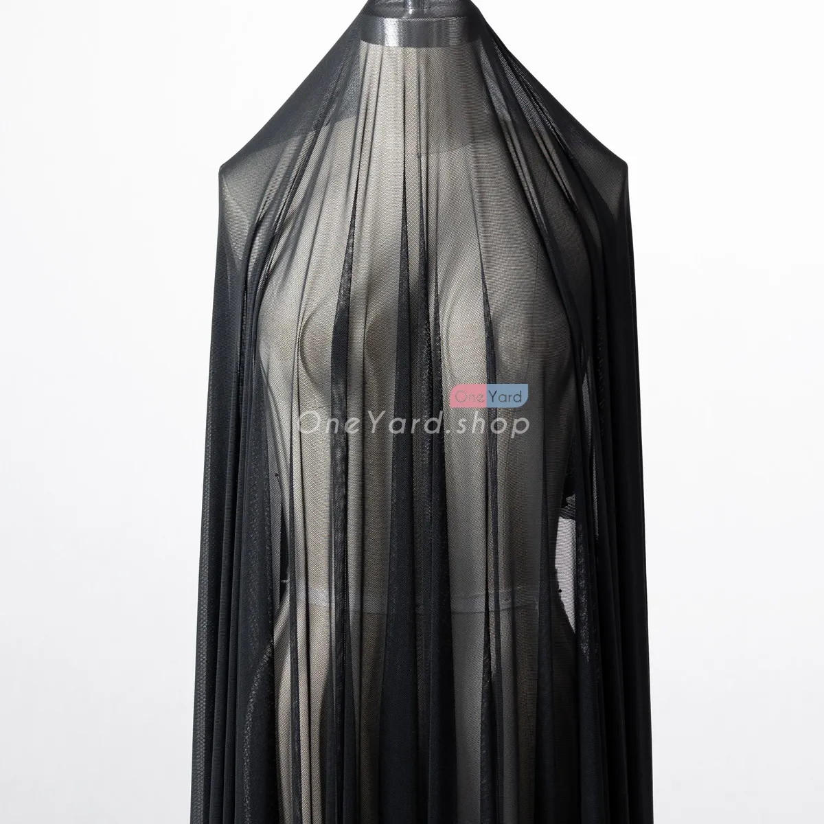 Excellent 4-way stretch black lightweight jersey mesh fabric by the yard. The black spandex net tulle material is soft, sheer, 4-way high elastic, and skin-friendly.
