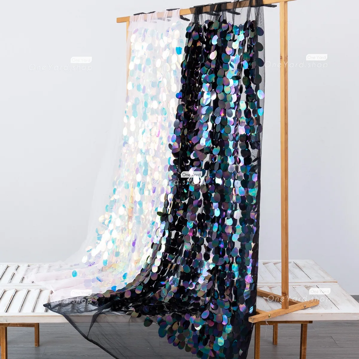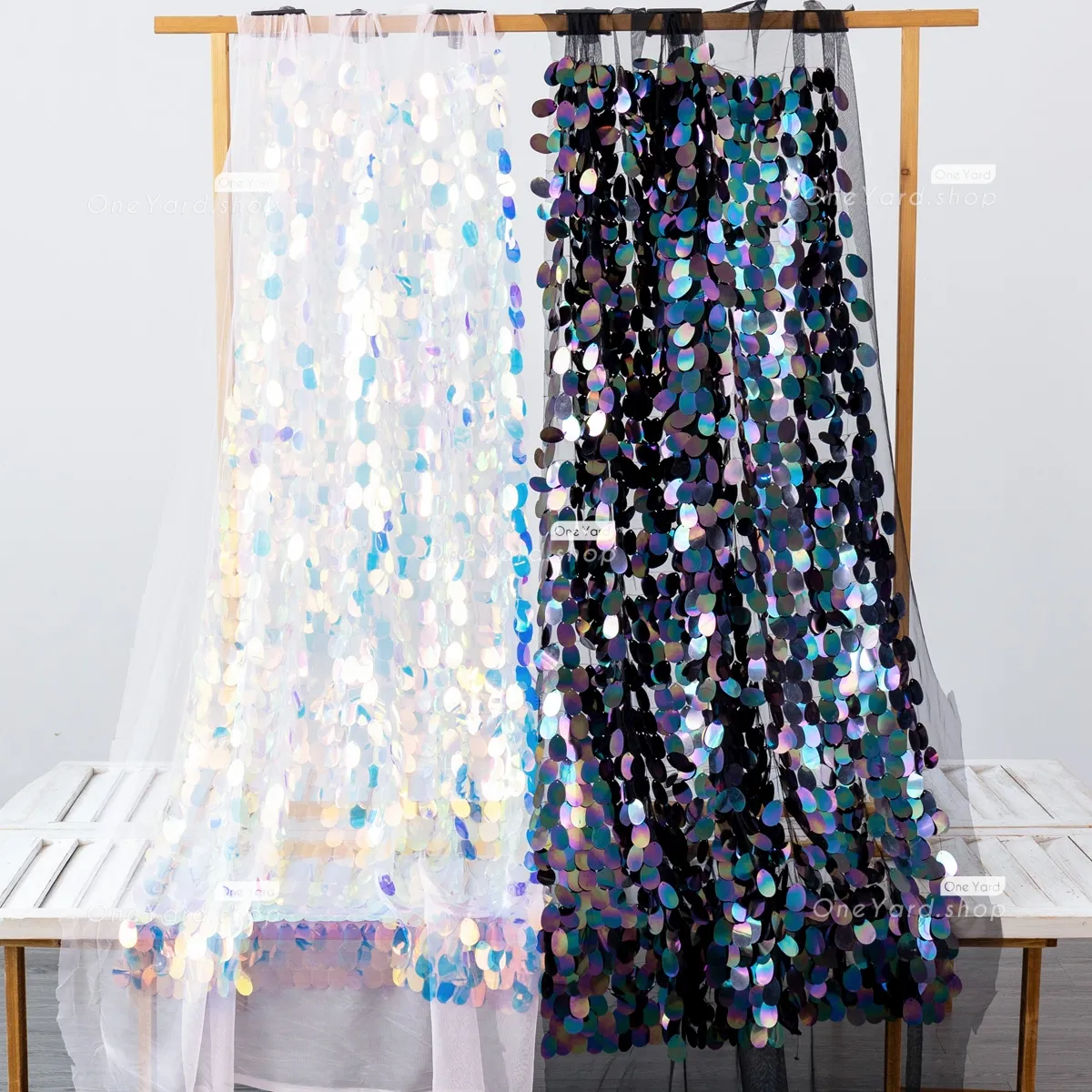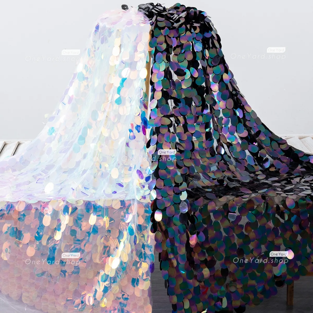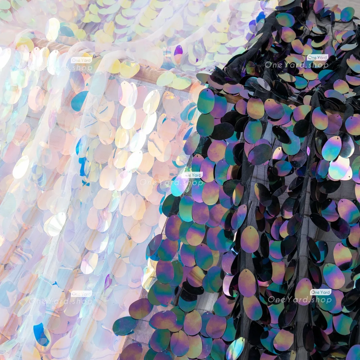 Density-enhanced mermaid scale big sequin fabric sold by the yard. The sparkling 40mm ellipse sequin fabric is perfect for making special occasion dresses, party decorations, and much more. Sequin size: 40mm.