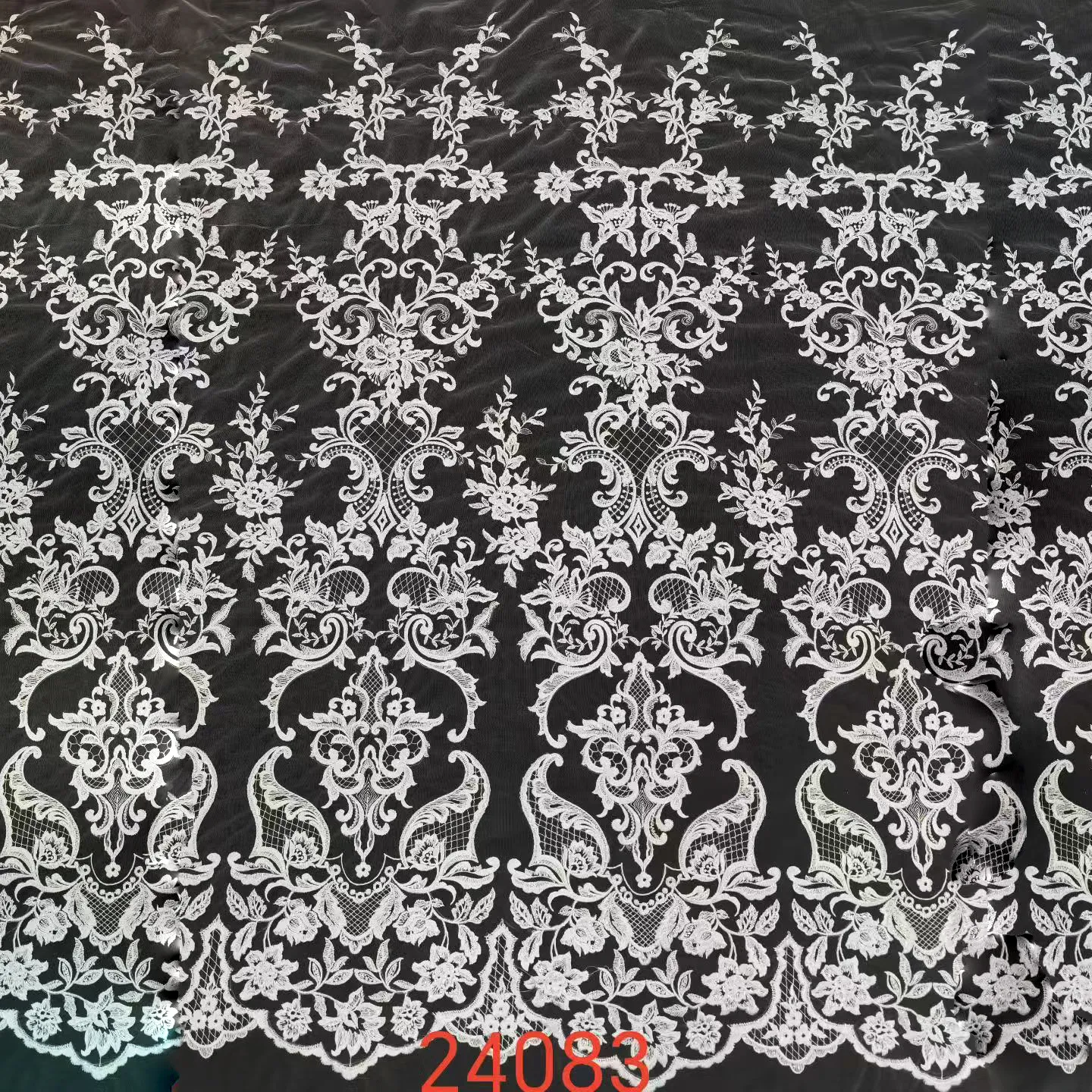 This abstract pattern embroidery lace fabric features a highly intricate and symmetrical design. The main motifs resemble ornate, damask-like medallions or crests, which are repeated across the fabric. These are connected by delicate scrolling patterns and smaller floral sprays. This stunning lace is perfect for a full overlay on a wedding dress, an evening gown, or a formal skirt.