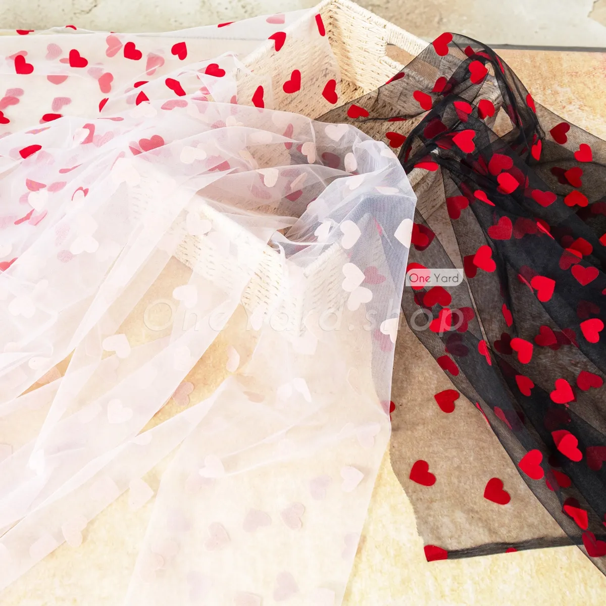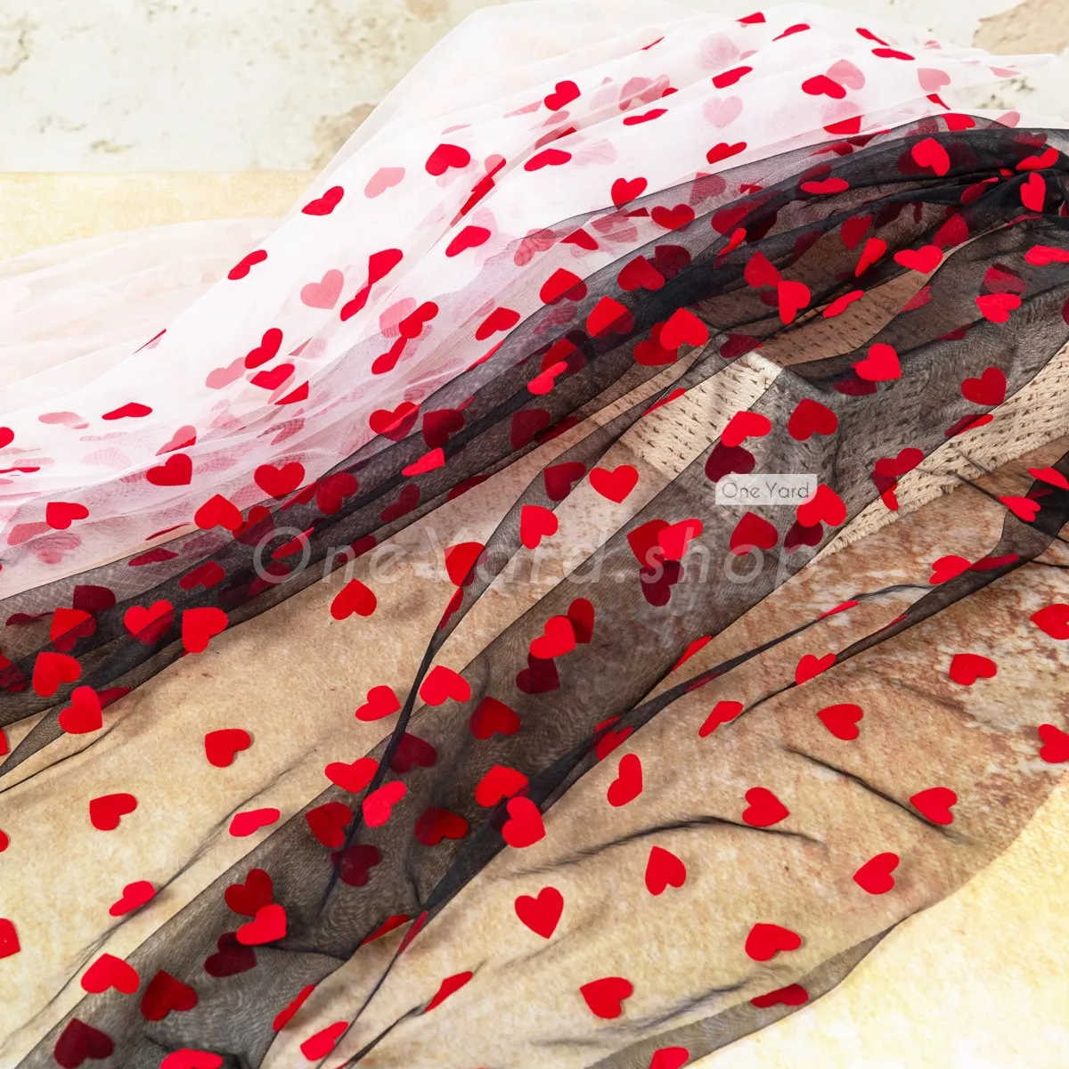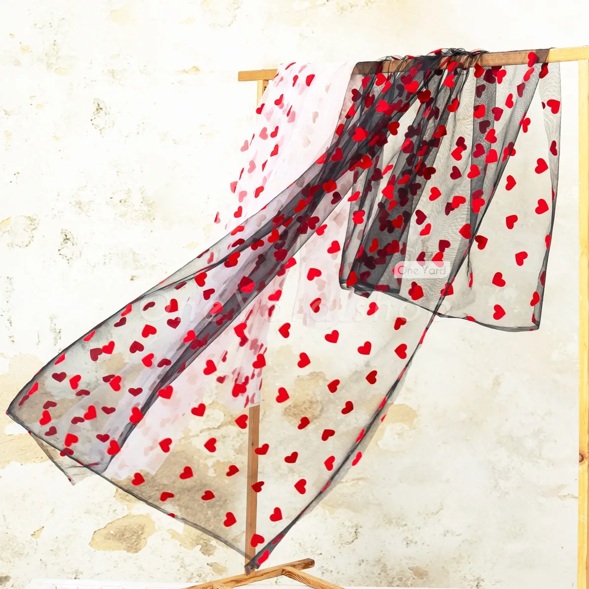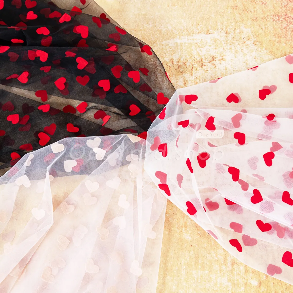 Adorable Large Red Heart Flocked Tulle Mesh Fabric