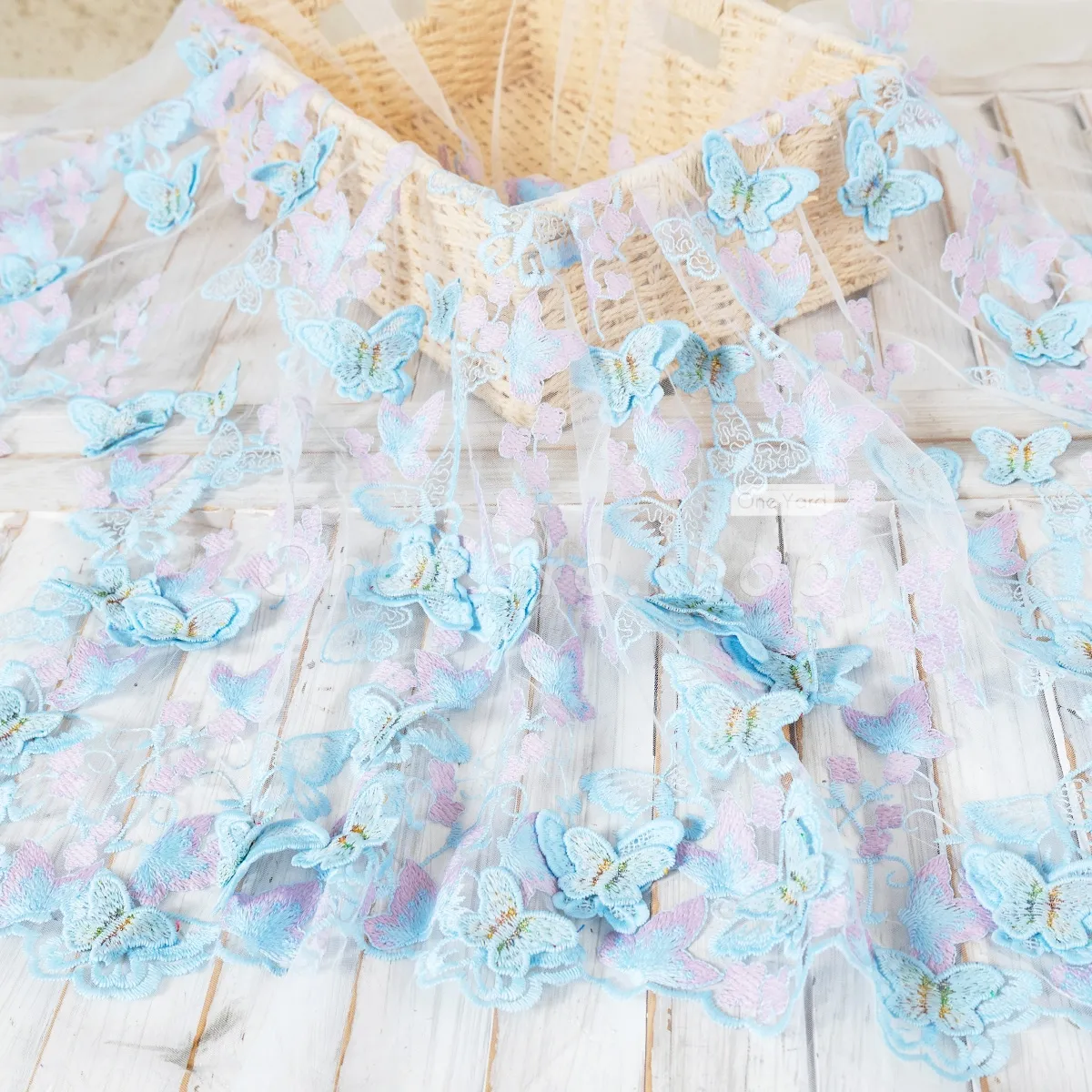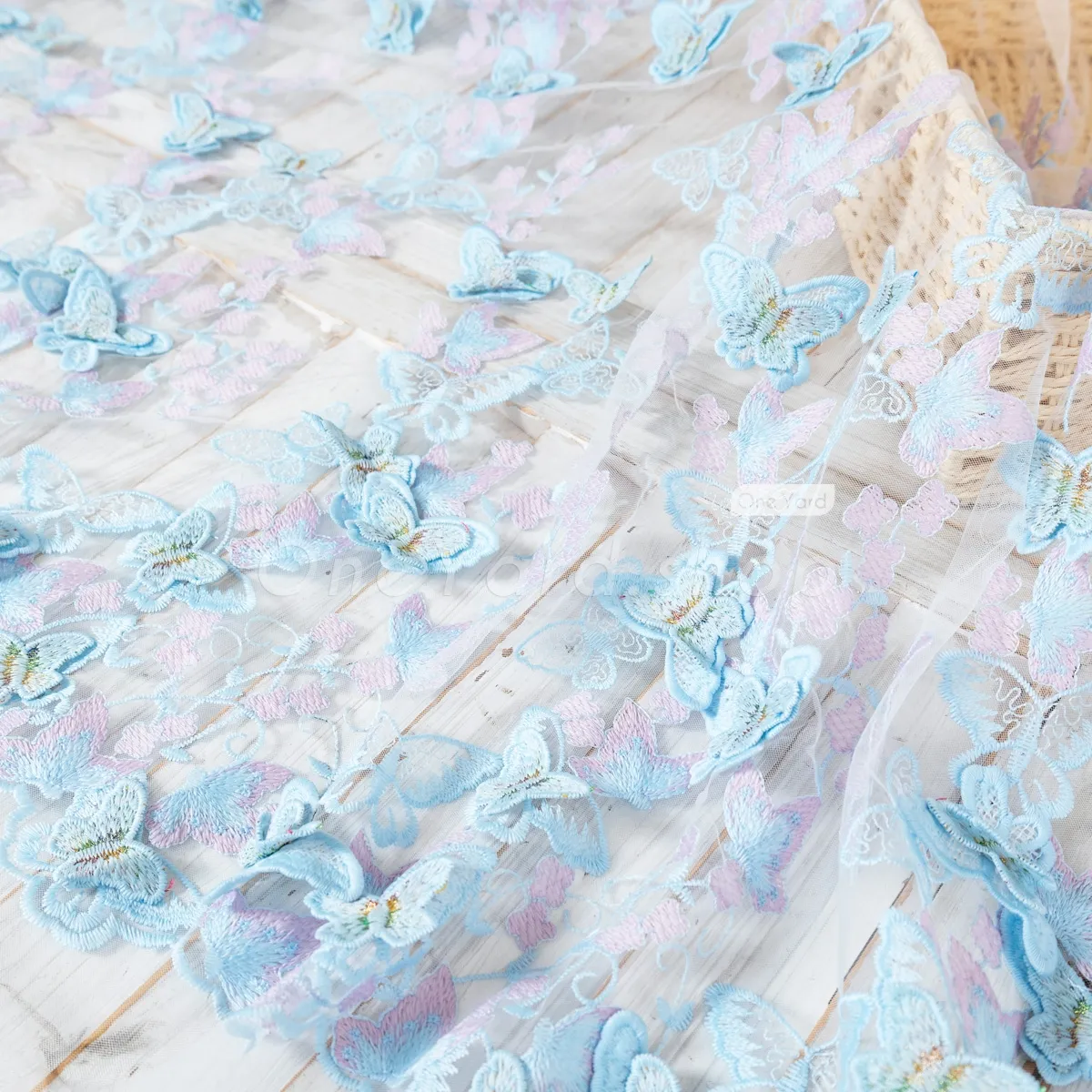 Lovely baby blue and pink 3D butterfly embroidery mesh lace fabric sold by the yard. Beautiful baby blue and pink color butterflies embroidered on soft mesh for dressmaking, decorations, craft projects, dress motifs, and much more.