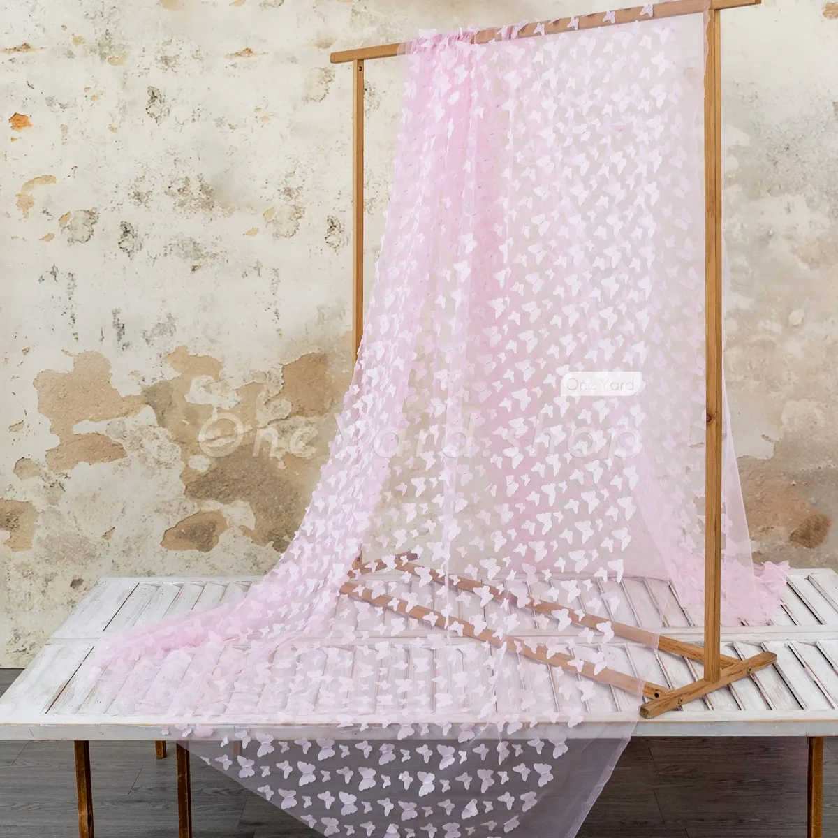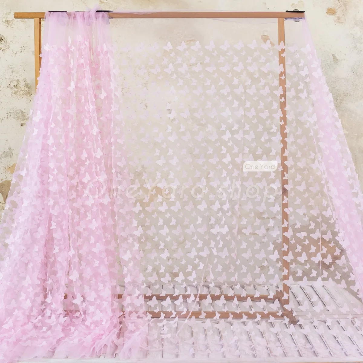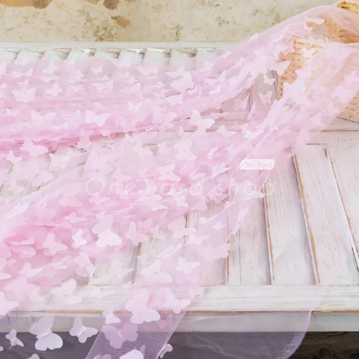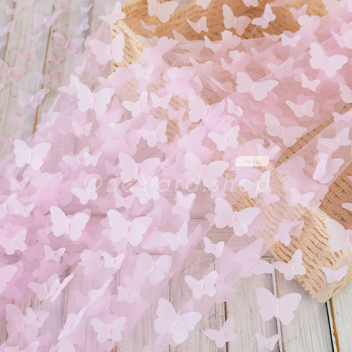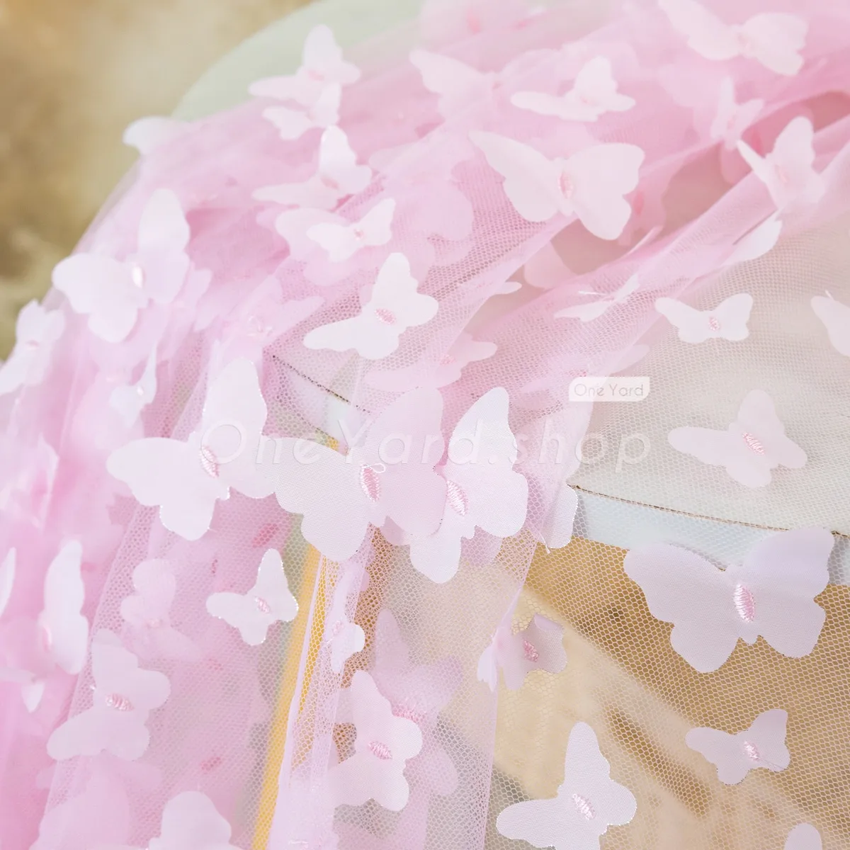 Lovely baby pink 3D butterfly embroidery soft mesh fabric sold by the yard. Soft baby pink 3D butterfly mesh material for making flower girl dresses, dance gowns, party event decorations, and more.