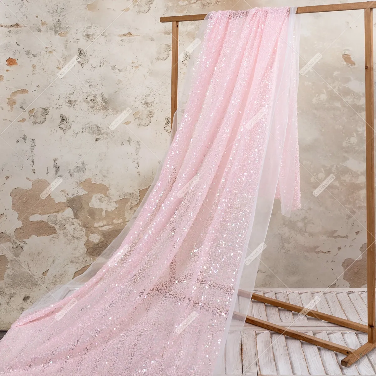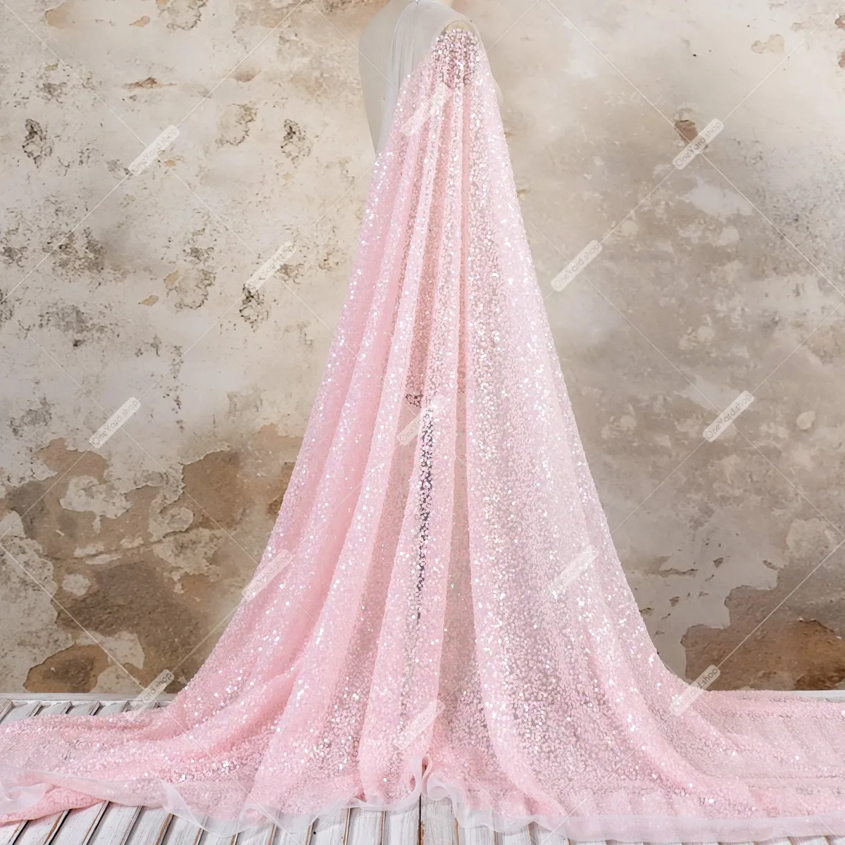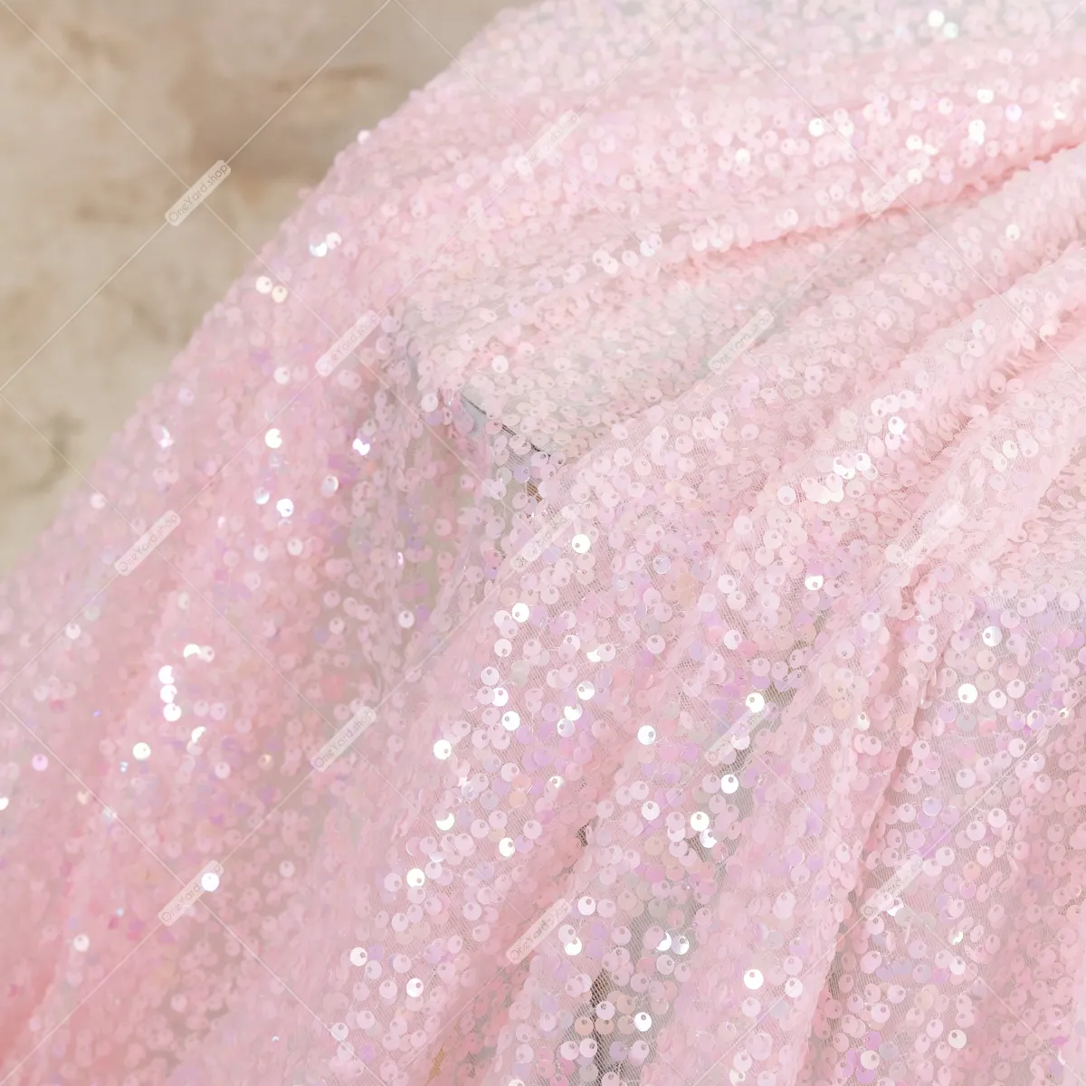 Baby pink with some tangerine color 5mm sequins all over on mesh material for dressmaking by the yard. Beautiful baby pink sequin fabric for making prom dresses, bridal gowns, special occasion dresses, and more.