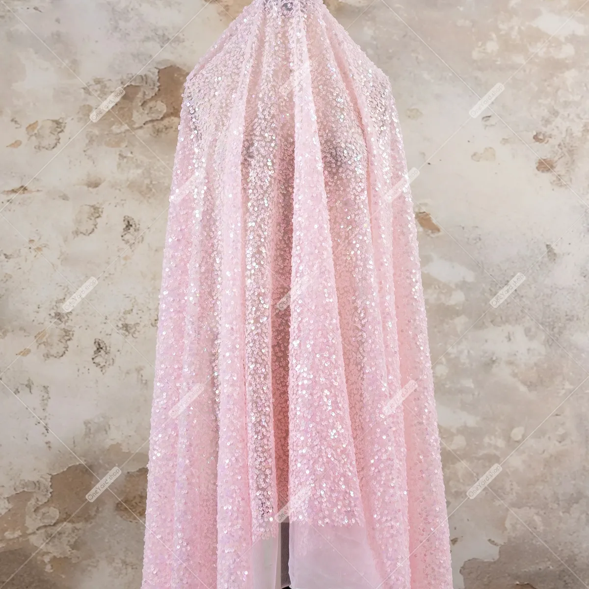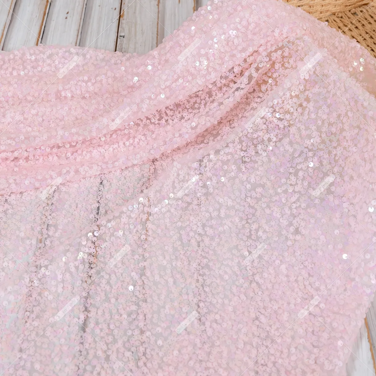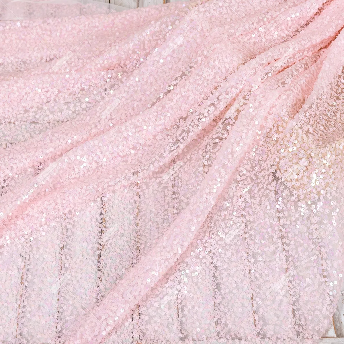 Baby pink with some tangerine color 5mm sequins all over on mesh material for dressmaking by the yard. Beautiful baby pink sequin fabric for making prom dresses, bridal gowns, special occasion dresses, and more.