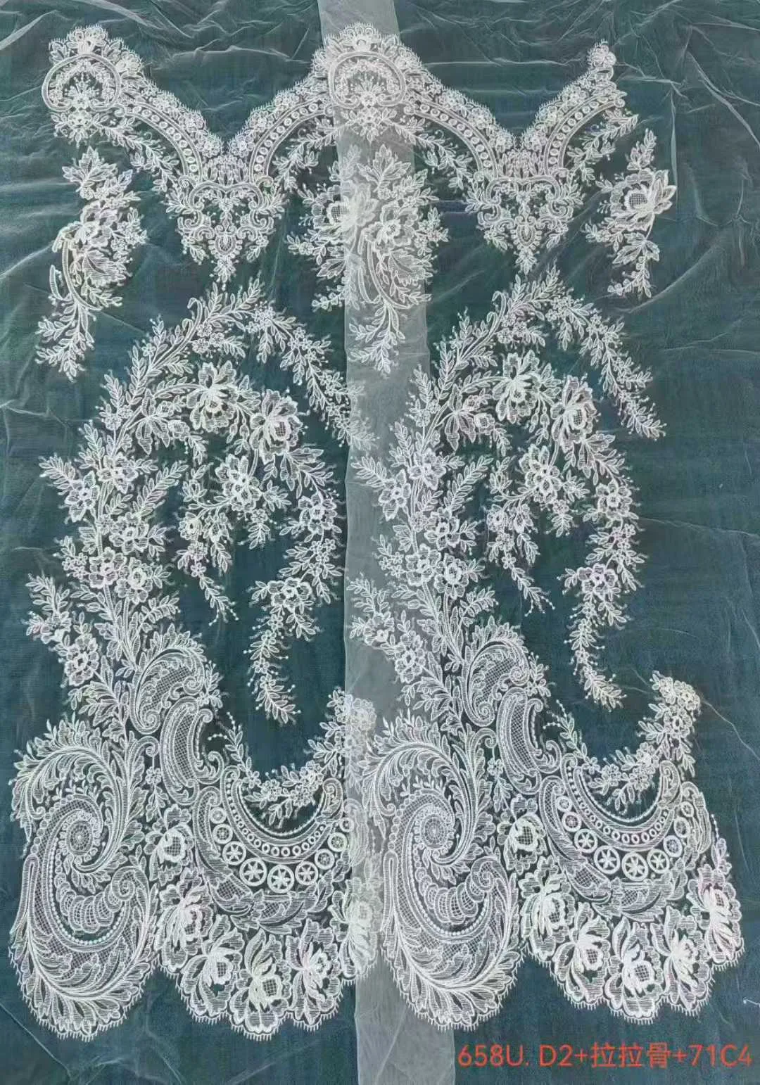 Make a majestic and unforgettable statement with the high-density threads and prominent 3D cording mesh lace fabric. The standout feature is its breathtaking asymmetrical double-border layout. The heavy bottom hem showcases grand Baroque swirls and highly unique circular/wheel lattice cutouts, creating a striking architectural presence. Graceful, sweeping floral vines bridge the center, reaching up towards an elegant top edge finished with suspended scalloped swags.