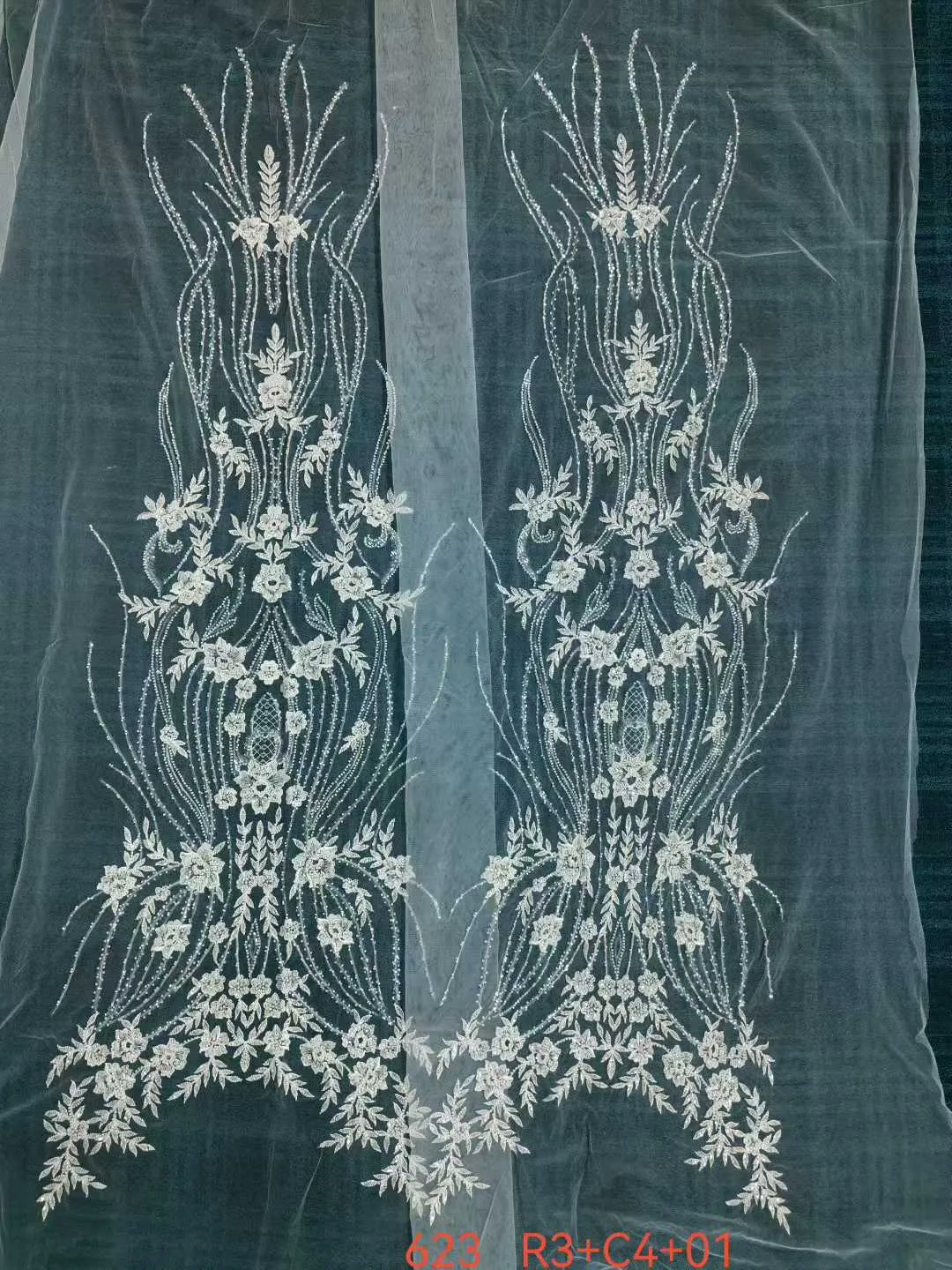 Beaded Corded Ascending Fountain Floral Mesh Lace