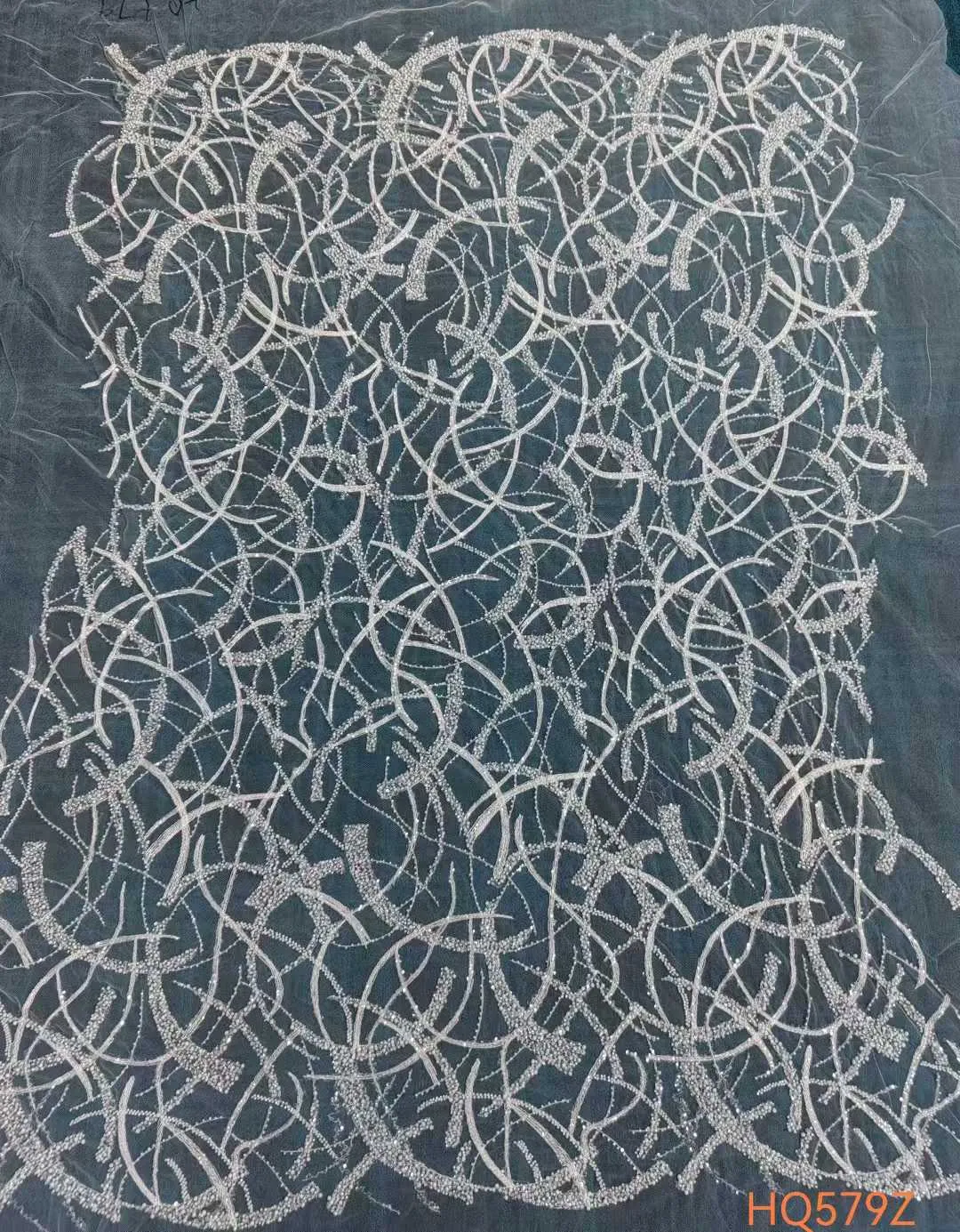 Make a bold, contemporary statement with the heavy beaded mesh lace fabric. Deviating from traditional florals, this avant-garde design features an all-over intricate web of overlapping geometric arches and curved lines. Each line is densely embellished with shimmering sequins and beads, creating a high-impact, multi-dimensional sparkle. The abstract pattern offers a modern, architectural aesthetic while maintaining a soft, elegant drape on a sheer mesh base.