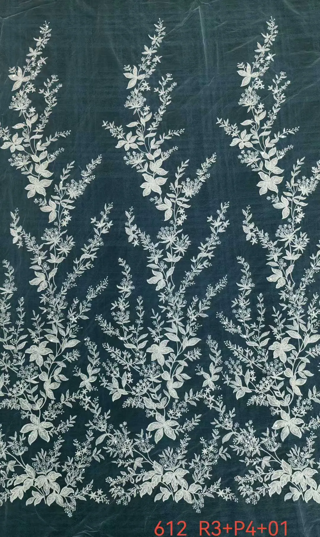 This beaded floral vine mesh lace fabric design features a pattern of distinct, vertical climbing branches adorned with delicate, star-shaped blossoms and scattered botanical sprigs. Meticulously embroidered with lustrous rayon thread on a sheer lightweight mesh, the floral motifs are beautifully highlighted by a subtle, elegant arrangement of sequins and beads. Perfect for crafting ethereal woodland bridal gowns, romantic fairycore prom dresses, and elegant, flowing overlays.