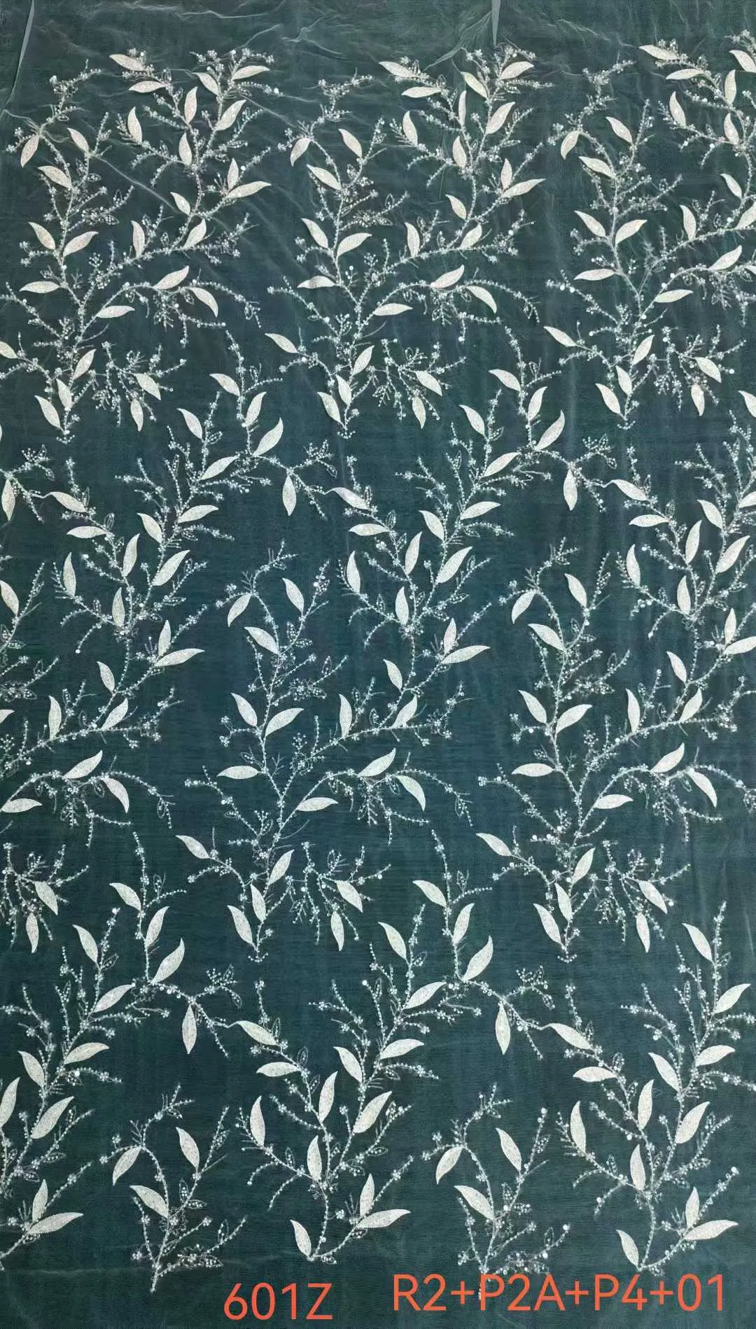 This beaded botanical lace features a continuous, all-over pattern of graceful, climbing vertical vines adorned with slender leaves reminiscent of willow or olive branches. The intertwining stems are meticulously embellished with a high-density combination of shimmering beads and sequins, providing a captivating, starlit sparkle against the lightweight sheer mesh base. Perfect for crafting enchanting woodland bridal gowns, romantic fairycore dresses, minimalist evening wear, and elegant sheer overlays.