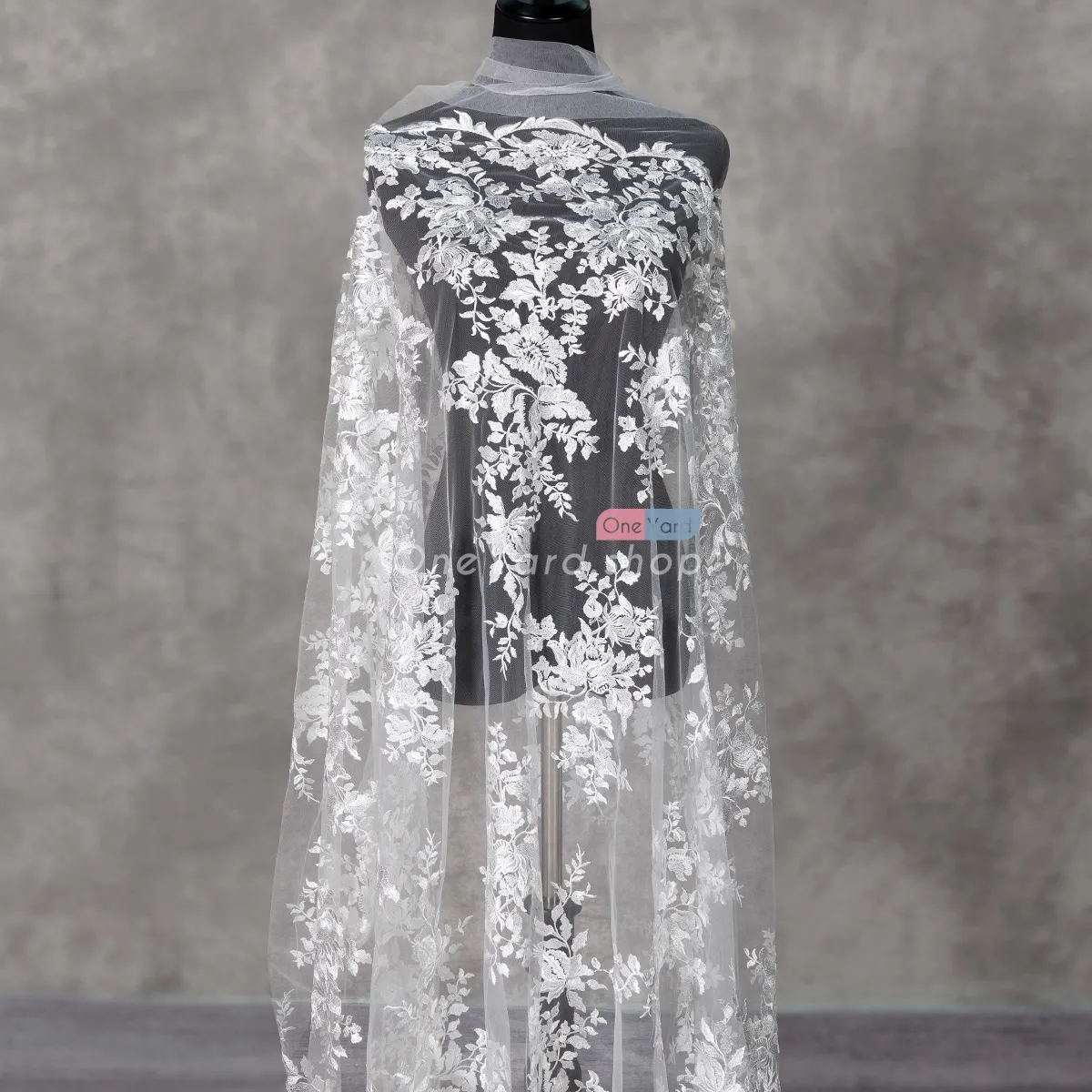 Beautiful floral pattern embroidery bridal lace fabric by the yard. Off-white wedding dress lace fabric with scalloped edges on fine illusion mesh. Perfect for bridal dresses, headpieces, costumes, and much more.