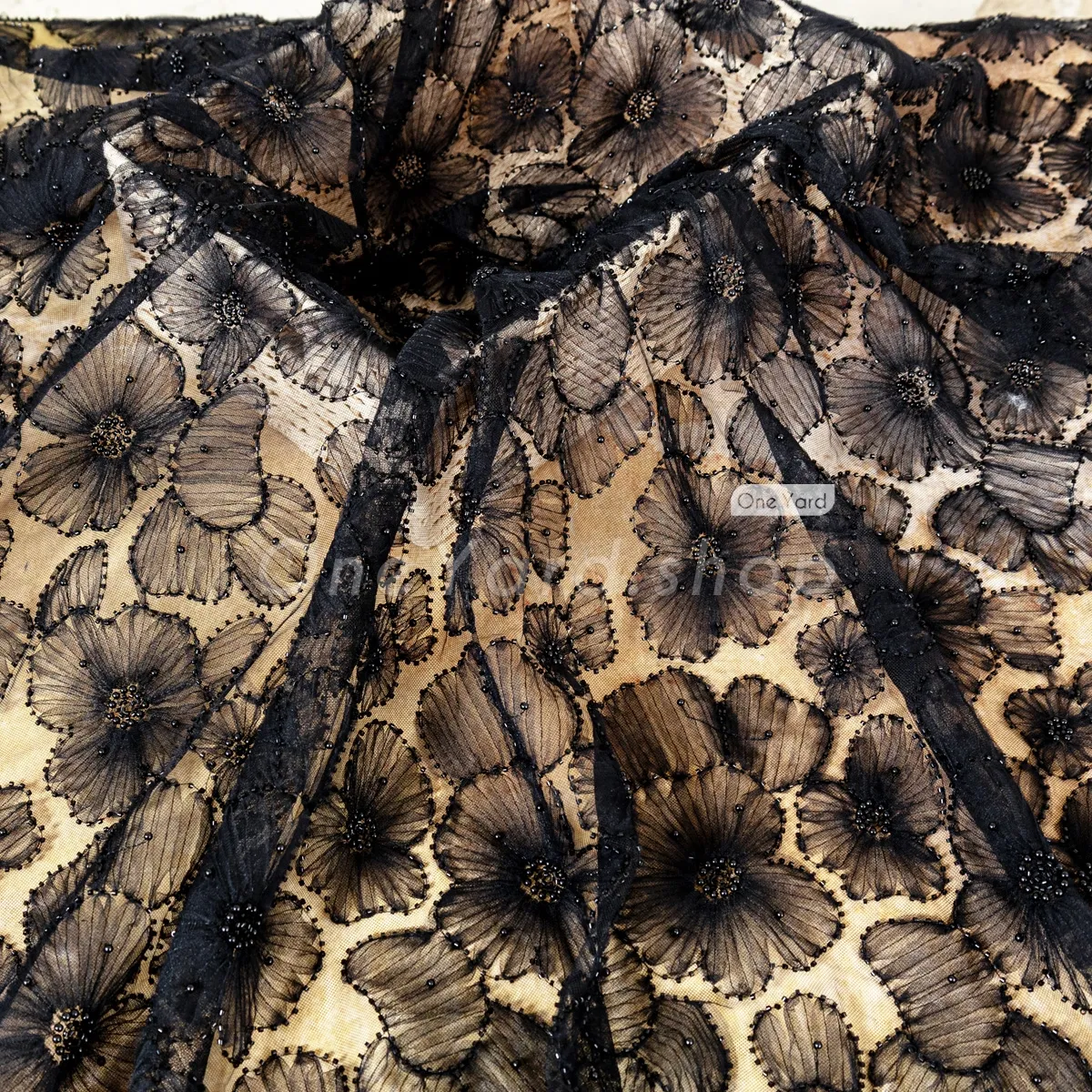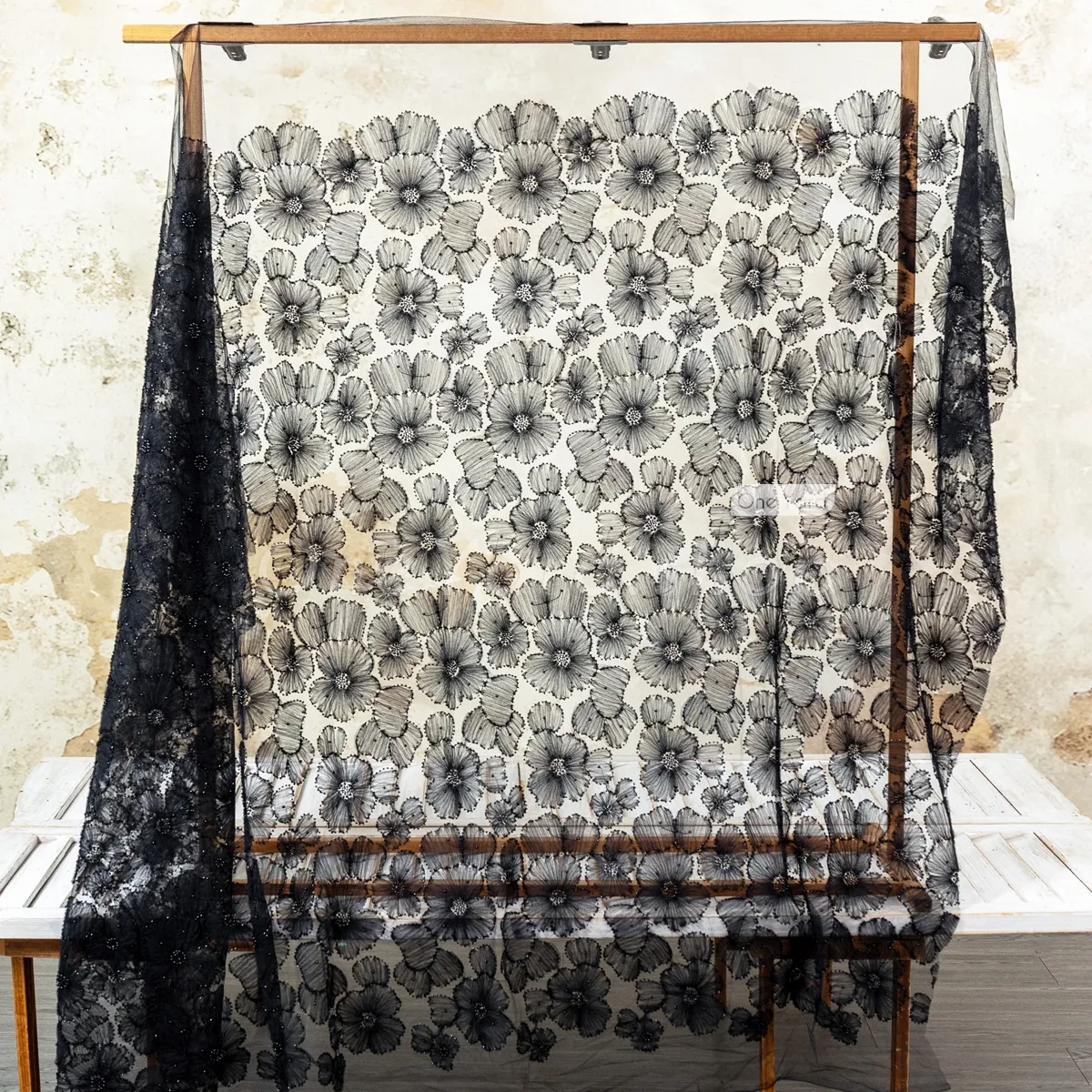 This is a luxury black couture fabric characterized by a dramatic, monochromatic 'noir' aesthetic. It features a sheer, fine black tulle mesh base embellished with beaded & pearled flower motifs. The petals are crafted from layers of pleated or gathered sheer tulle, giving the blooms a raised, textural quality that lifts off the base mesh. It's best suited for high-end formal wear, such as: evening gowns and prom dresses, overlays for skirts or bodices, Gothic or alternative bridal veils and capes.