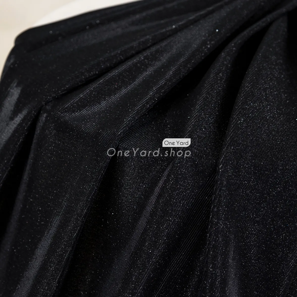 Black metallic glossy lurex glitter fabric by the yard. Glimmer black shimmer fabric for dressmaking. This gorgeous black fabric is a shiny textile with lurex glitters. 2-way stretch and medium weight. Perfect for gowns, backdrops, table covers, and party decor.