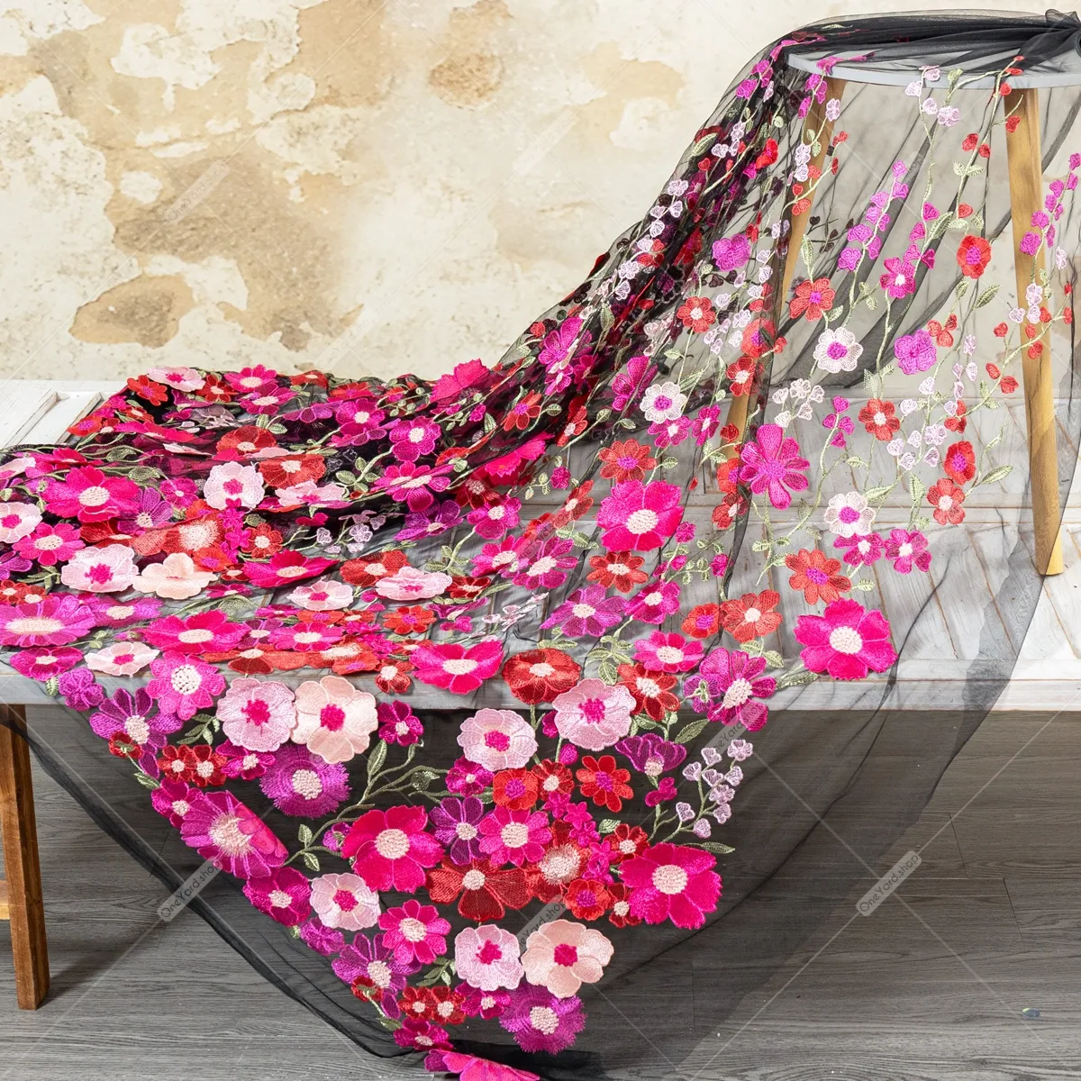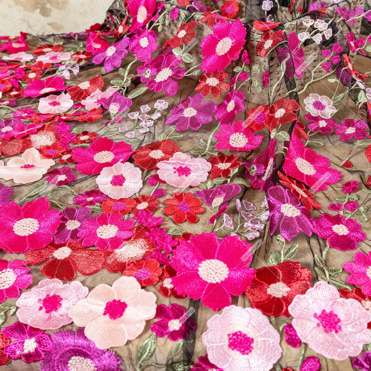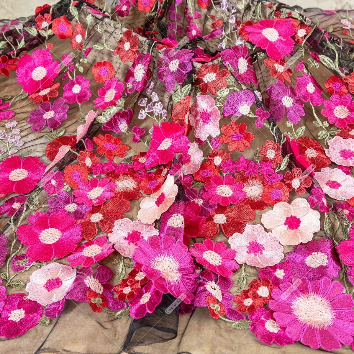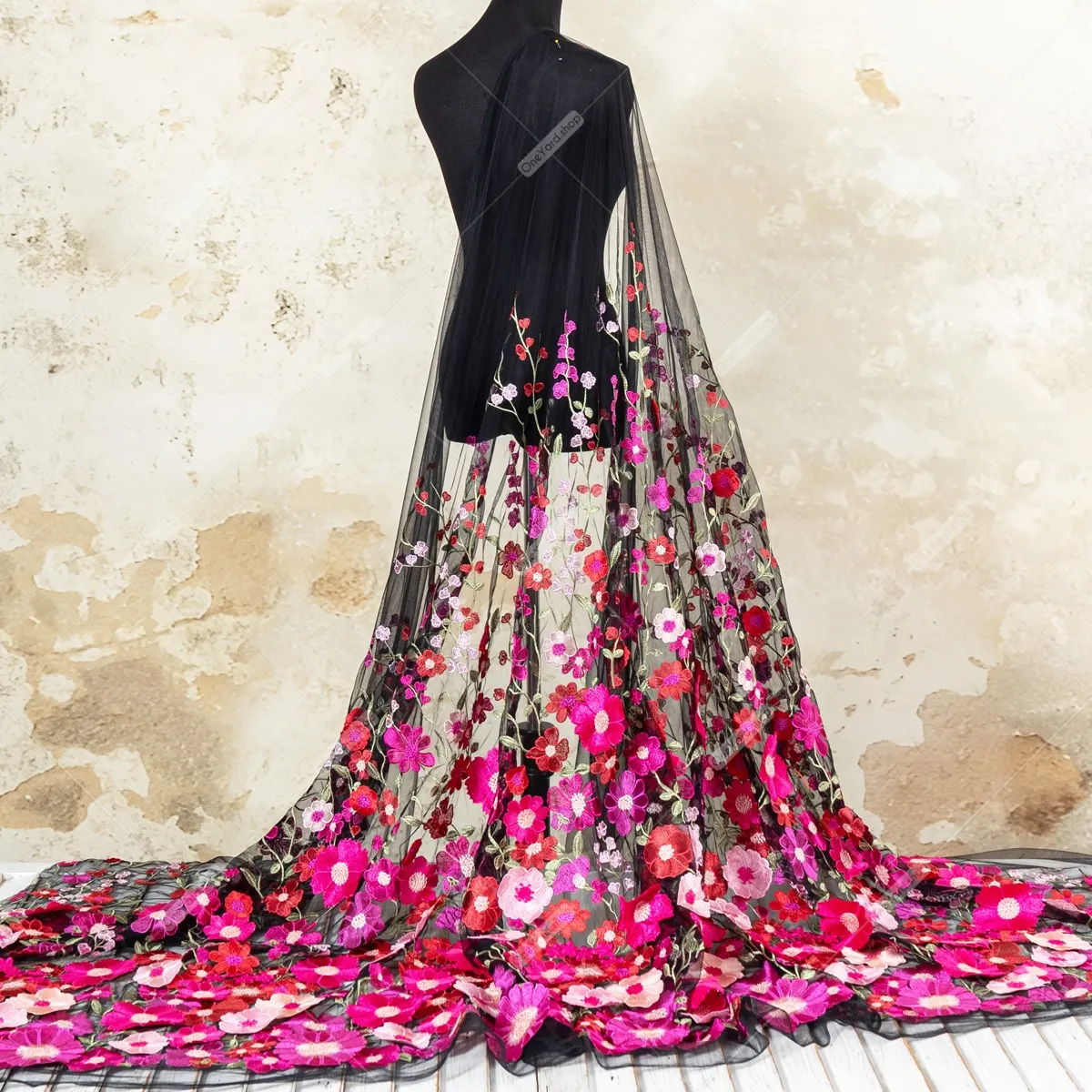 Black Tulle Fuchsia 3D Flower Embroidery Lace Fabric