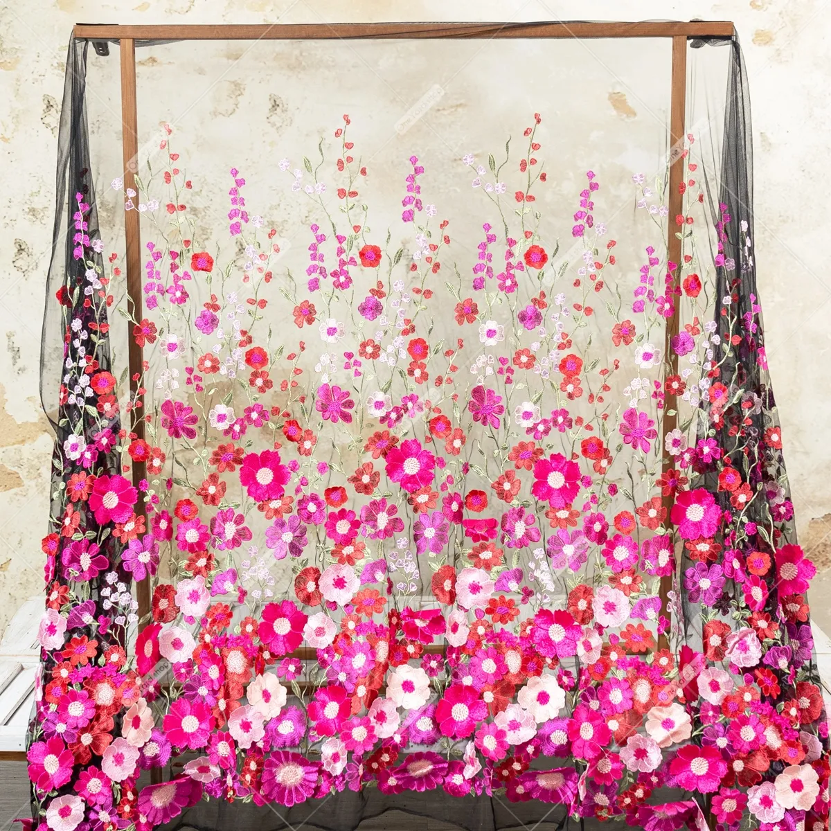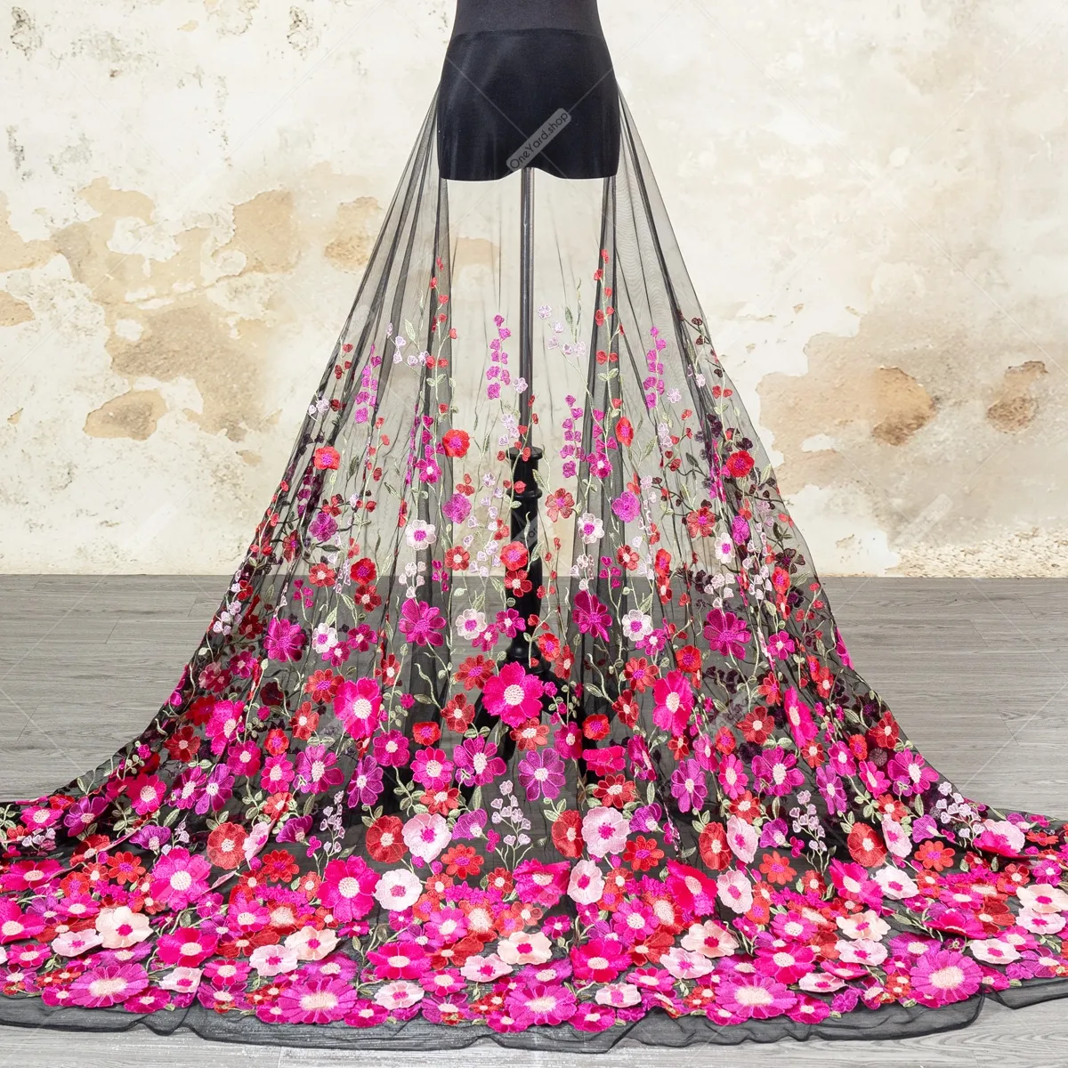 The stunning embroidery tulle lace fabric showcases a captivating multi-color fuchsia 3D flower design. Dense clusters of fuchsia flowers start at the selvage, heavily concentrated in brilliant shades of hot pink, fuchsia, ruby red, and lighter rose pink. The sheer black tulle base provides an elegant, dark backdrop for the vibrant fuchsia flower work. It's perfect for high-fashion garments and special occasions.