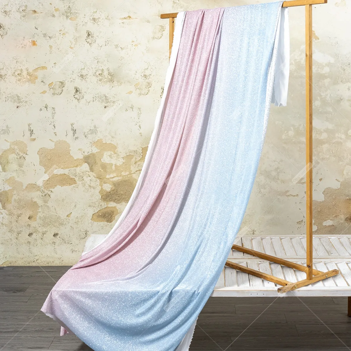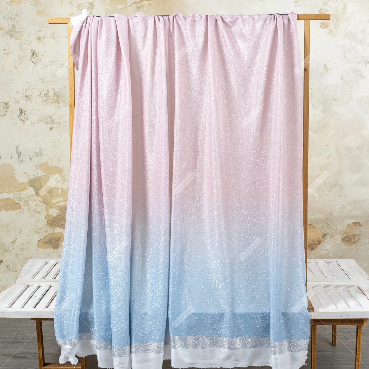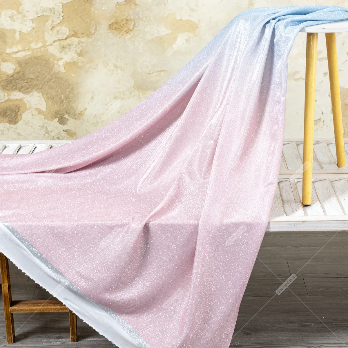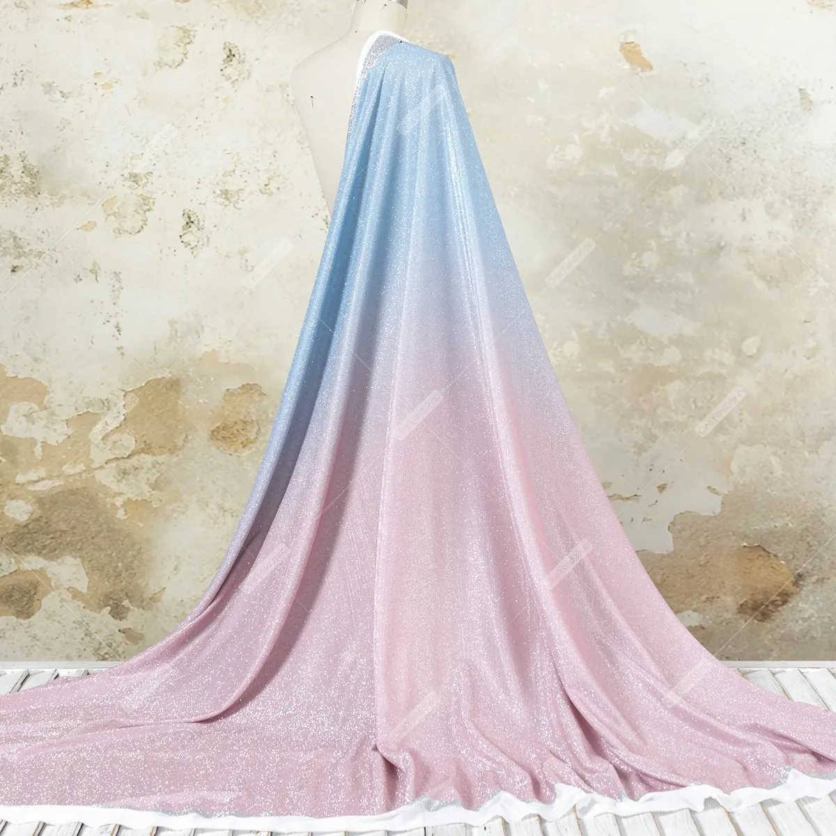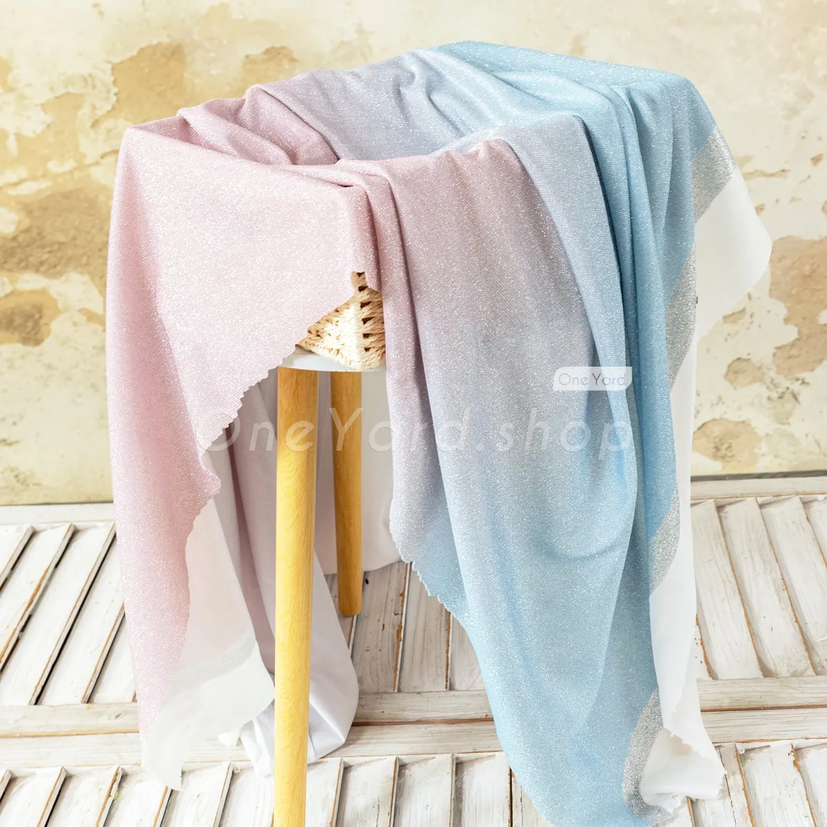 This fabric is a stunning blue & pink ombre stretch lurex knit, featuring a seamless color transition and a radiant, shimmering finish. It's an ideal choice for eye-catching apparel and decorative projects. The surface is densely infused with silver metallic threads (Lurex), creating a consistent, dazzling sparkle that catches the light from every angle.