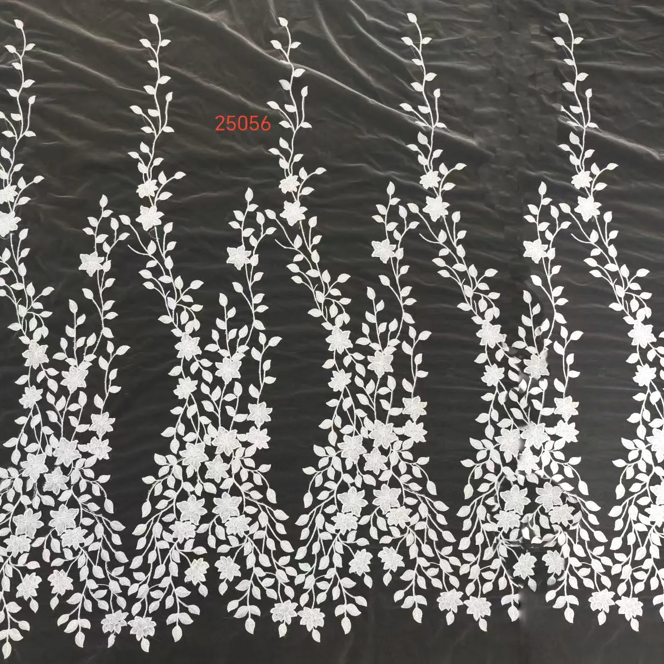 This is a beautiful leaf pattern lace fabric with a cascading, vine-like design. The lace has a romantic, ethereal, and slightly bohemian feel due to its leaf design. Perfect for a wide range of applications, including outdoor bridal gowns, cathedral-length veil, beautiful shawls, sashes, or decorative sleeves. Sold by the yard.