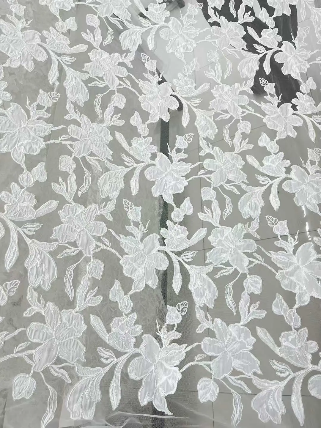 Make a striking impression with this beautiful new arrival. This fabric features bold, opaque floral and leaf appliques gracefully winding across a delicate, sheer mesh background. The stark contrast between the solid botanical motifs and the transparent base creates a stunning dimensional effect. Featuring a continuous, meandering vine design, this versatile lace is perfect for crafting dramatic bridal gowns, eye-catching overlays, and romantic statement dresses. Sold by the yard.