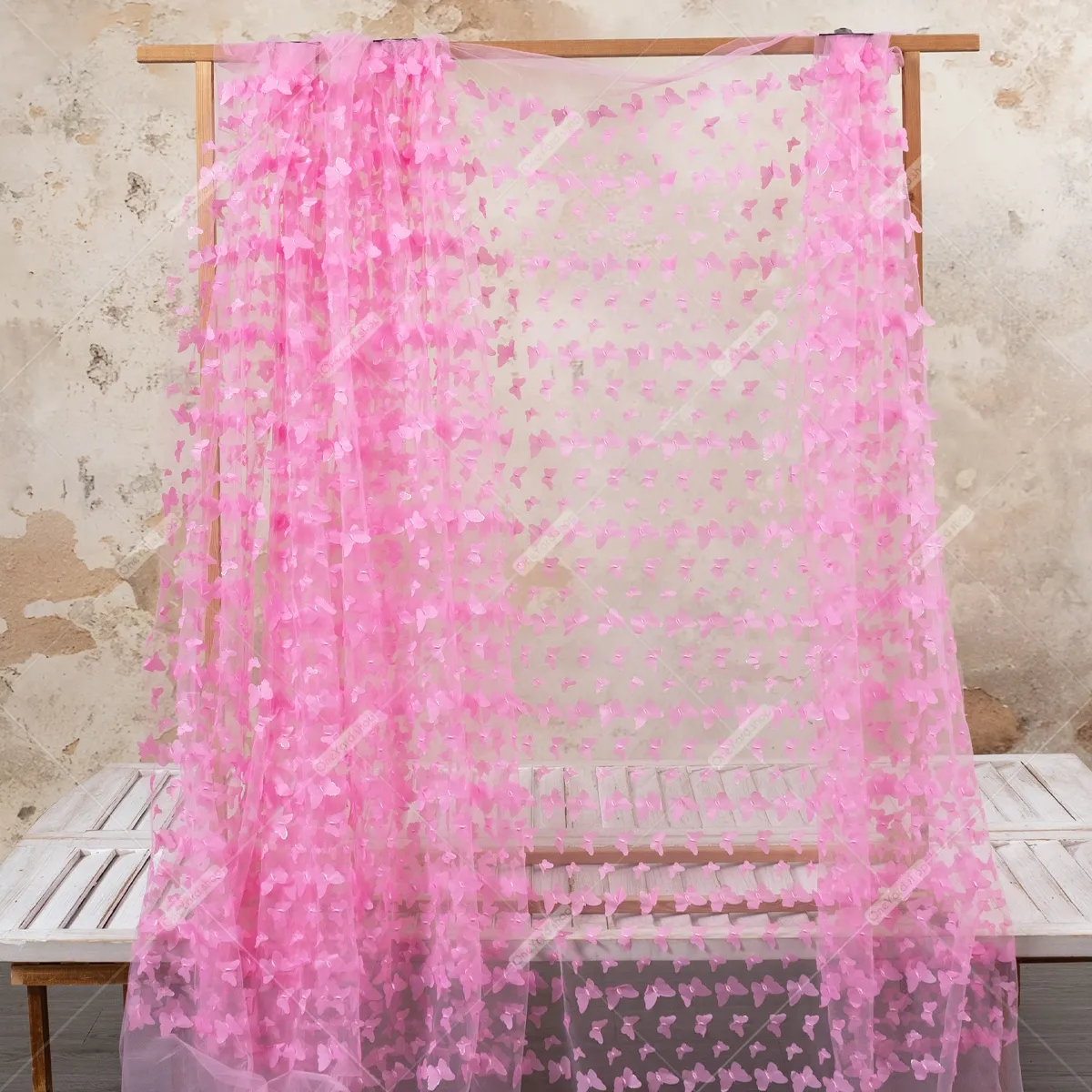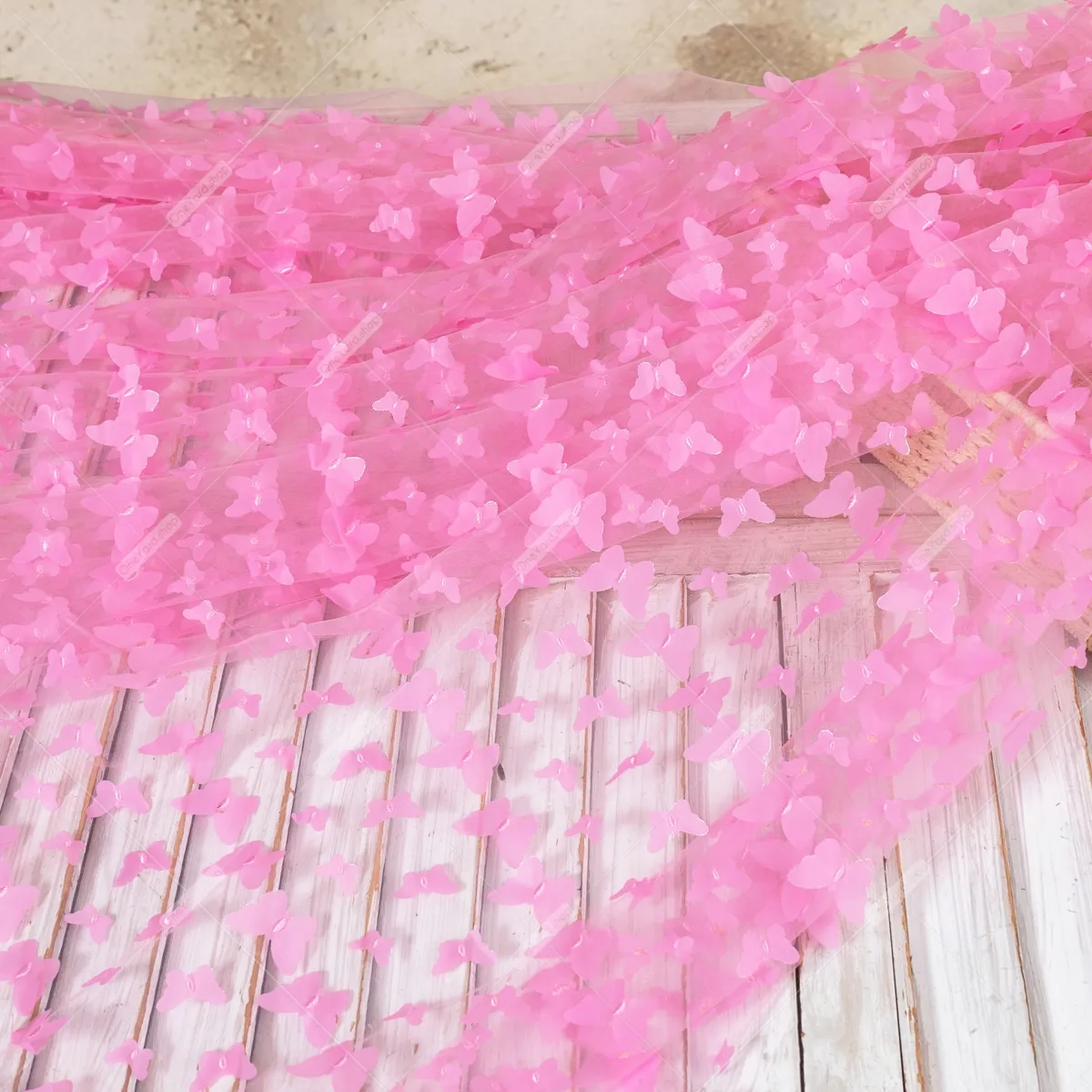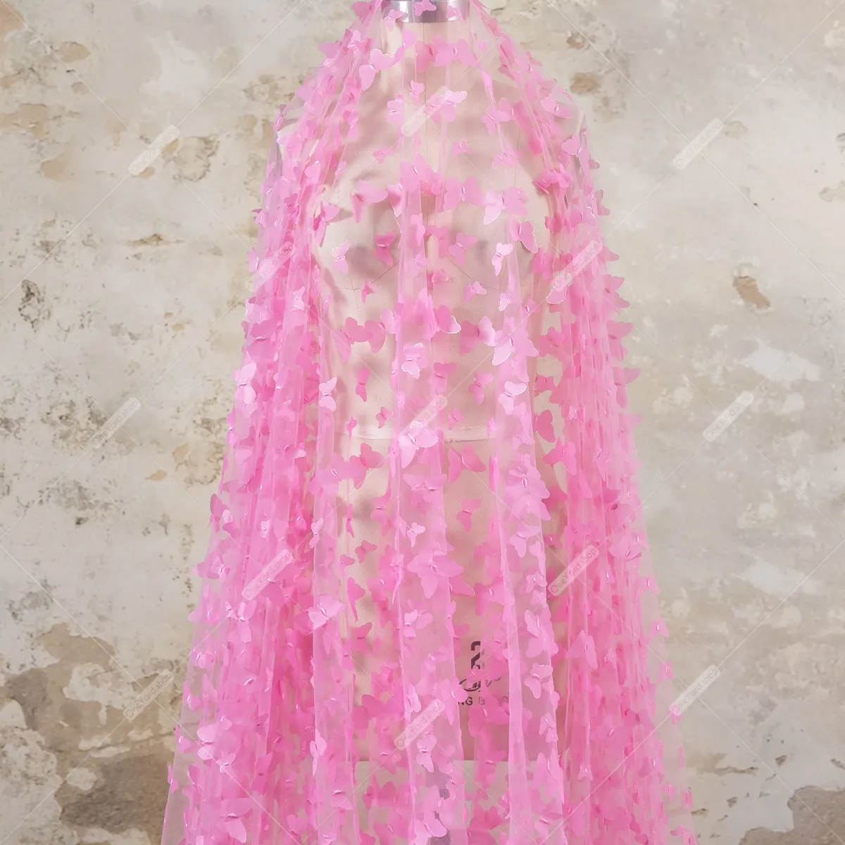 Breathtaking candy pink soft mesh with fluttering 3d butterflies, evoking a whimsical, almost fairy-tale-like quality. The soft candy pink hue, combined with the movement and texture of the butterflies, gives it a sense of lightness and ethereal beauty. This type of embroidery fabric could be used in many ways, from creating a stunning cape or overlay for a bridal gown to a show-stopping piece for a prom or special occasion dress. Sold by the yard.