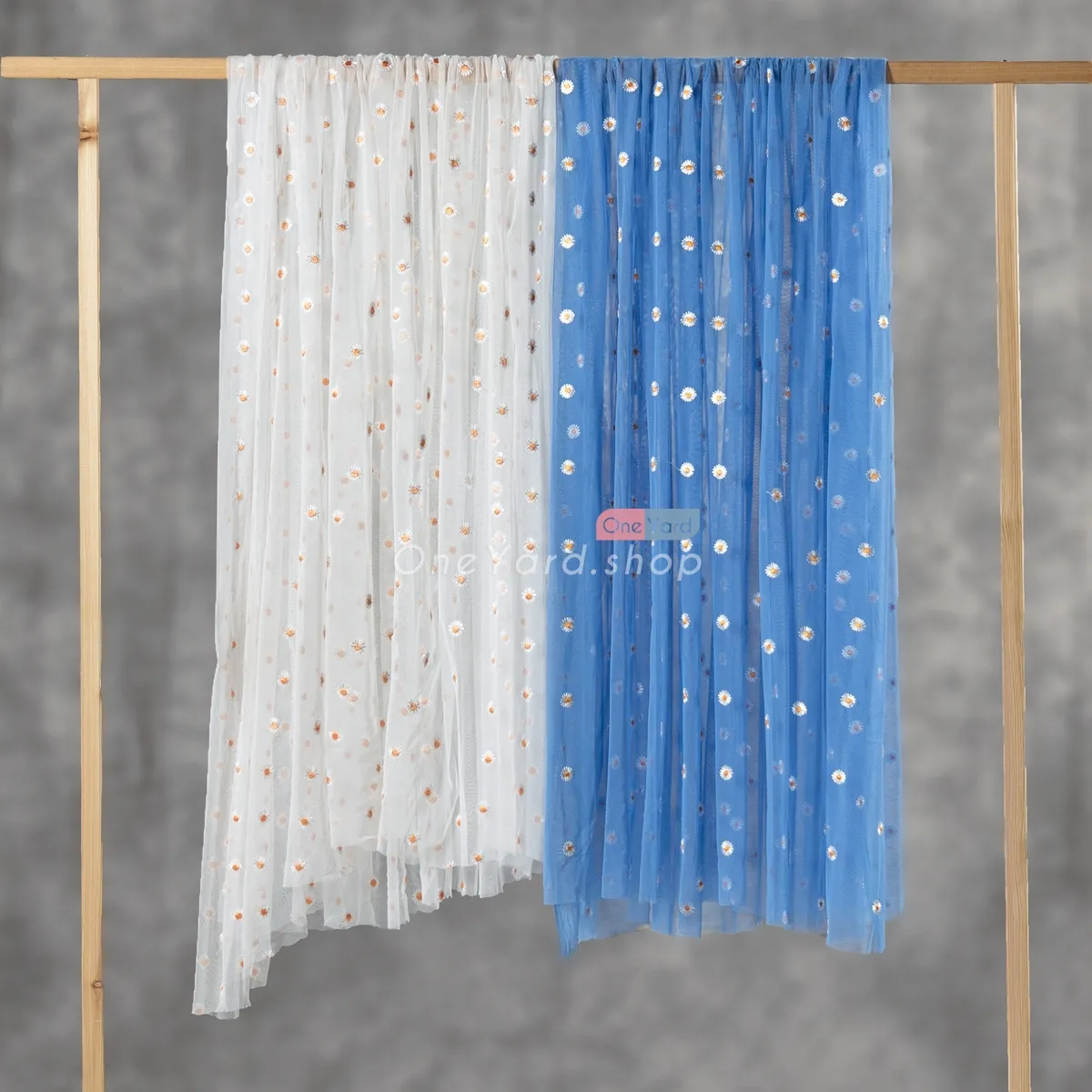 Chrysanthemum flowers printed mesh tulle fabric by the yard. Sunflower soft tulle fabric for making evening dresses, flower girl dresses, tablecloths, and more.