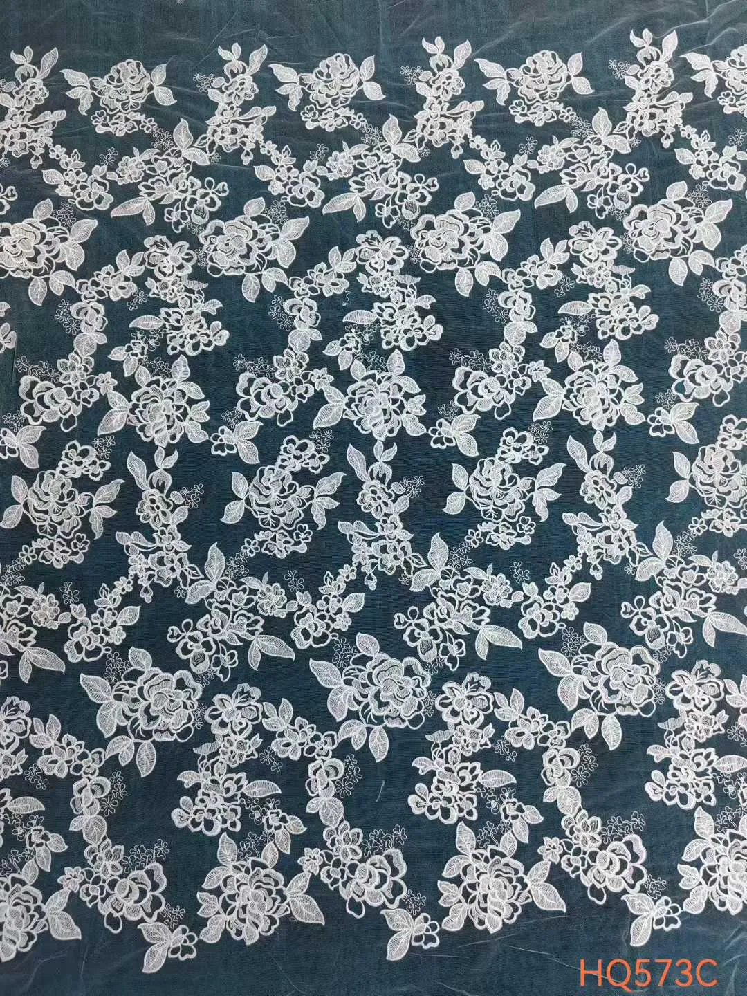 Elevate your bridal and couture projects with the embroidered mesh lace fabric. This romantic design features an all-over pattern of lush, blooming rose clusters and intertwined leafy vines. Meticulously crafted with high-density embroidery thread on a sheer mesh base, these botanical motifs offer a stunning textured look and an elegant drape. The seamless, repetitive design allows for effortless cutting and versatile placement, making it the perfect choice for bridal gowns, overlays, and evening wear.