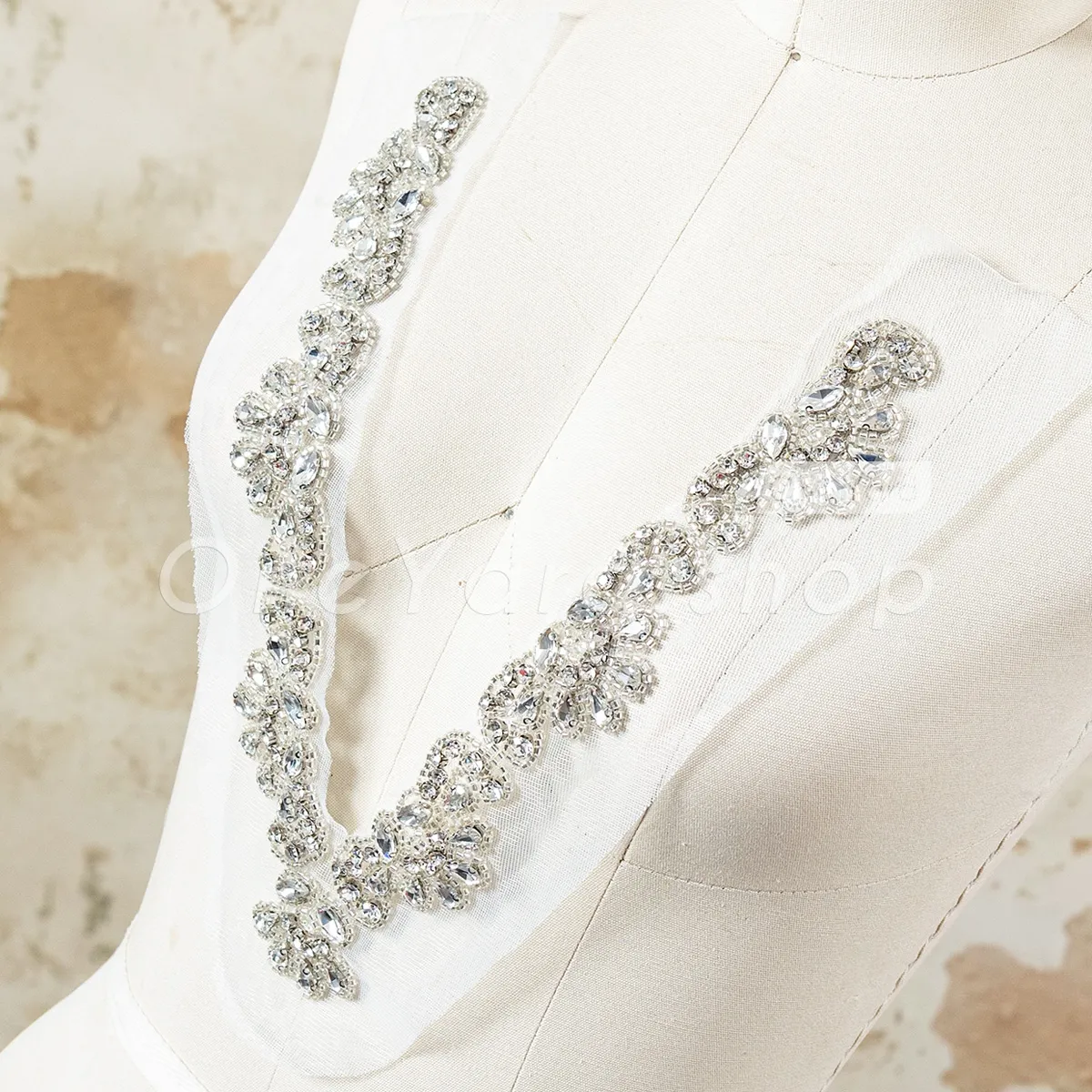 This clear glass rhinestone V-neck bodice applique is a breathtaking embellishment designed to instantly elevate bridal gowns and couture dresses. Featuring a sophisticated arrangement of sparkling gems and delicate beadwork, this piece provides a luxurious, high-end, diamond-like finish. Crafted with high-clarity clear glass rhinestones in various elegant shapes. It's the ultimate choice for adding a glamorous sparkle to wedding dress bodices, illusion necklines, or as a striking detail on bridal veils.