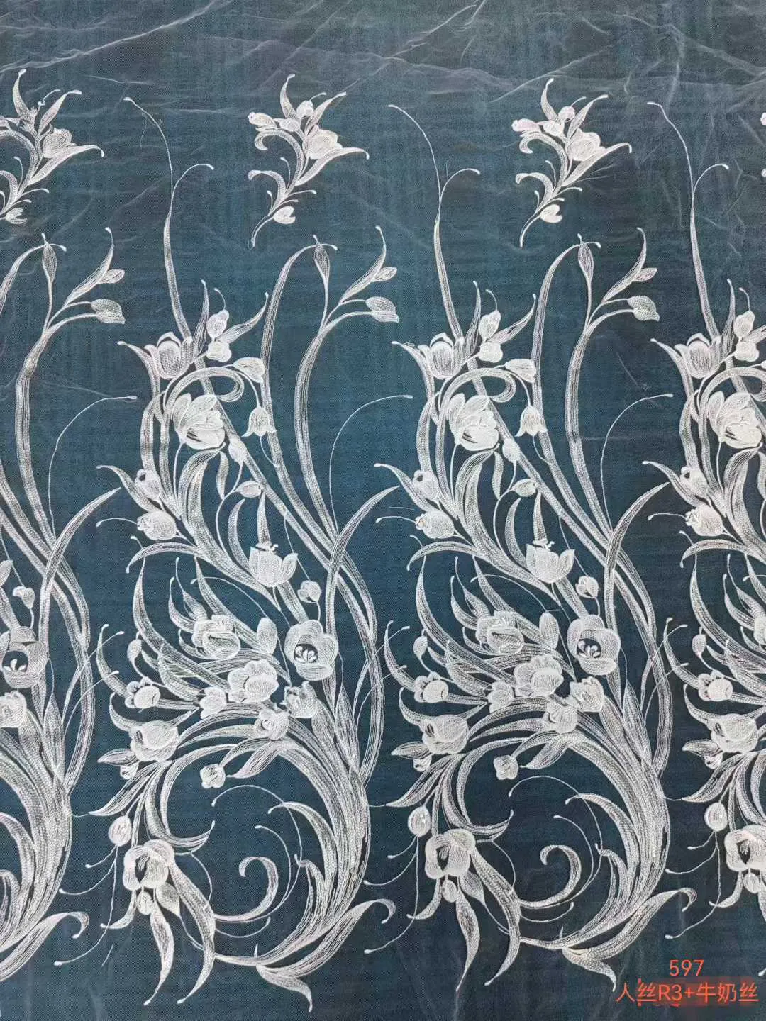 Bring an ethereal, botanical touch to your next design with this elegant embroidered mesh lace. Featuring graceful, elongated climbing vines and delicate bell-shaped floral buds, this fabric offers a stunning vertical visual effect. The intricate embroidery is crafted with soft, lustrous thread on a lightweight sheer mesh base, creating a beautiful flow and elegant drape. Perfect for crafting enchanting woodland bridal gowns, flowing overlay skirts, fairycore dresses, and romantic evening wear.