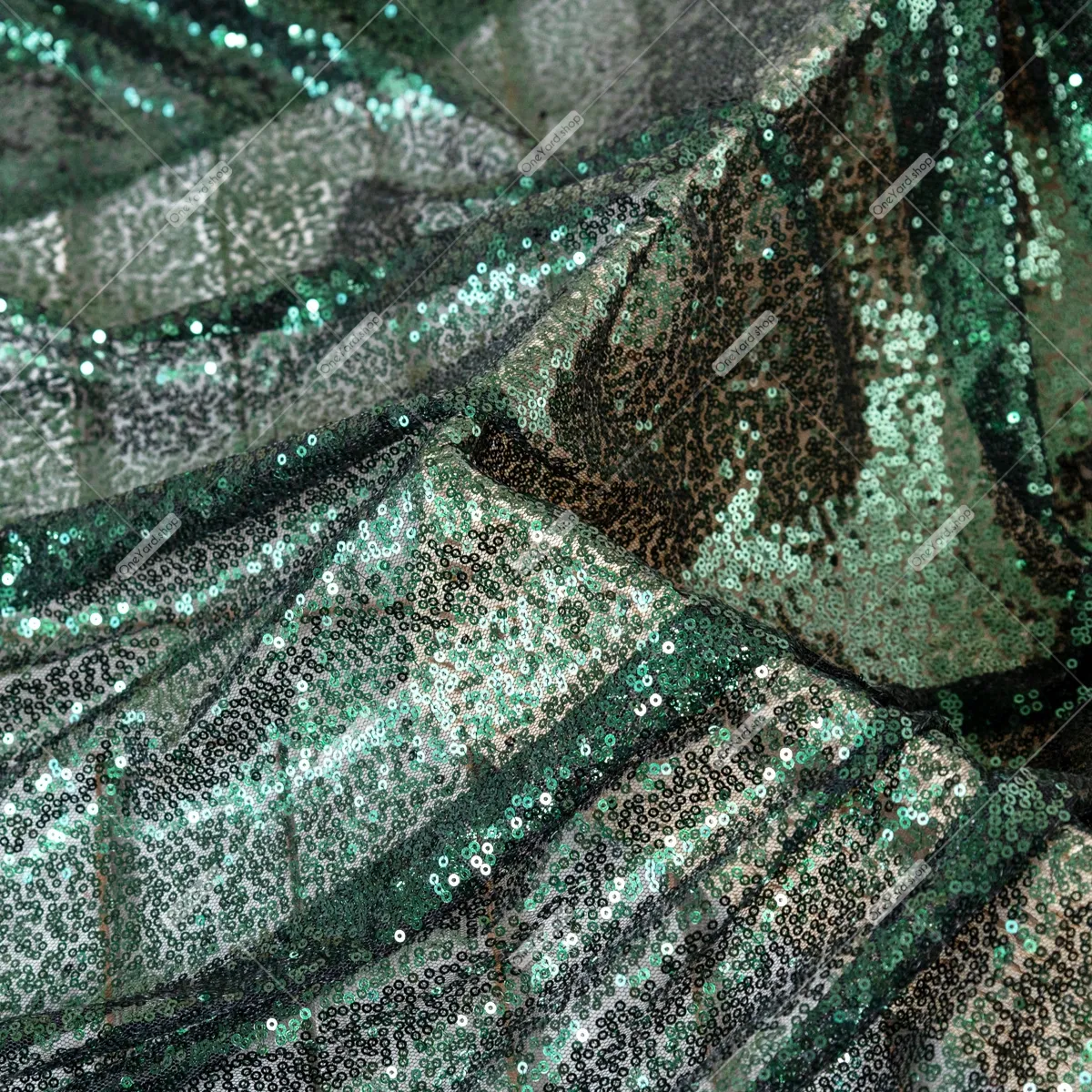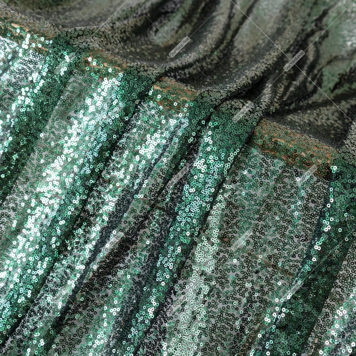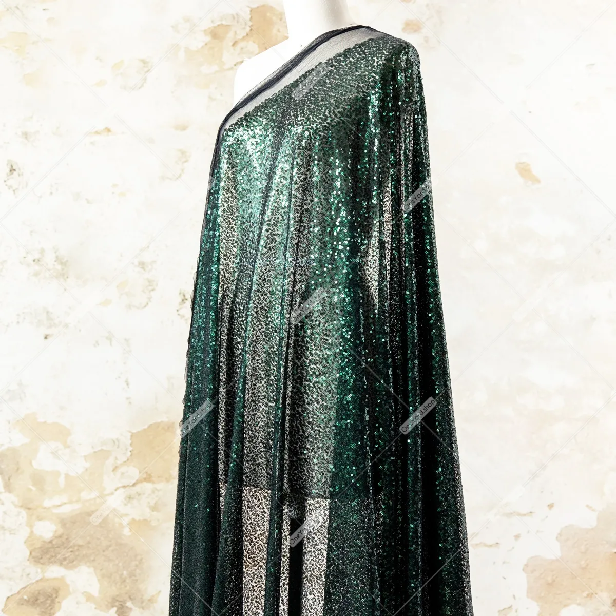 A captivating blend of drama and sparkle, this dark green sequin meticulously stitched onto a sheer black mesh fabric is perfect for creating show-stopping garments and accessories. The deep, rich dark green sequins offer a luxurious and sophisticated feel, while the black mesh provides a striking contrast and adds depth.