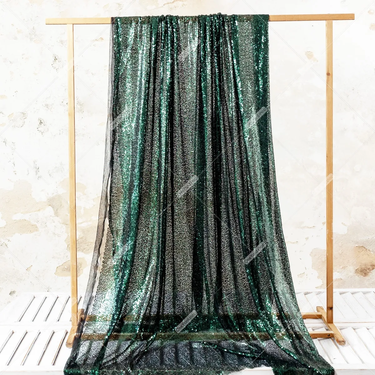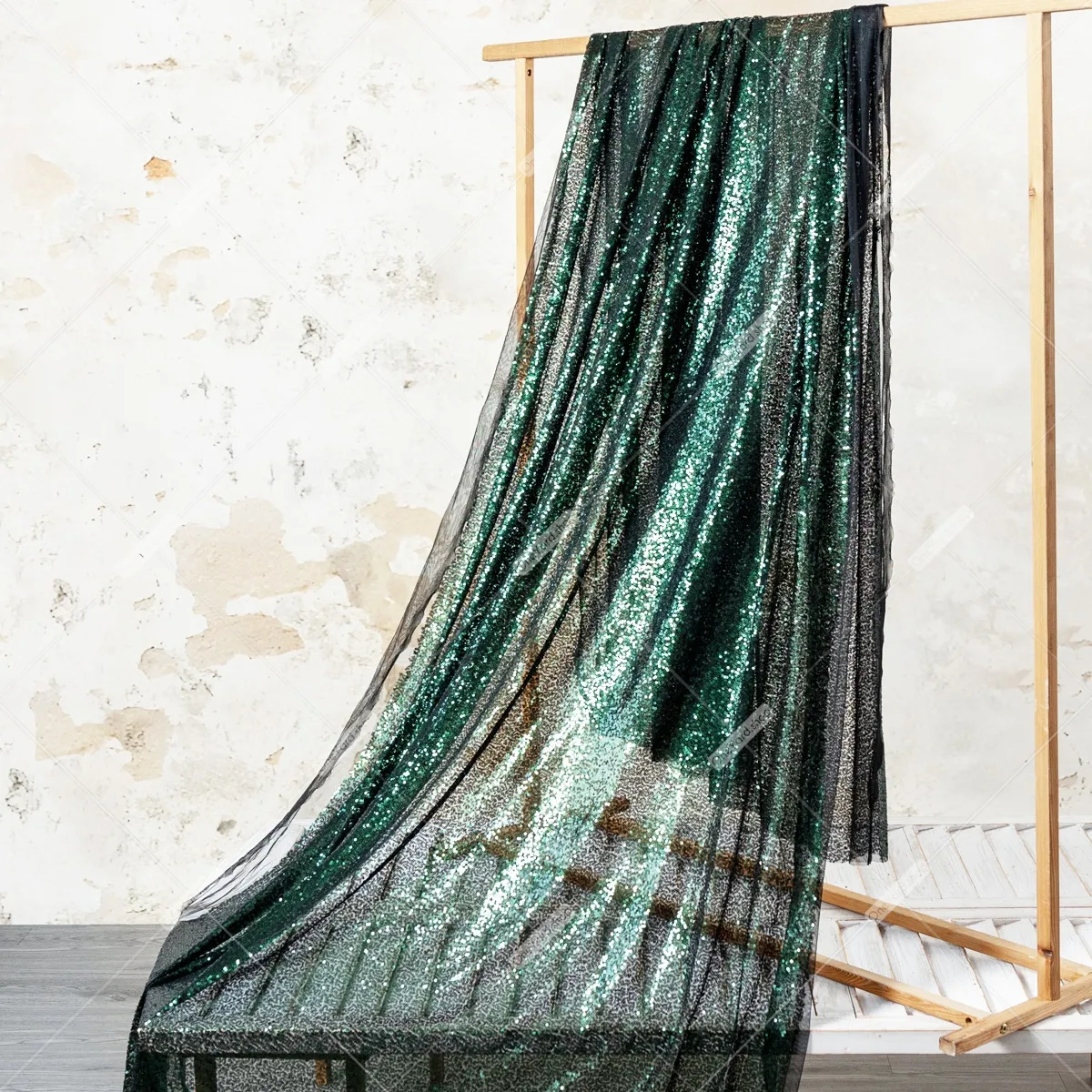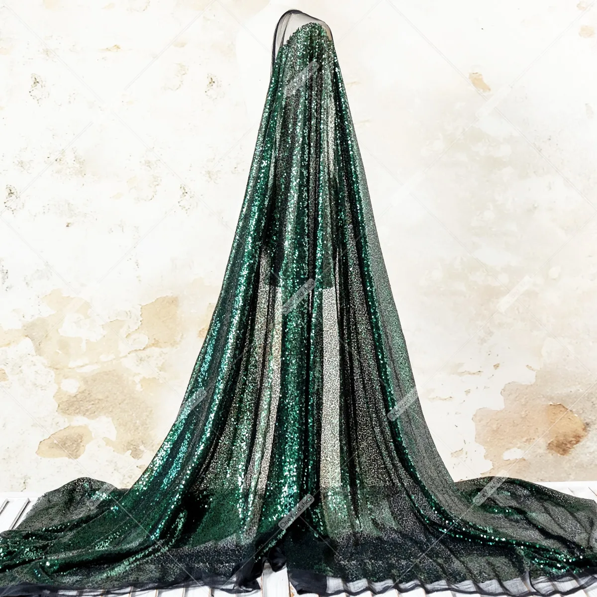 A captivating blend of drama and sparkle, this dark green sequin meticulously stitched onto a sheer black mesh fabric is perfect for creating show-stopping garments and accessories. The deep, rich dark green sequins offer a luxurious and sophisticated feel, while the black mesh provides a striking contrast and adds depth.