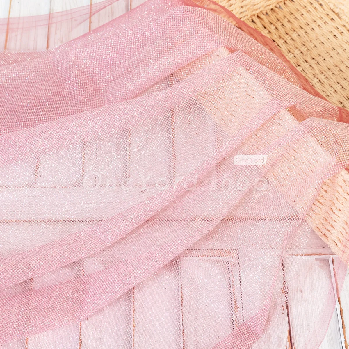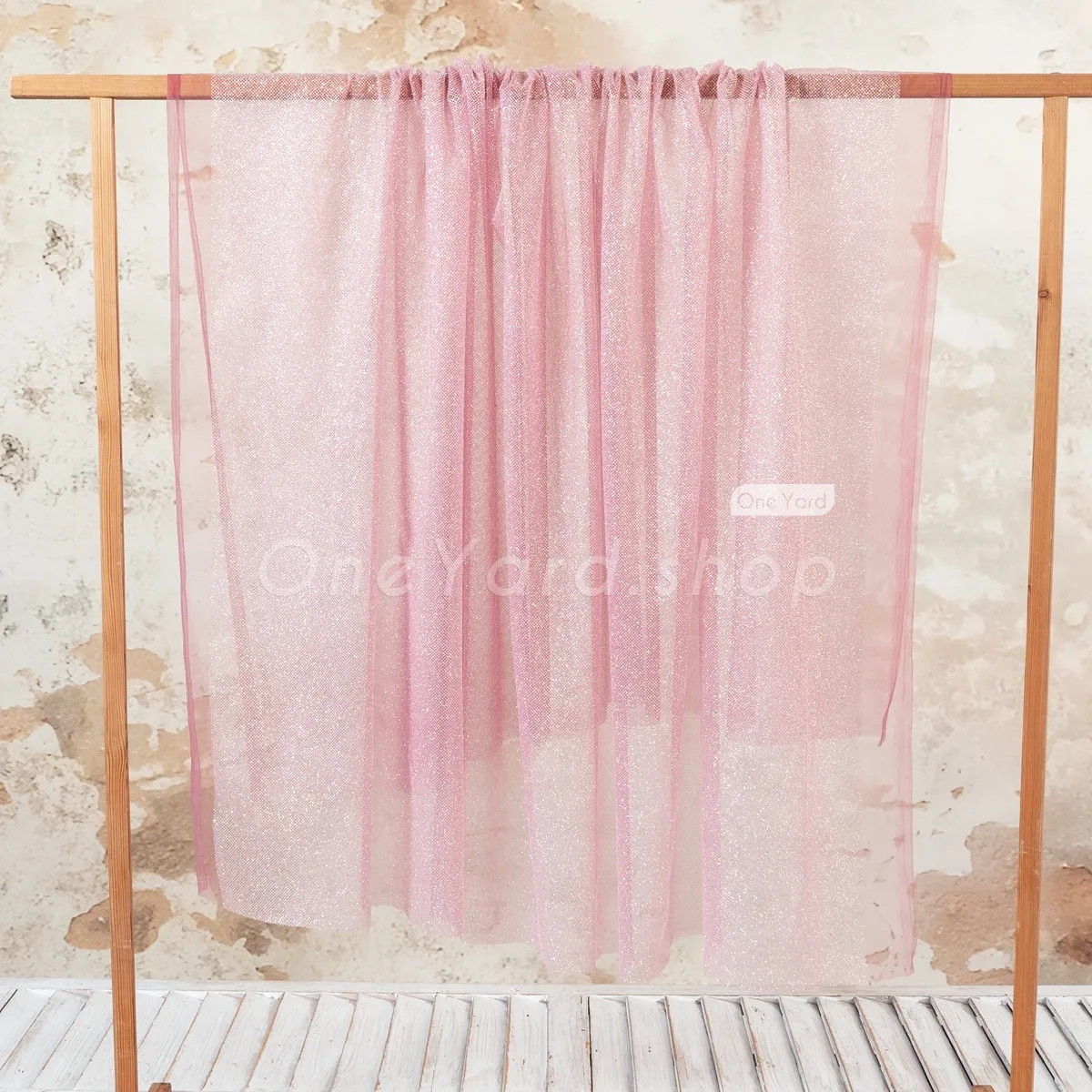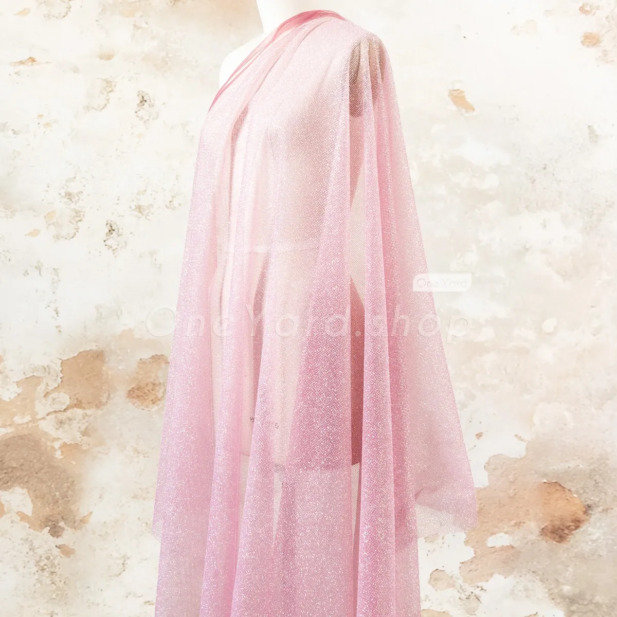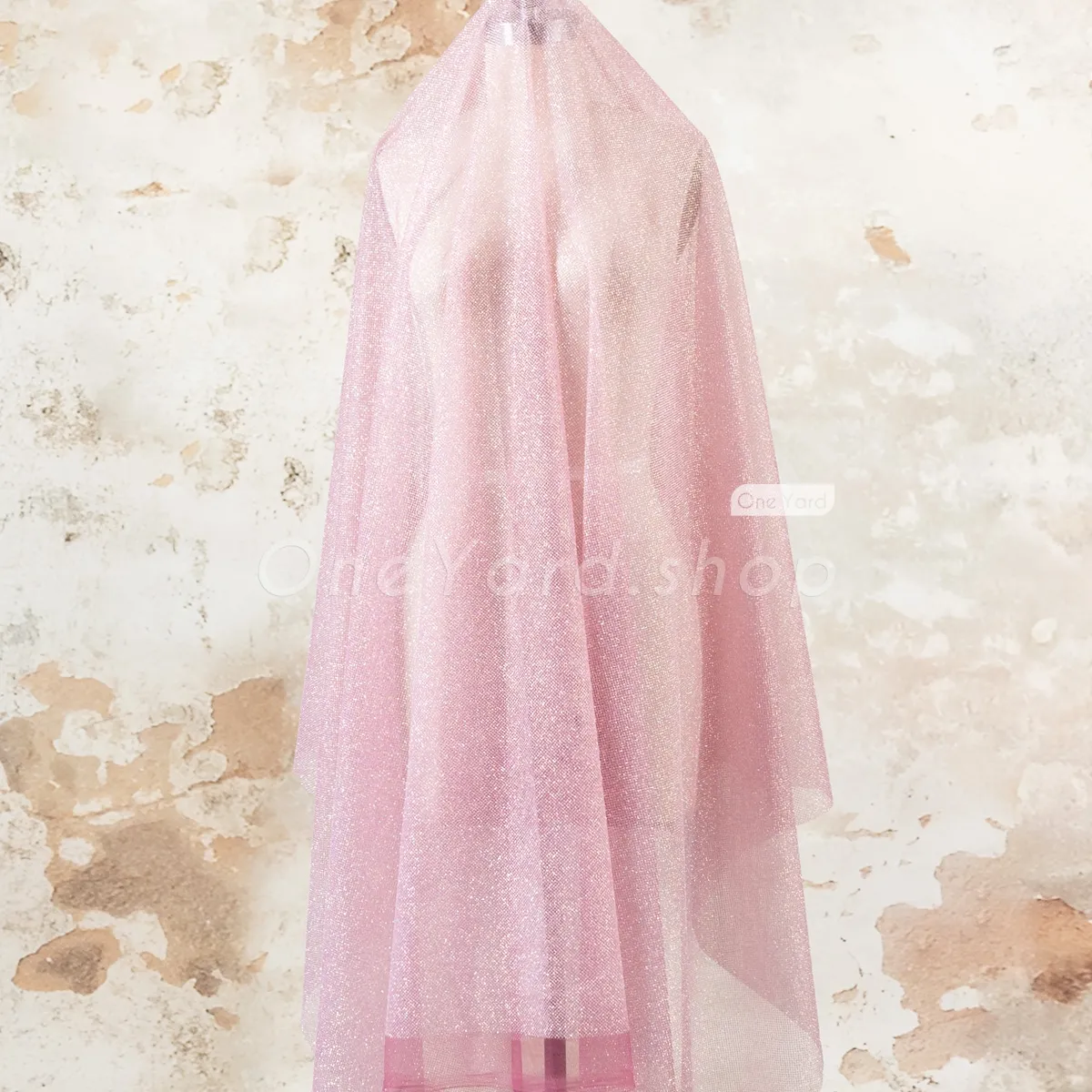 Sparkly glitter tulle fabric in mulberry shade. The metallic mesh material is sheer and lightweight, with the open, netted structure characteristic of tulle. Applied onto the fabric is fine & dense diamond glitter, giving it a delicate sparkle and shimmer when it catches the light. It appears stiff and flexible, suitable for adding a touch of glamour to dresses, costumes, decorations, or craft projects.