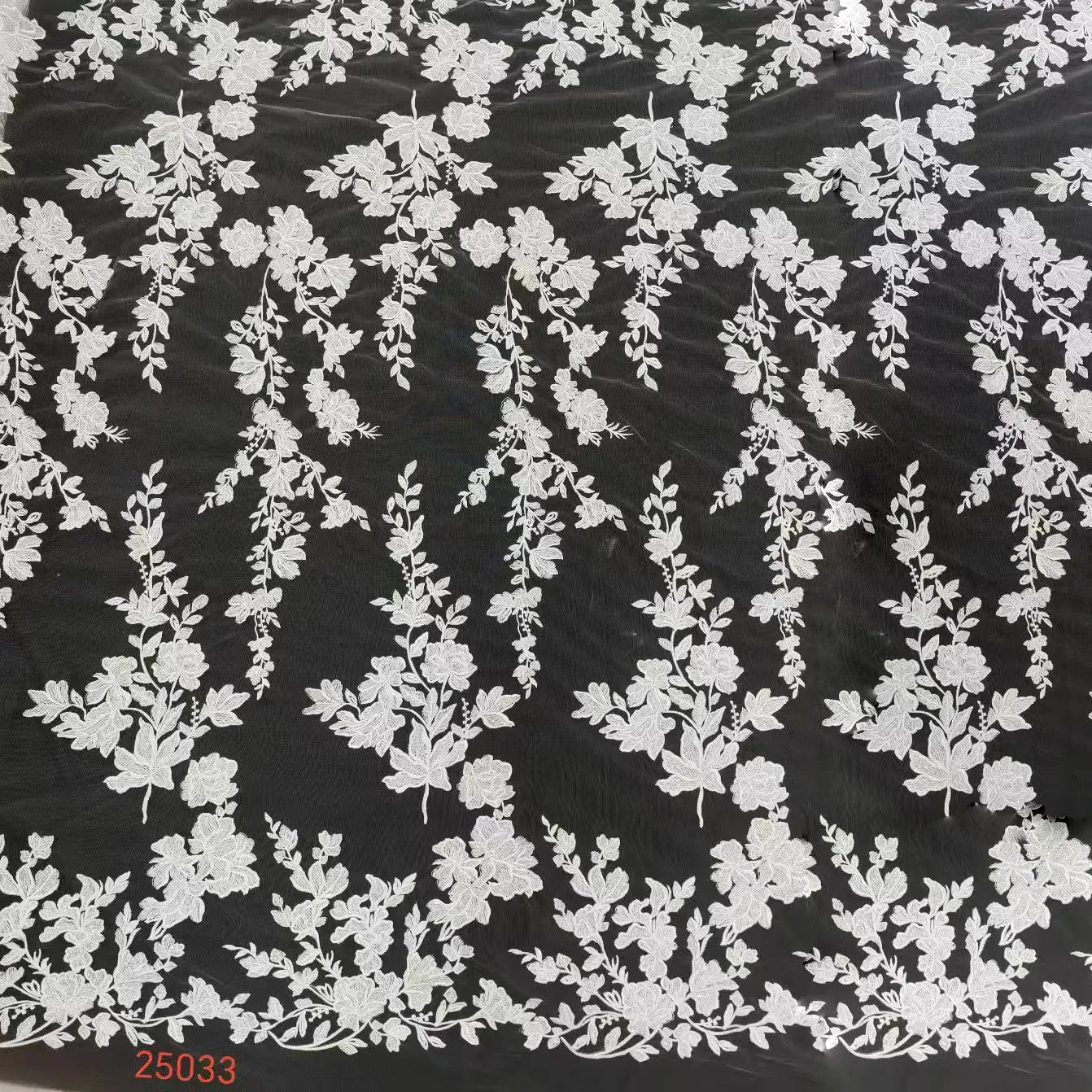 Beautiful, flowing dressmaking lace fabric features cascading floral and leafy vines. The vertical, cascading embroidery pattern makes this lace ideal for a wedding dress skirt, a dramatic veil, or a long, flowing evening gown. It would be perfect for creating an ethereal and graceful effect on any design. Sold by the yard.