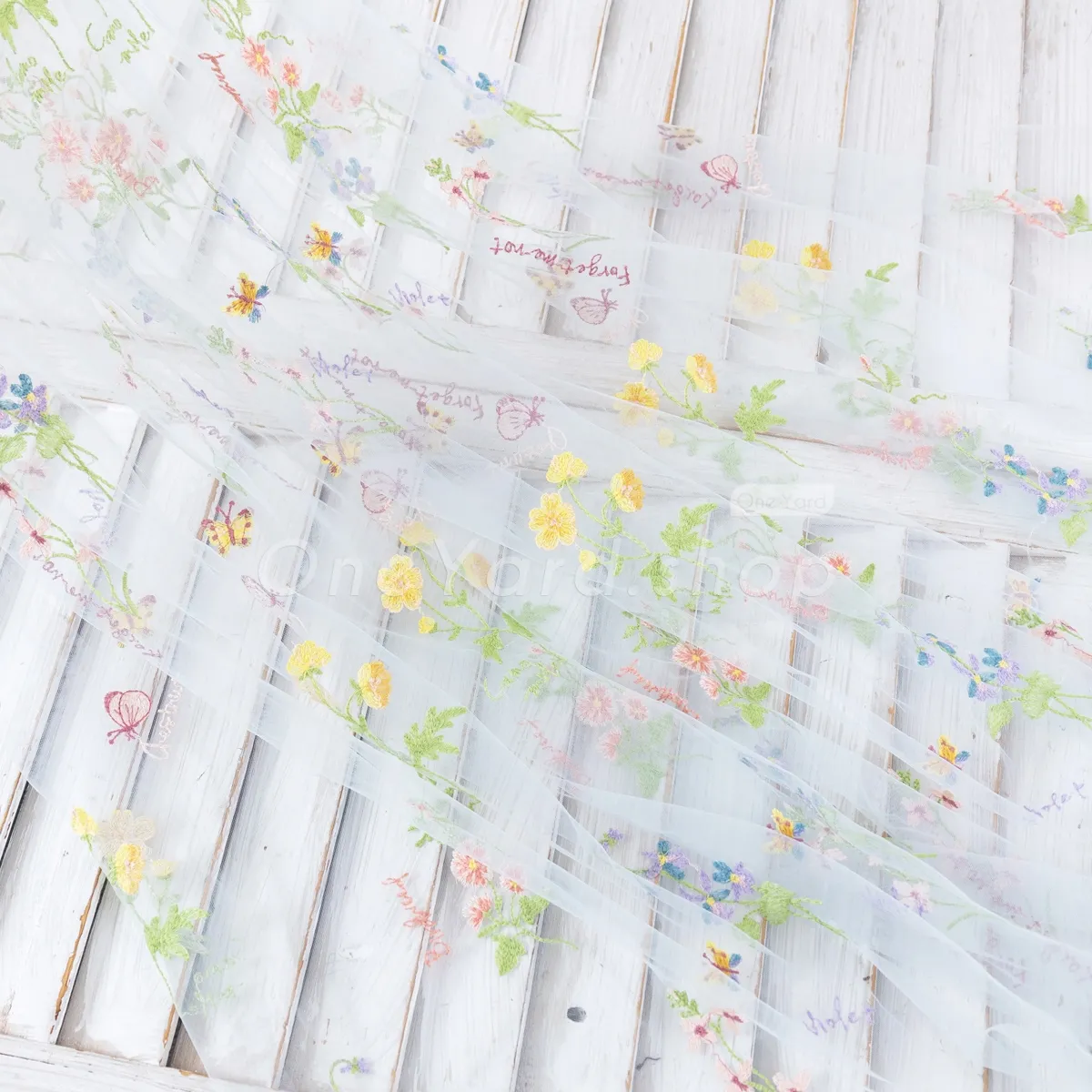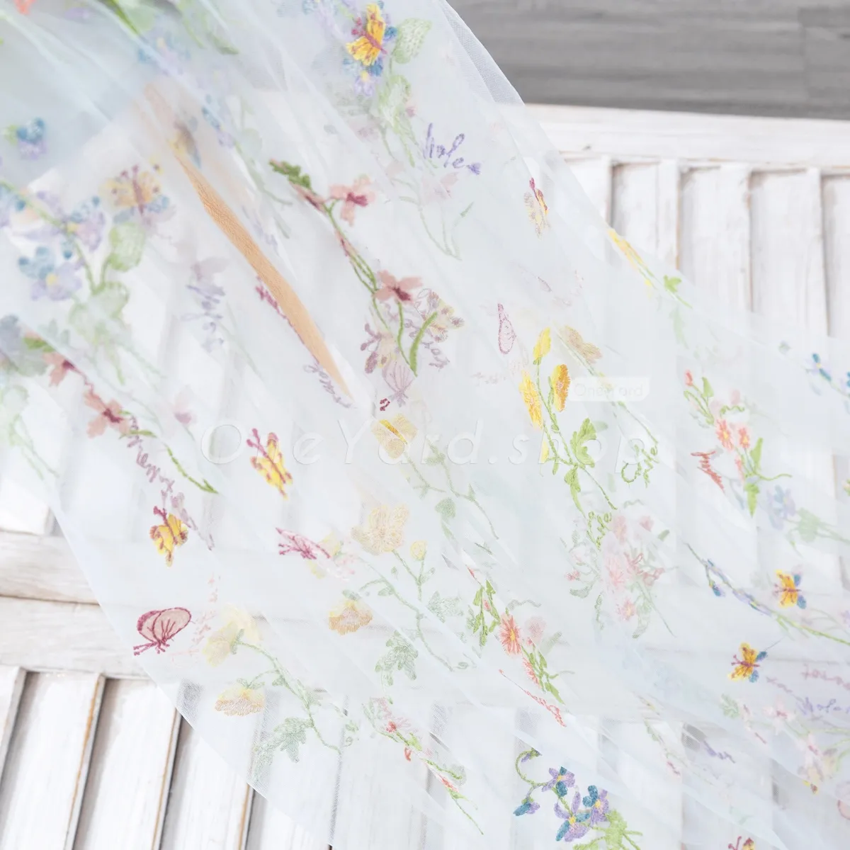 Floral and butterfly embroidered on soft ice-blue tulle mesh fabric sold by the yard. The lovely soft light blue floral embroidery lace material is used for women’s dresses, decorations, hair accessories, handicrafts, and more.