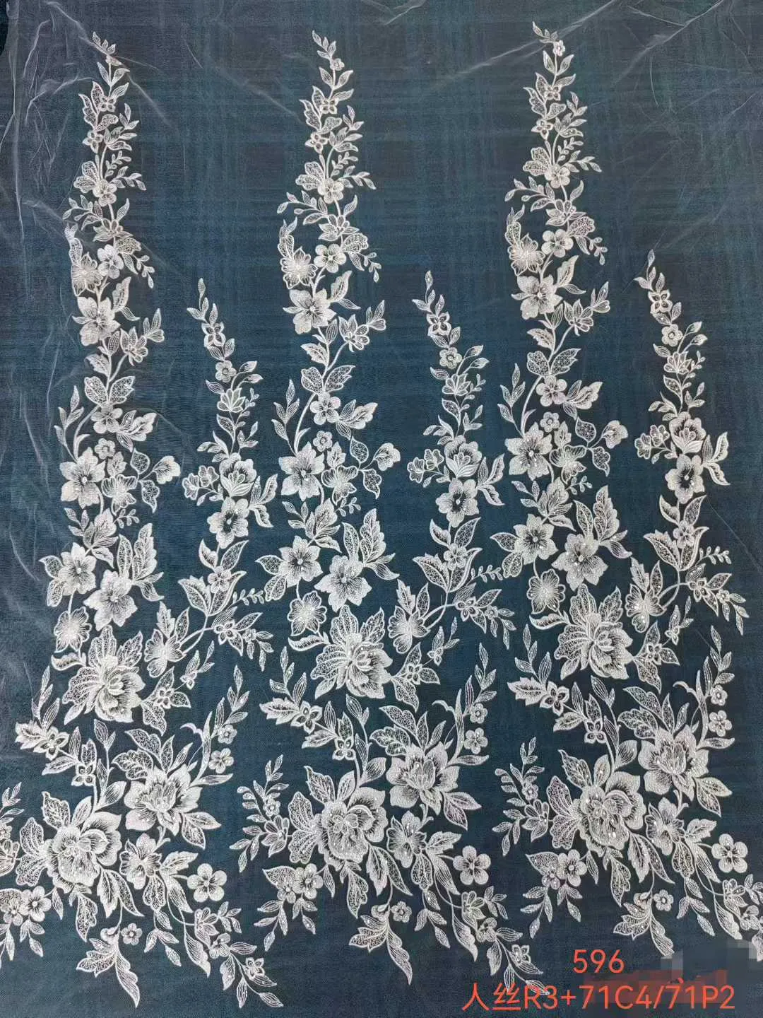 Elevate your couture creations with this embroidered lace fabric. This stunning design features a dense, heavily embroidered floral border at the hem that gracefully transitions into delicate, elongated floral vines climbing upwards across a sheer mesh background. Crafted with lustrous, soft thread, the continuous botanical motifs offer a breathtaking vertical flow and a romantic, ethereal drape. Perfect for crafting majestic bridal gowns, elongating prom silhouettes, and sophisticated fashion overlays.