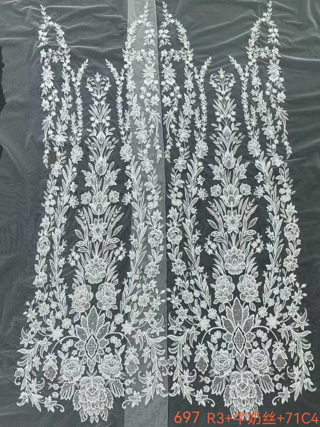 Crafted for the luxury experience, this lace features a unique blend of lustrous rayon thread (R3) and ultra-soft milk silk, providing an elegant, subtle sheen and an incredibly skin-friendly touch. These premium threads are beautifully outlined by prominent 3D cording to create a striking textured relief effect. The continuous layout is defined by majestic, highly symmetrical vertical floral pillars. The botanical vines climb elegantly upwards, creating a powerfully elongated and structural silhouette.