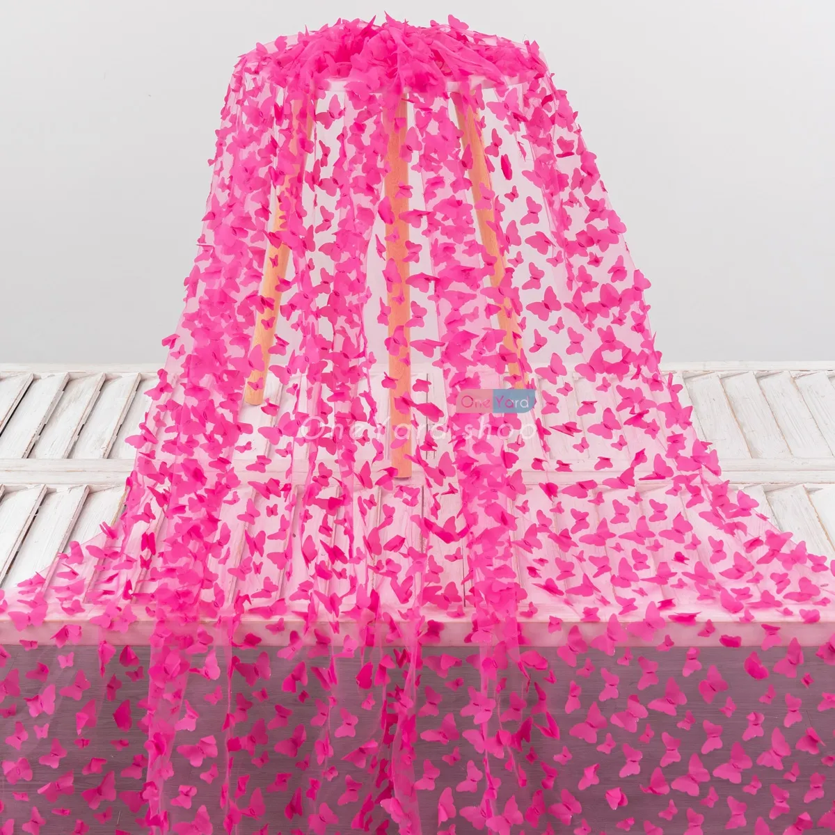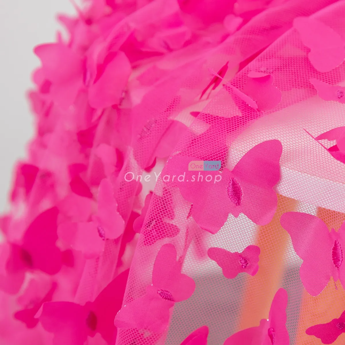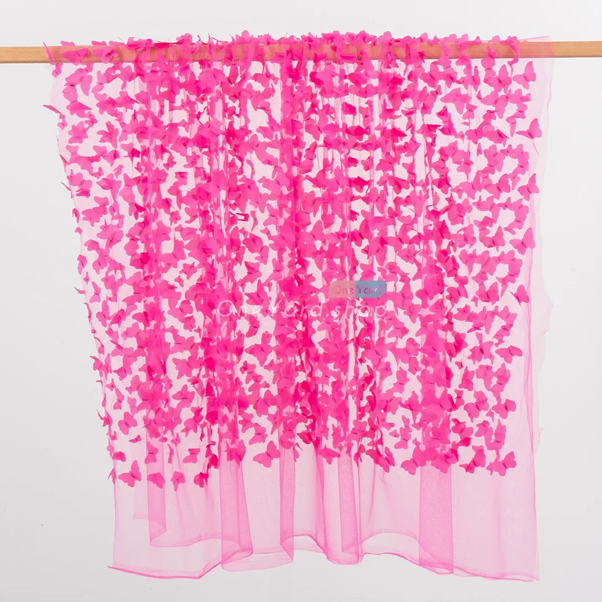 Eye-catching fuchsia embroidered 3D butterflies create a fashion fabric design with a vibrant feel. Perfect for curtains, photoshoot dresses, party decor, etc. in the modern country home.