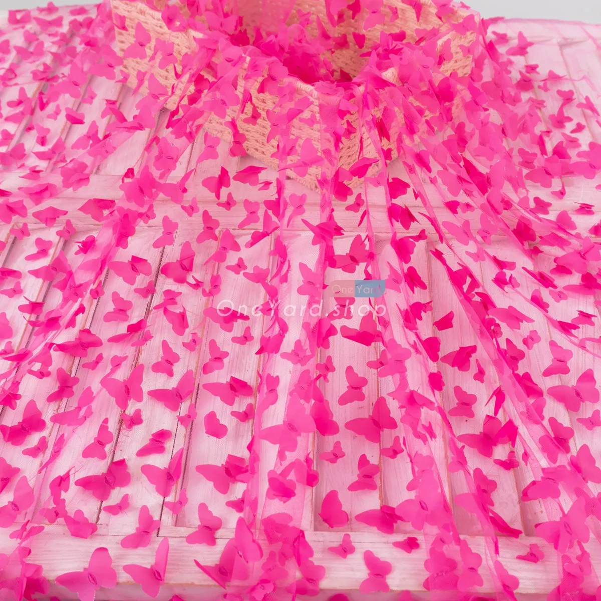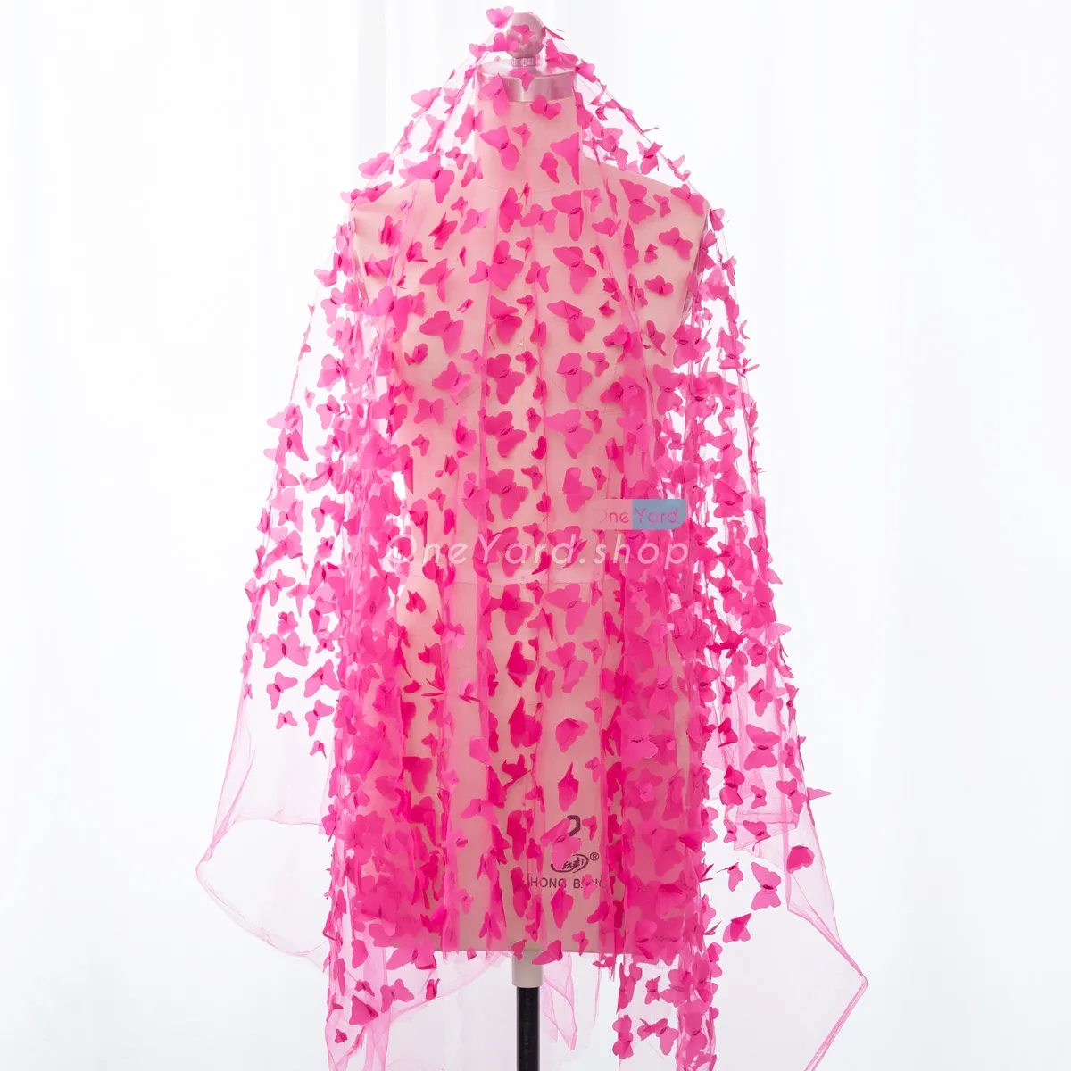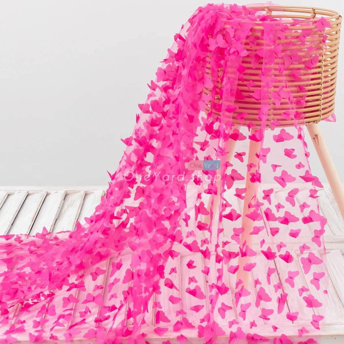 Eye-catching fuchsia embroidered 3D butterflies create a fashion fabric design with a vibrant feel. Perfect for curtains, photoshoot dresses, party decor, etc. in the modern country home.