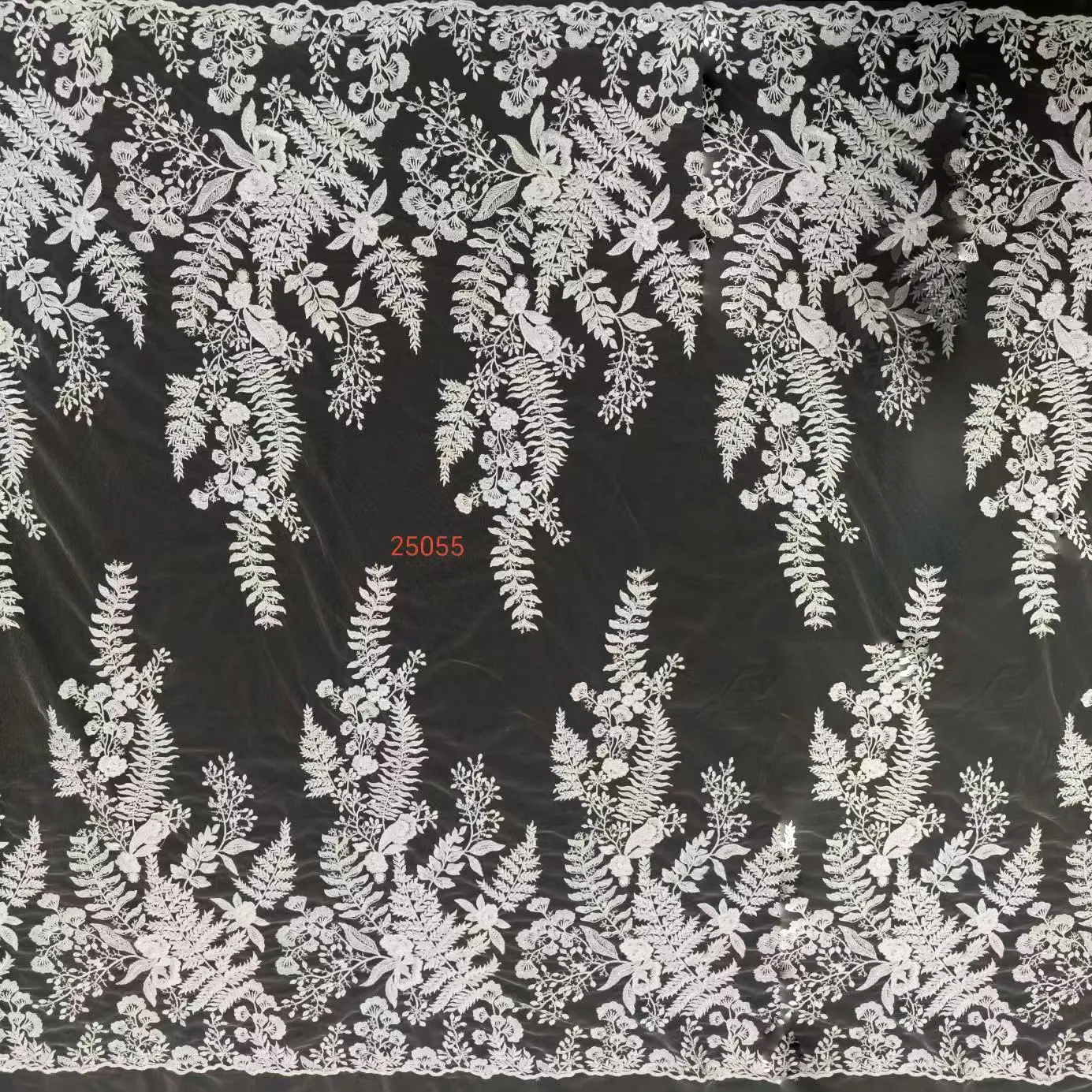 This lightweight, transparency embroidery lace fabric showcases cascading fern leaves, delicate blossoms, and leafy vines arranged in elegant vertical trails, giving the lace a natural, garden-inspired aesthetic. The borders are richly adorned with dense floral motifs, creating a beautiful scalloped edge that enhances the overall sophistication of the fabric. Ideal for creating wedding gowns, veils, evening dresses, overlays, or decorative accents.