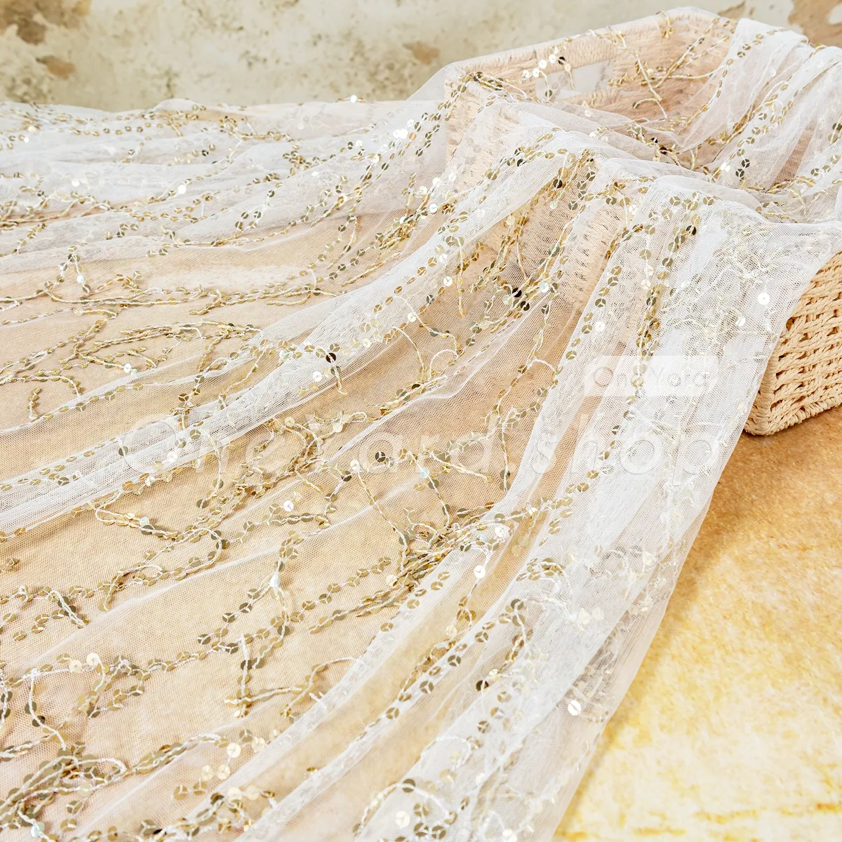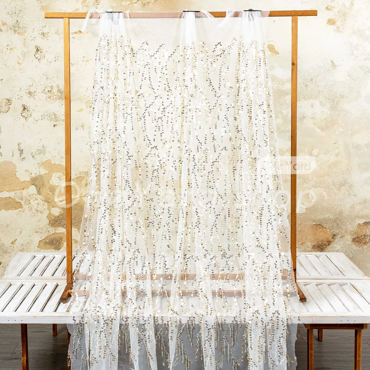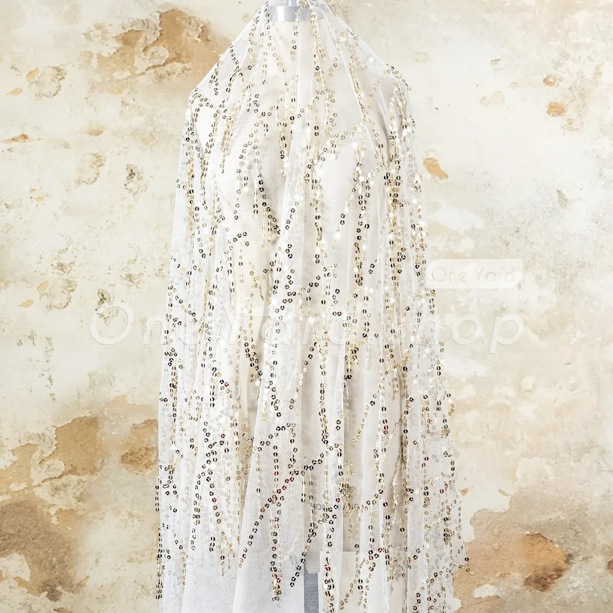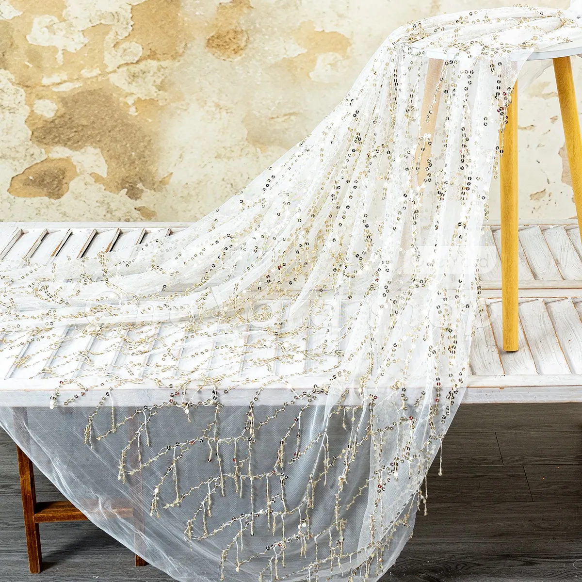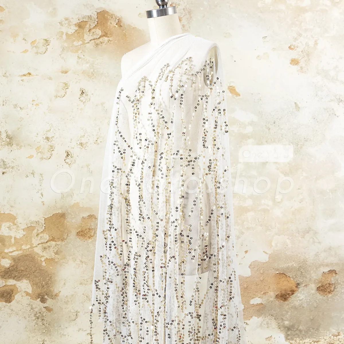 Gold and White Drip Sequined Hanging Fringe Mesh Fabric