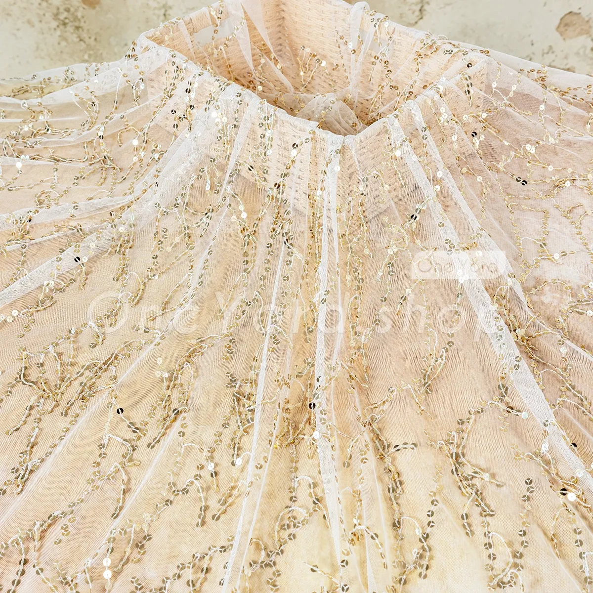 This dazzling gold and white fringe sequined mesh fabric offers a sophisticated, high-contrast design that is ideal for creating elegant evening attire and luxurious event decor. The 7mm champagne gold sequins are arranged in flowing, hanging fringe patterns, providing exceptional movement and a 'drip' effect. Despite the detailed sequin work, the white mesh base allows the fabric to maintain a soft, graceful drape that flows effortlessly over silhouettes.