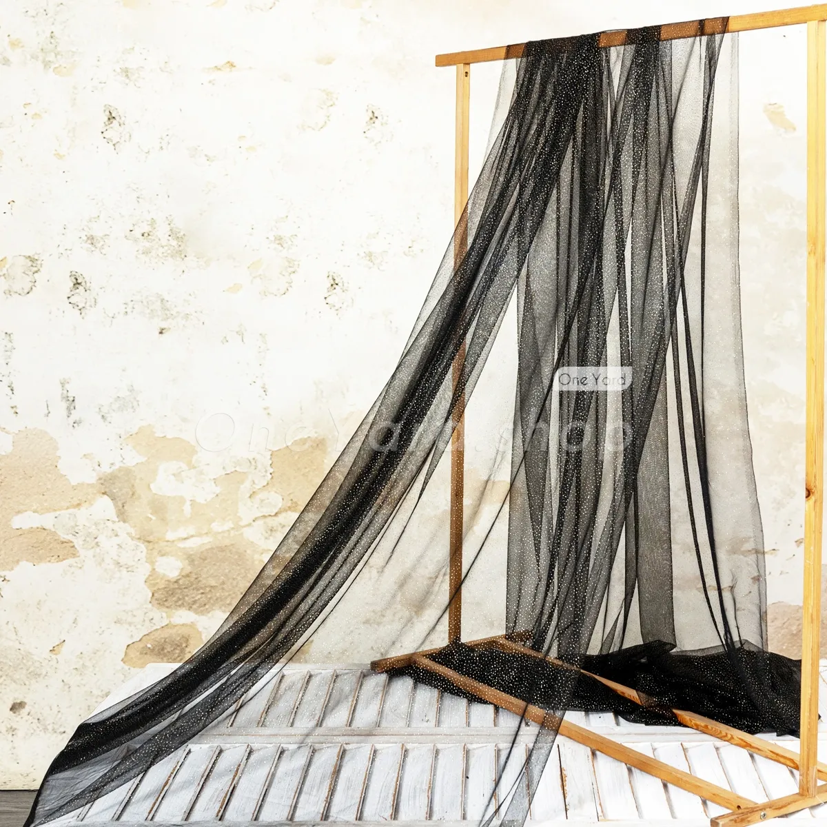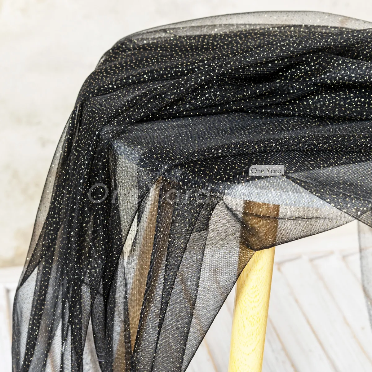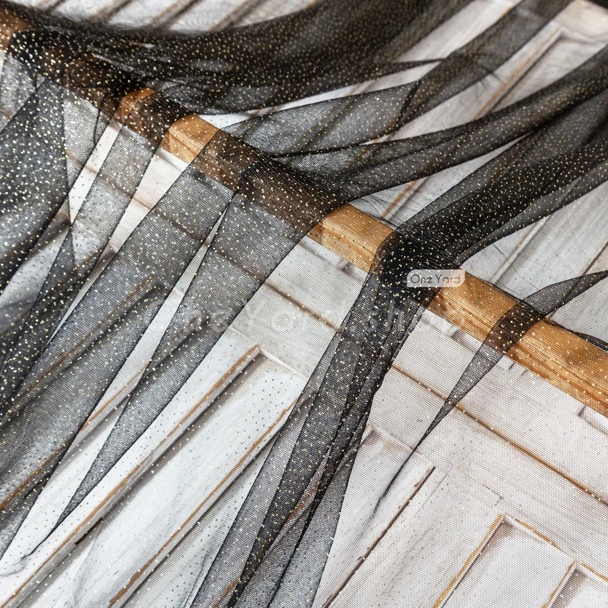 Elevate your creations with the stunning black soft tulle featuring a lavish gold glitter embellishment. This lightweight black mesh fabric offers a delicate transparency, allowing the golden sparkle to truly pop. Ideal for crafting elegant evening gowns, whimsical skirts, captivating veils, or dazzling event décor, it promises to add a luxurious and radiant touch to any project.