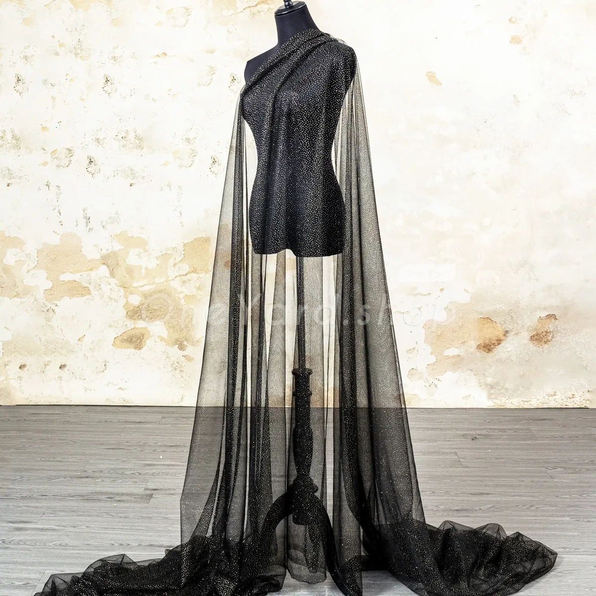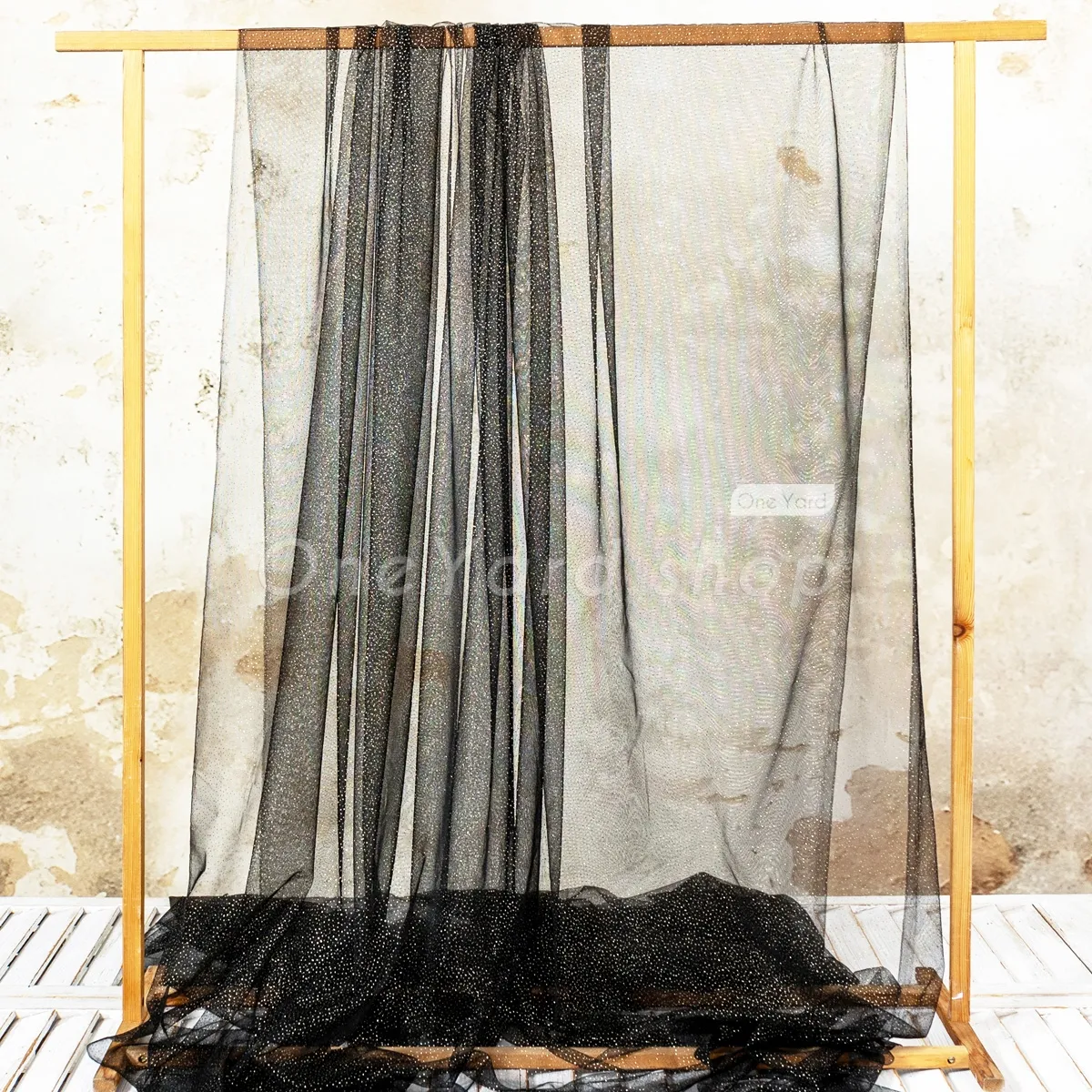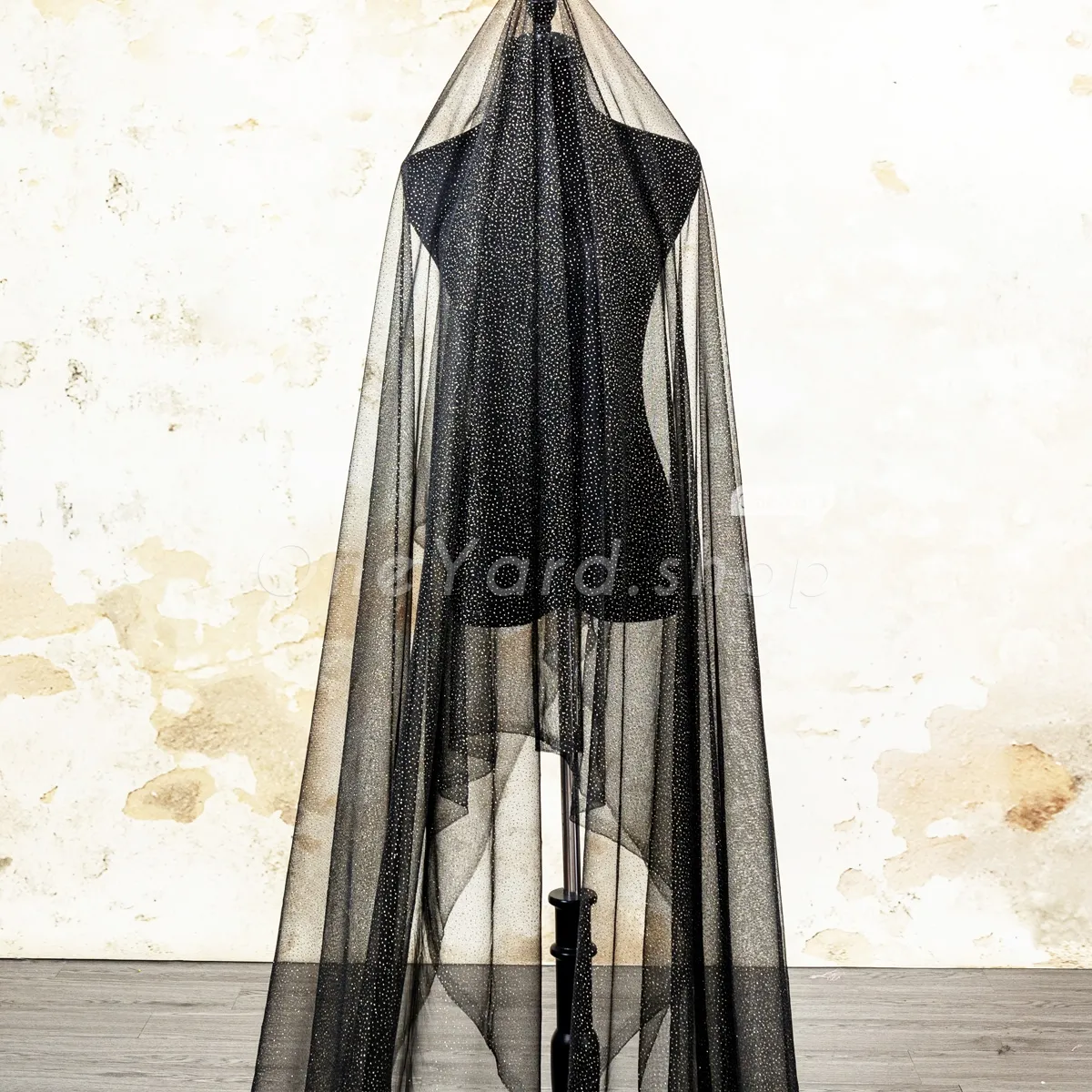 Elevate your creations with the stunning black soft tulle featuring a lavish gold glitter embellishment. This lightweight black mesh fabric offers a delicate transparency, allowing the golden sparkle to truly pop. Ideal for crafting elegant evening gowns, whimsical skirts, captivating veils, or dazzling event décor, it promises to add a luxurious and radiant touch to any project.