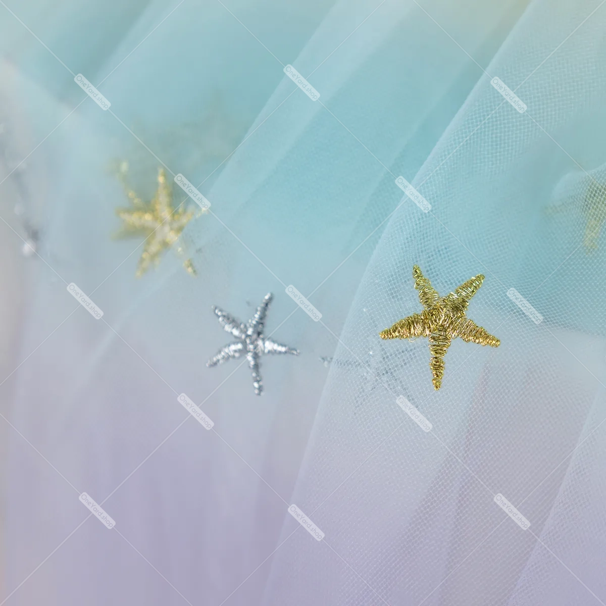 Gold & silver thread stars embroidered ombre color soft tulle mesh fabric for sale by the yard. Illusion sheer soft ombre mesh material for making puff dresses, party decor, and craft projects.