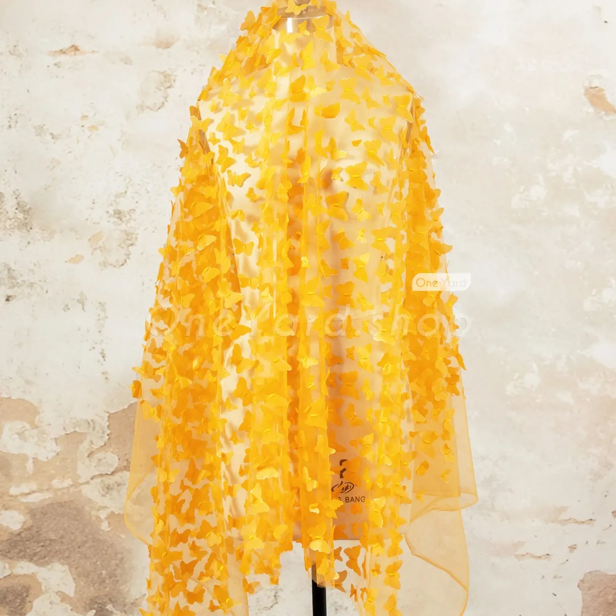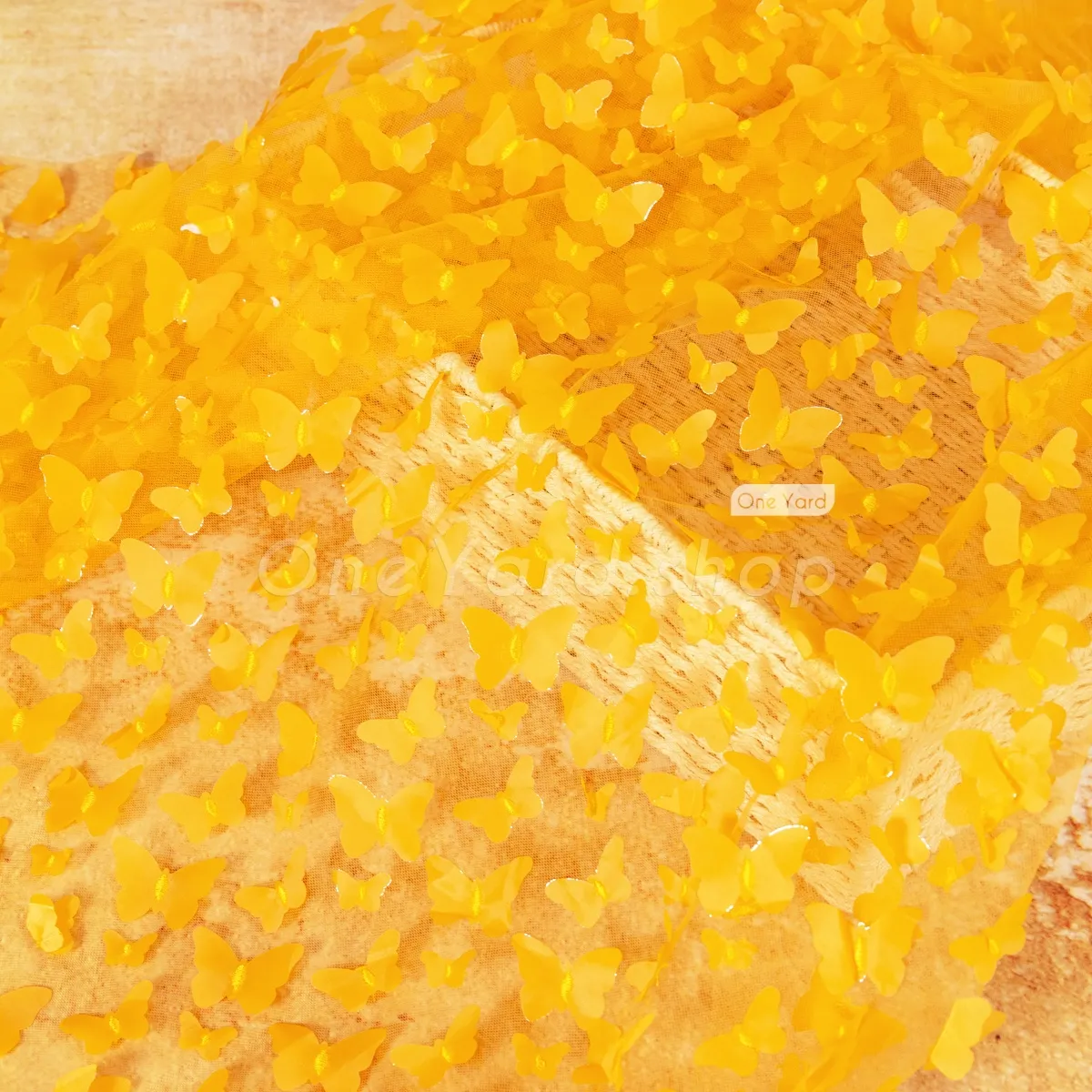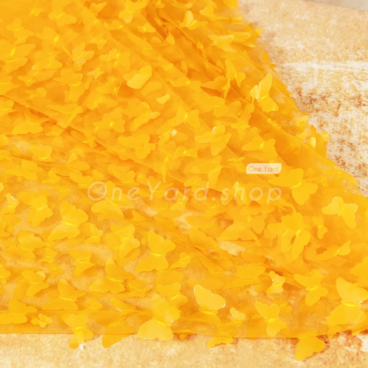 This fabric is a lightweight, butterfly embroidery material in a vibrant golden yellow hue. It is heavily embellished with numerous three-dimensional butterfly appliqués, creating a dense, textured, and whimsical effect. The butterflies appear to be scattered across the fabric, giving it a playful and dimensional quality. This type of fabric would be well-suited for overlays on dresses, skirts, special occasion garments, costumes, or decorative purposes where a delicate and eye-catching look is desired.