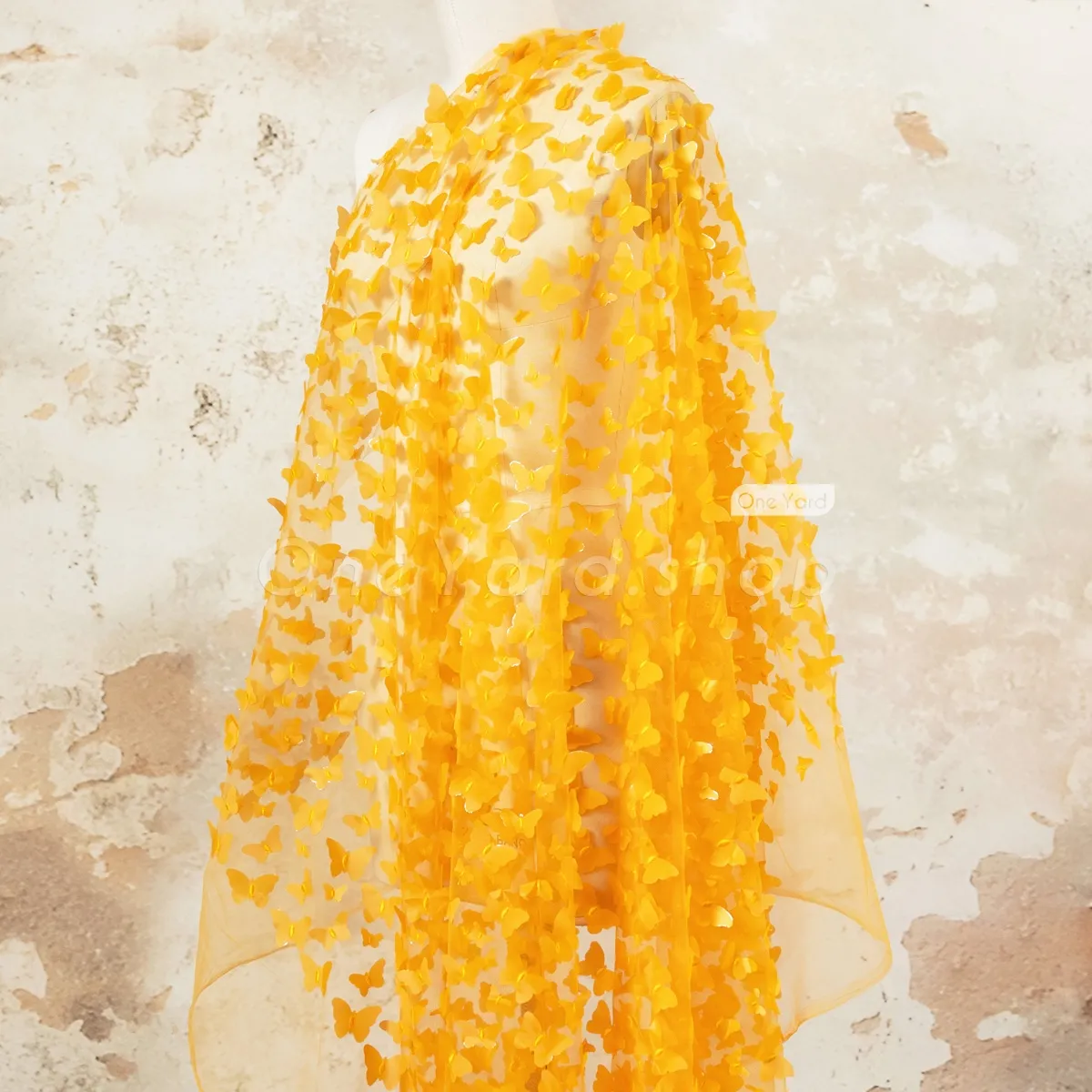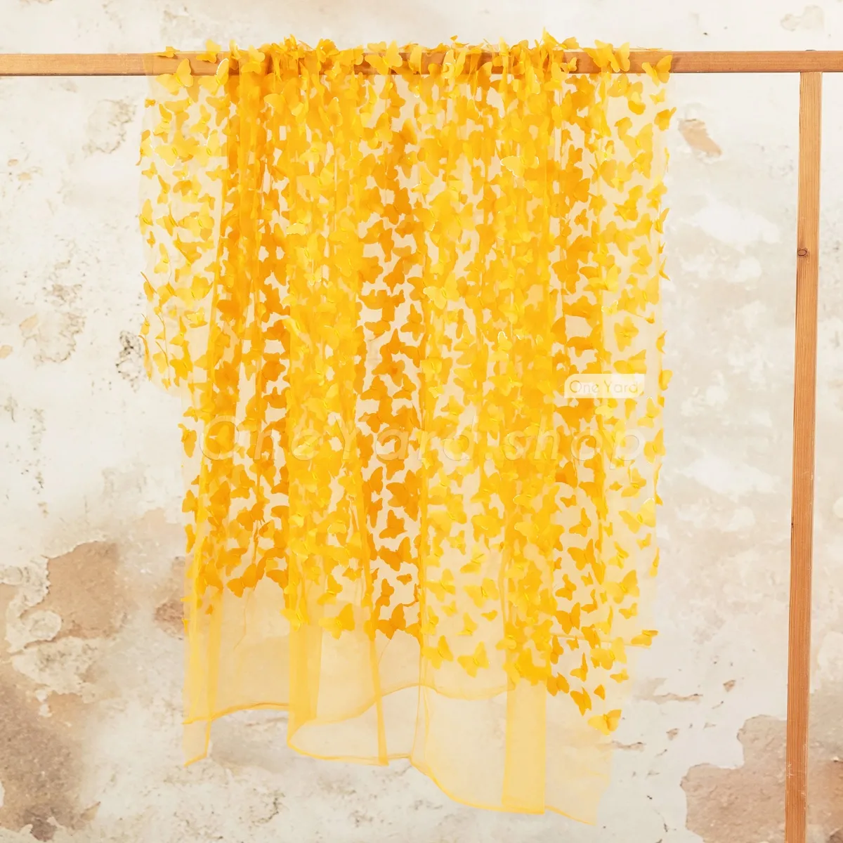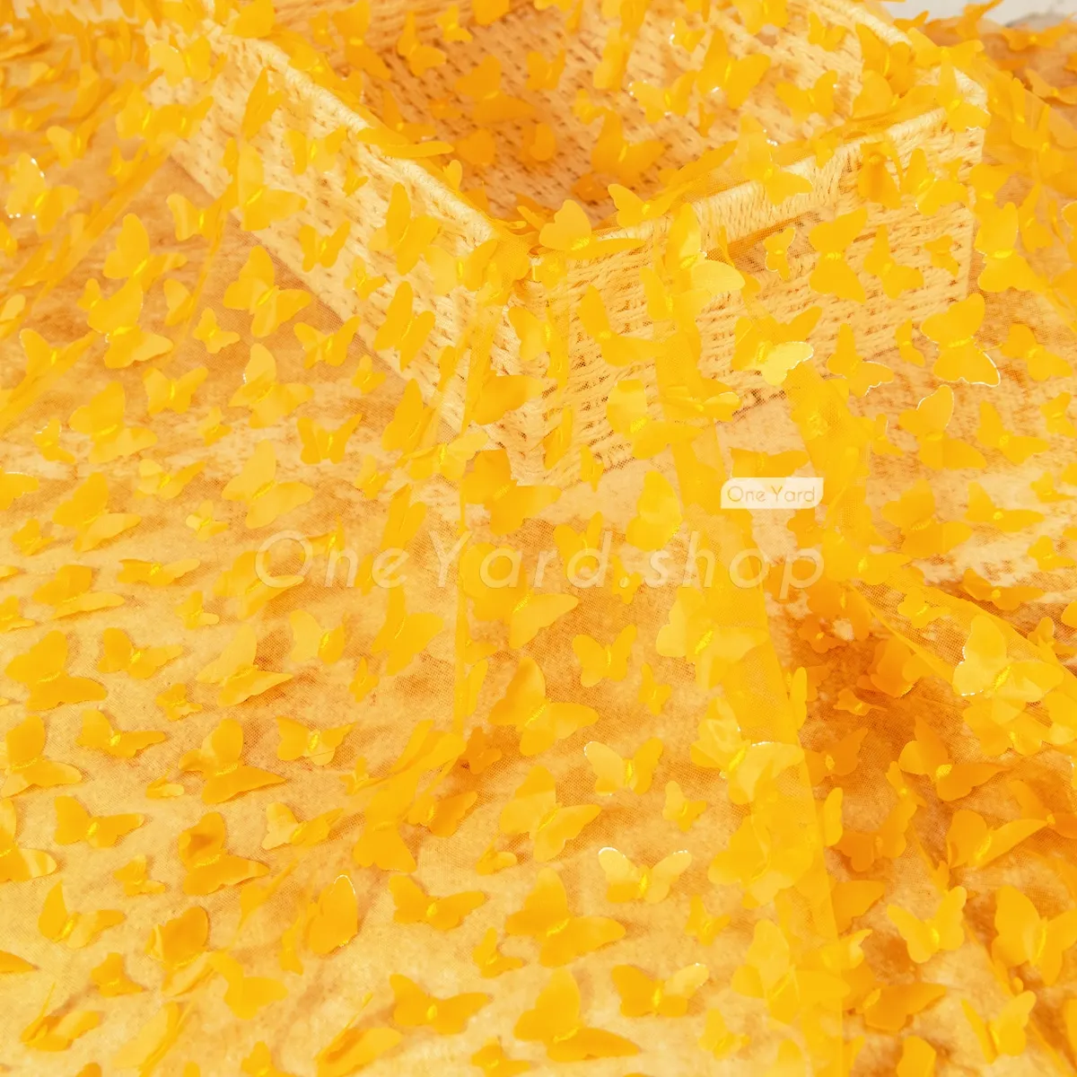 This fabric is a lightweight, butterfly embroidery material in a vibrant golden yellow hue. It is heavily embellished with numerous three-dimensional butterfly appliqués, creating a dense, textured, and whimsical effect. The butterflies appear to be scattered across the fabric, giving it a playful and dimensional quality. This type of fabric would be well-suited for overlays on dresses, skirts, special occasion garments, costumes, or decorative purposes where a delicate and eye-catching look is desired.