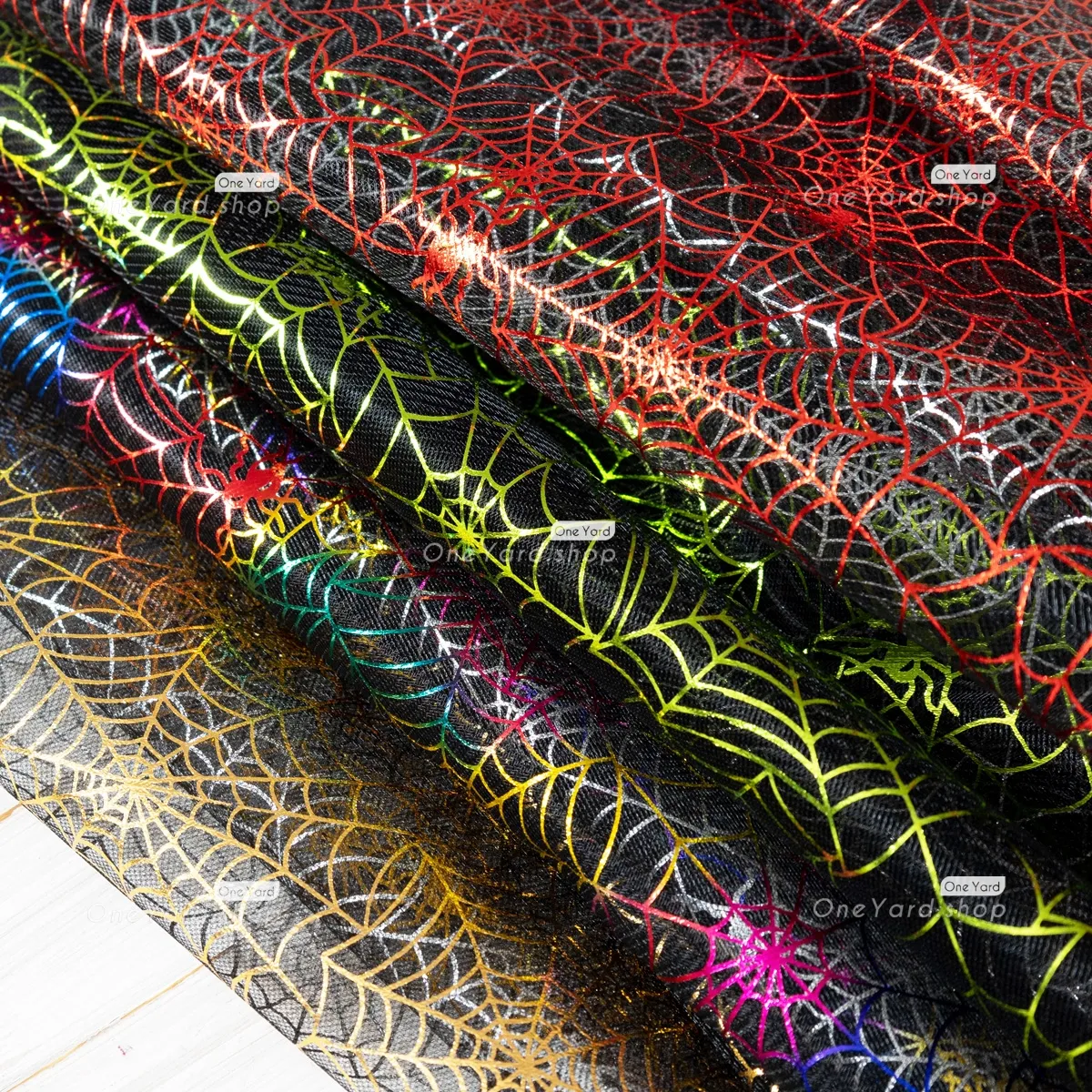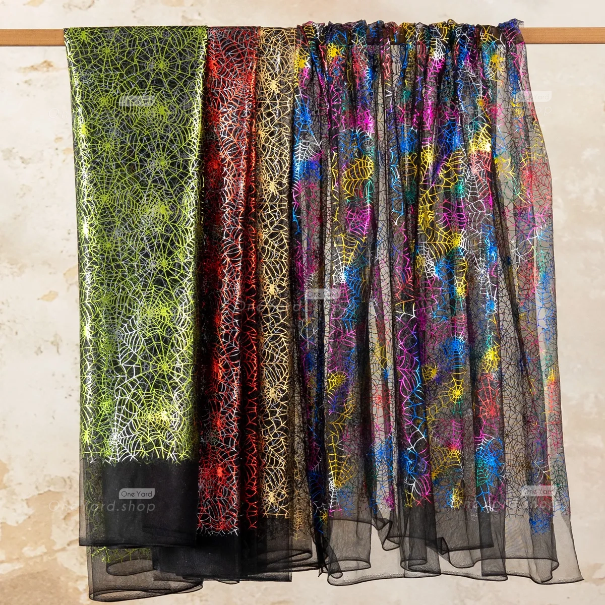This Halloween spider-web foil printed lightweight decorative mesh fabric is the perfect addition to your spooky decor and costumes. Featuring intricate spider-web patterns on a sheer black mesh, this fabric is both eerie and shiny. Ideal for creating haunting tablecloths, eerie curtains, or adding a chilling touch to costumes and party decorations. Transform any space into a creepy, captivating Halloween setting with this spider-web mesh fabric.