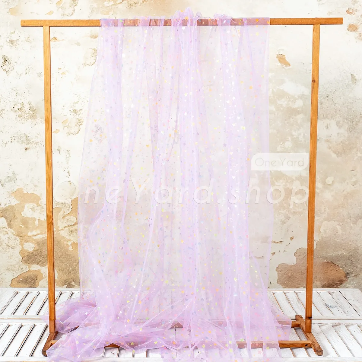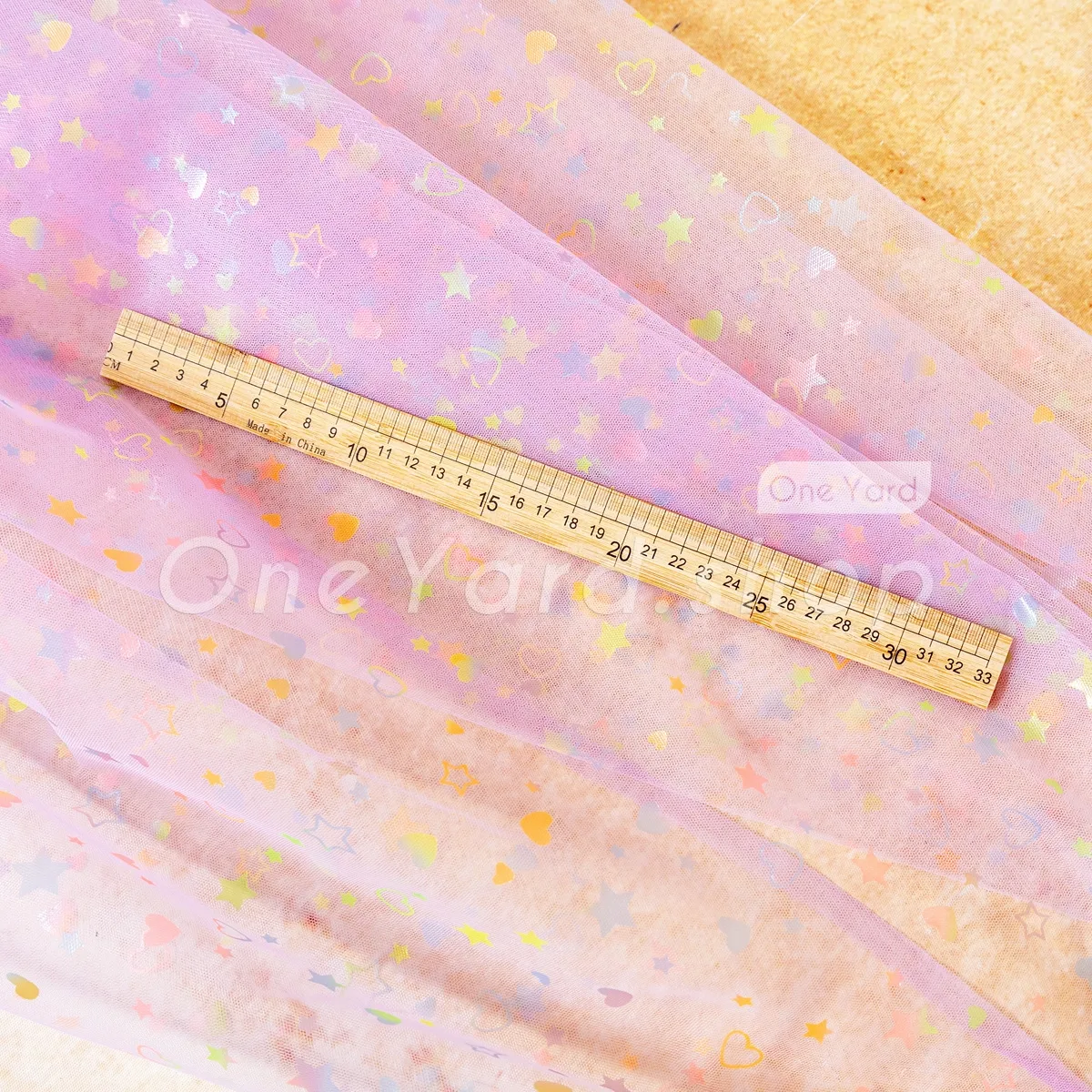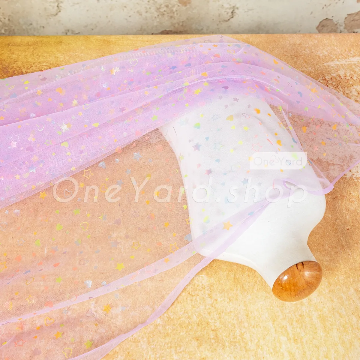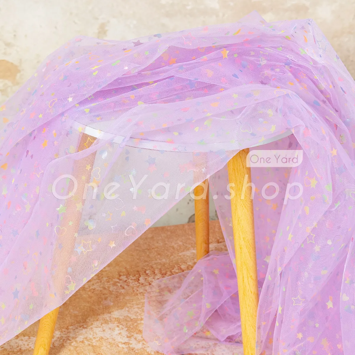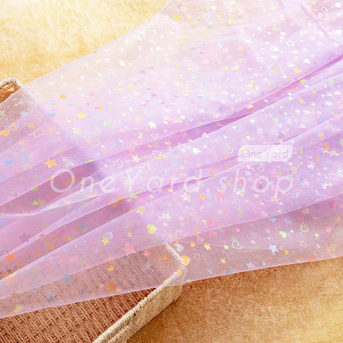 This multi-color heart and star printed lilac mesh tulle fabric is a dreamlike material designed to add a playful, celestial touch to children's apparel and festive décor. Printed with a charming mix of hearts, stars, and crescent moons, the motifs reflect a rainbow of colors, including mint, pink, yellow, and blue. Suitable for crafting one-of-a-kind hair bows, headbands, and decorative gift wrapping.