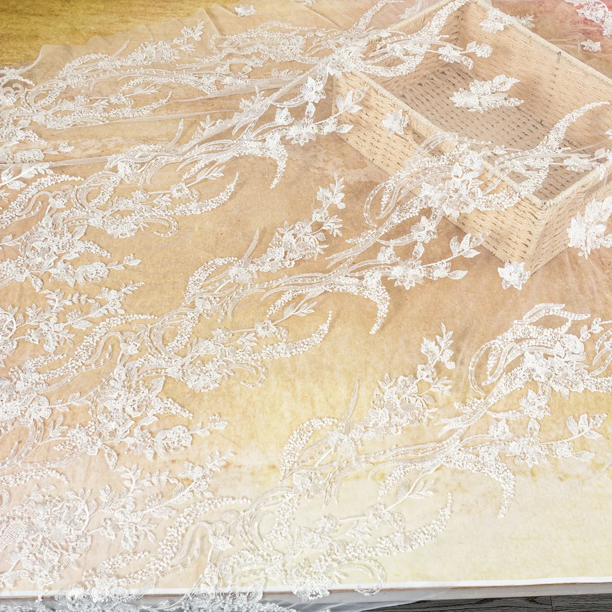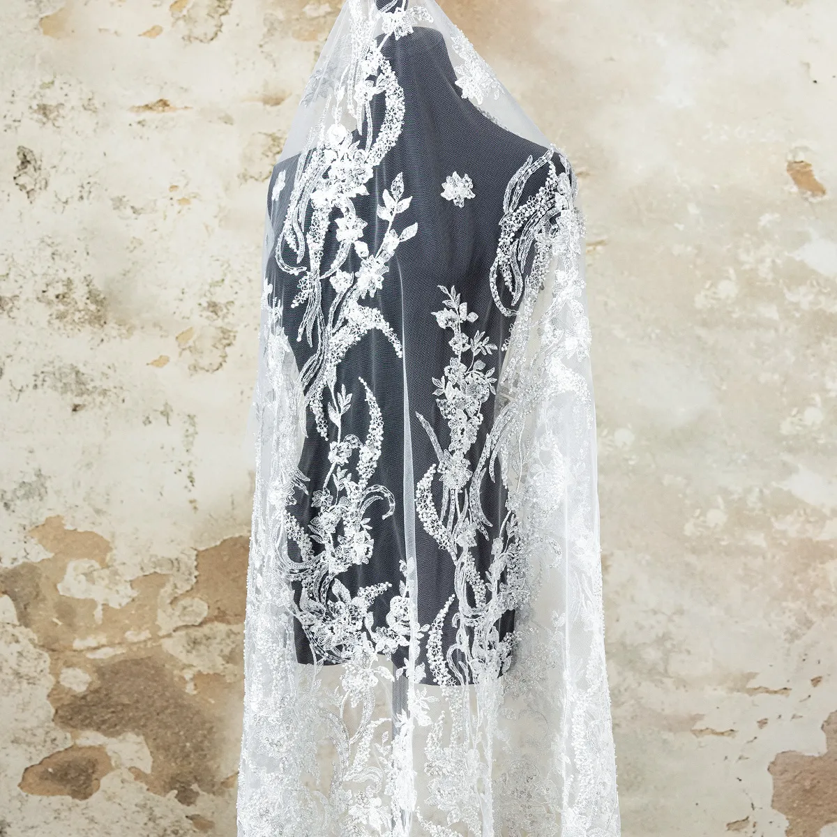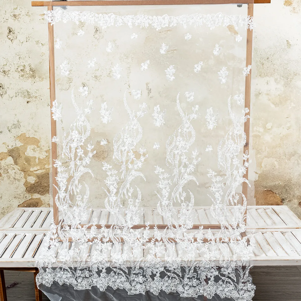 Prepare to be dazzled by this ultra-luxurious, heavyweight bridal lace fabric. Weighing an impressive 350 grams per yard, this couture-grade masterpiece features a dense, scalloped border that gracefully transitions into elegant vertical climbing floral vines. The entire motif is heavily embellished with high-quality clear beads and transparent sequins, creating a breathtaking, multidimensional shimmer that catches the light beautifully without altering the pristine color.