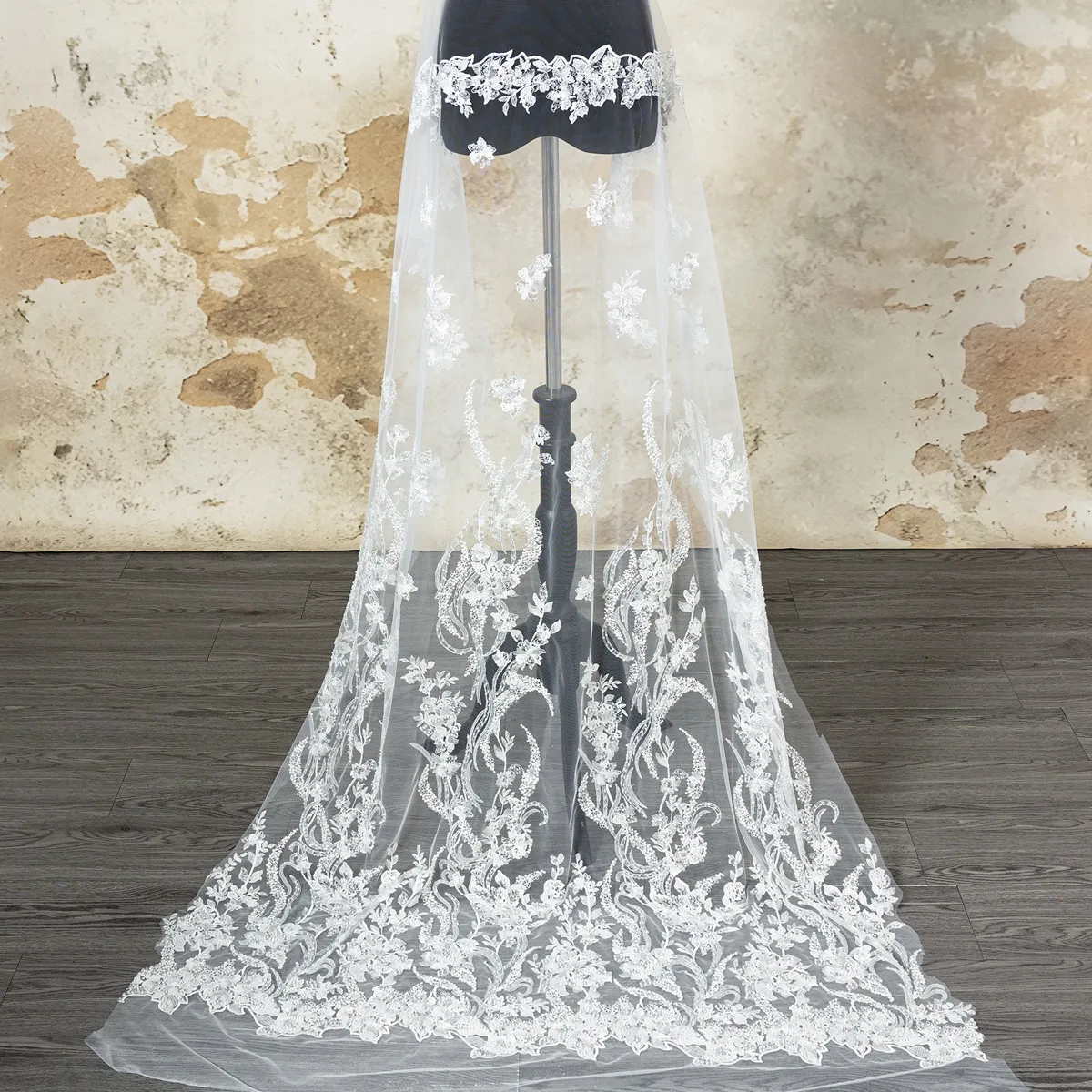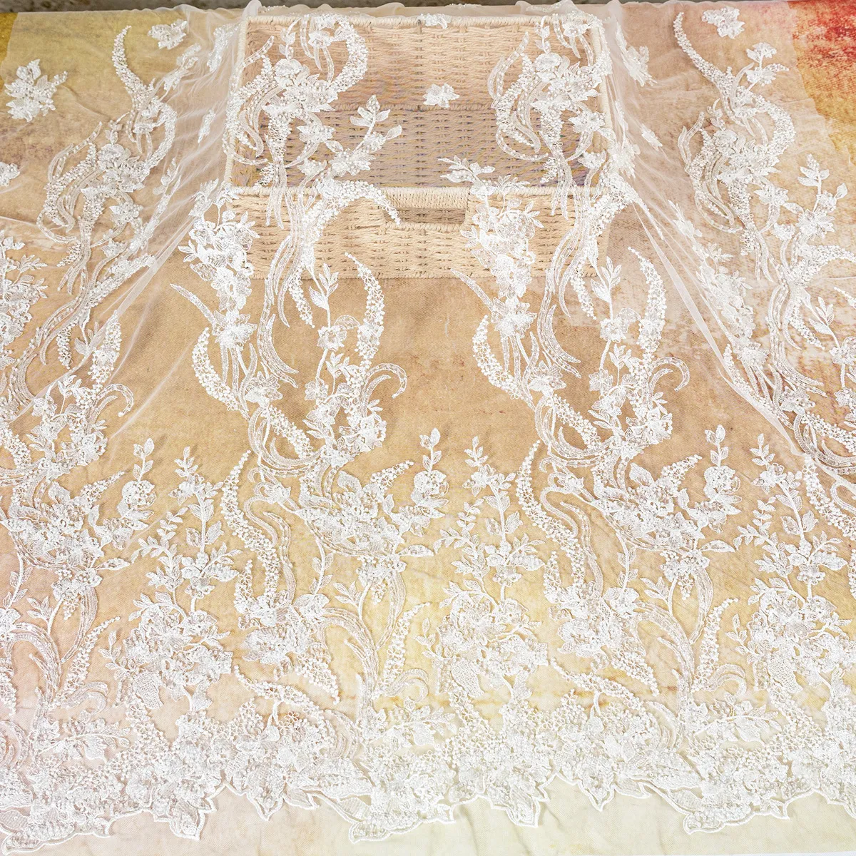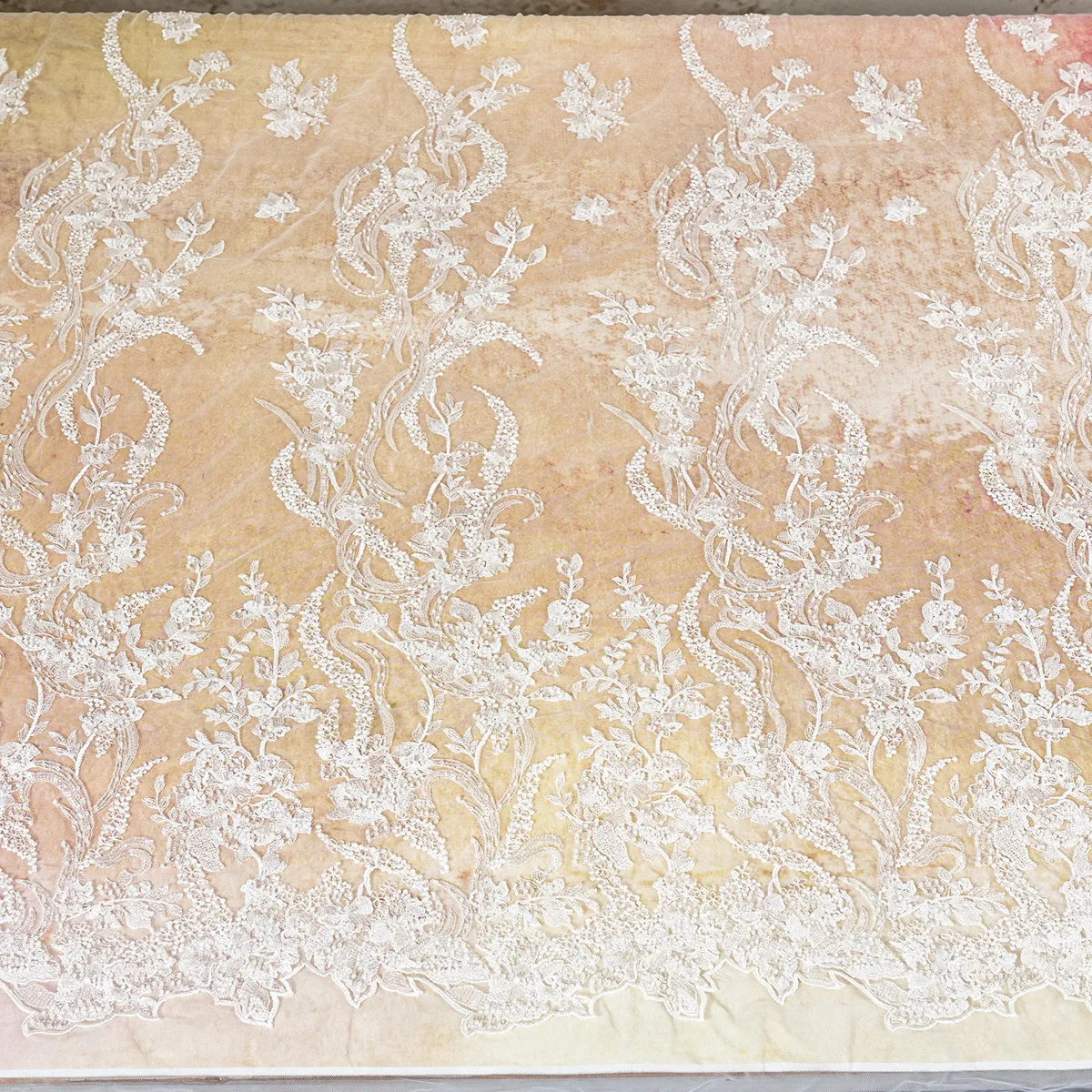 Prepare to be dazzled by this ultra-luxurious, heavyweight bridal lace fabric. Weighing an impressive 350 grams per yard, this couture-grade masterpiece features a dense, scalloped border that gracefully transitions into elegant vertical climbing floral vines. The entire motif is heavily embellished with high-quality clear beads and transparent sequins, creating a breathtaking, multidimensional shimmer that catches the light beautifully without altering the pristine color.