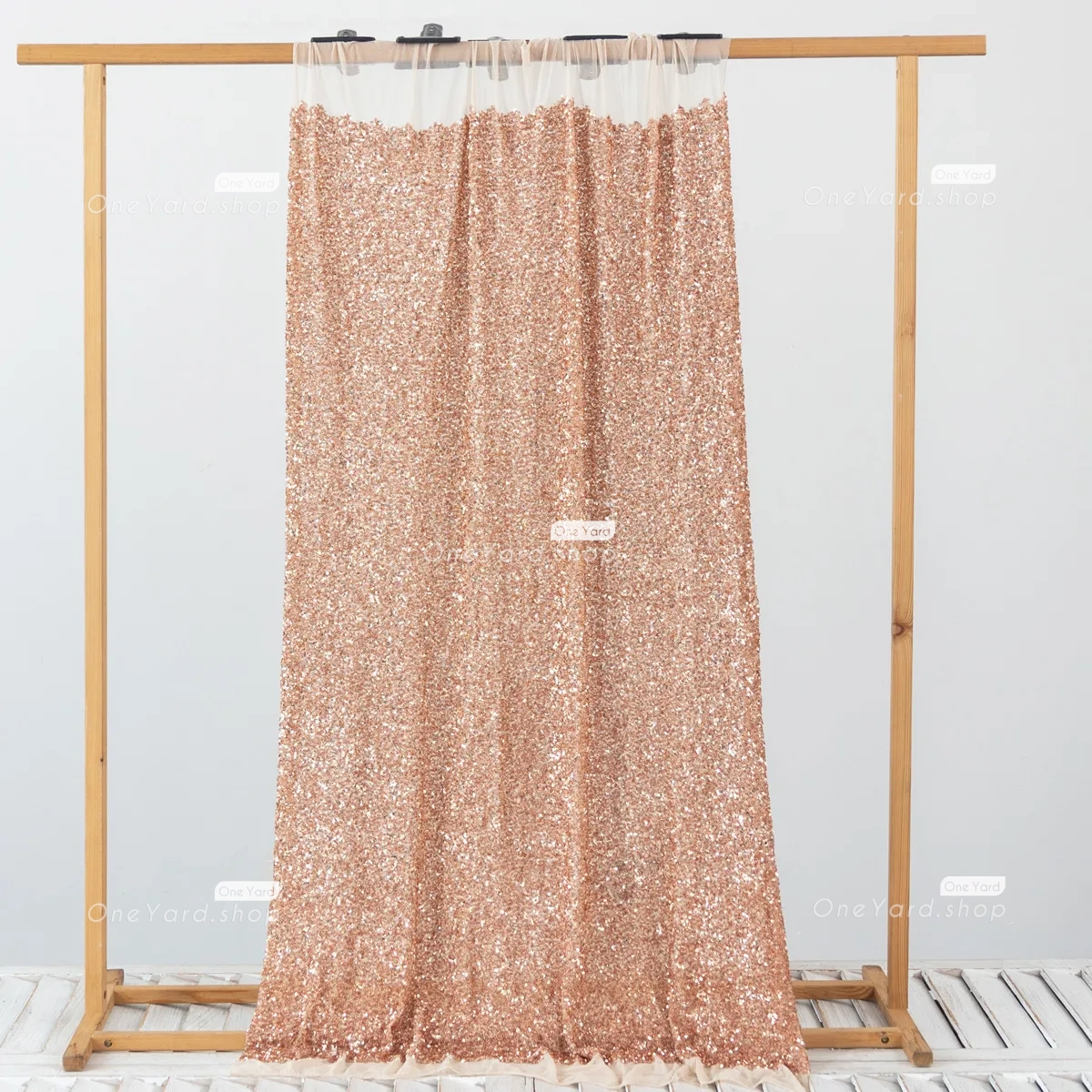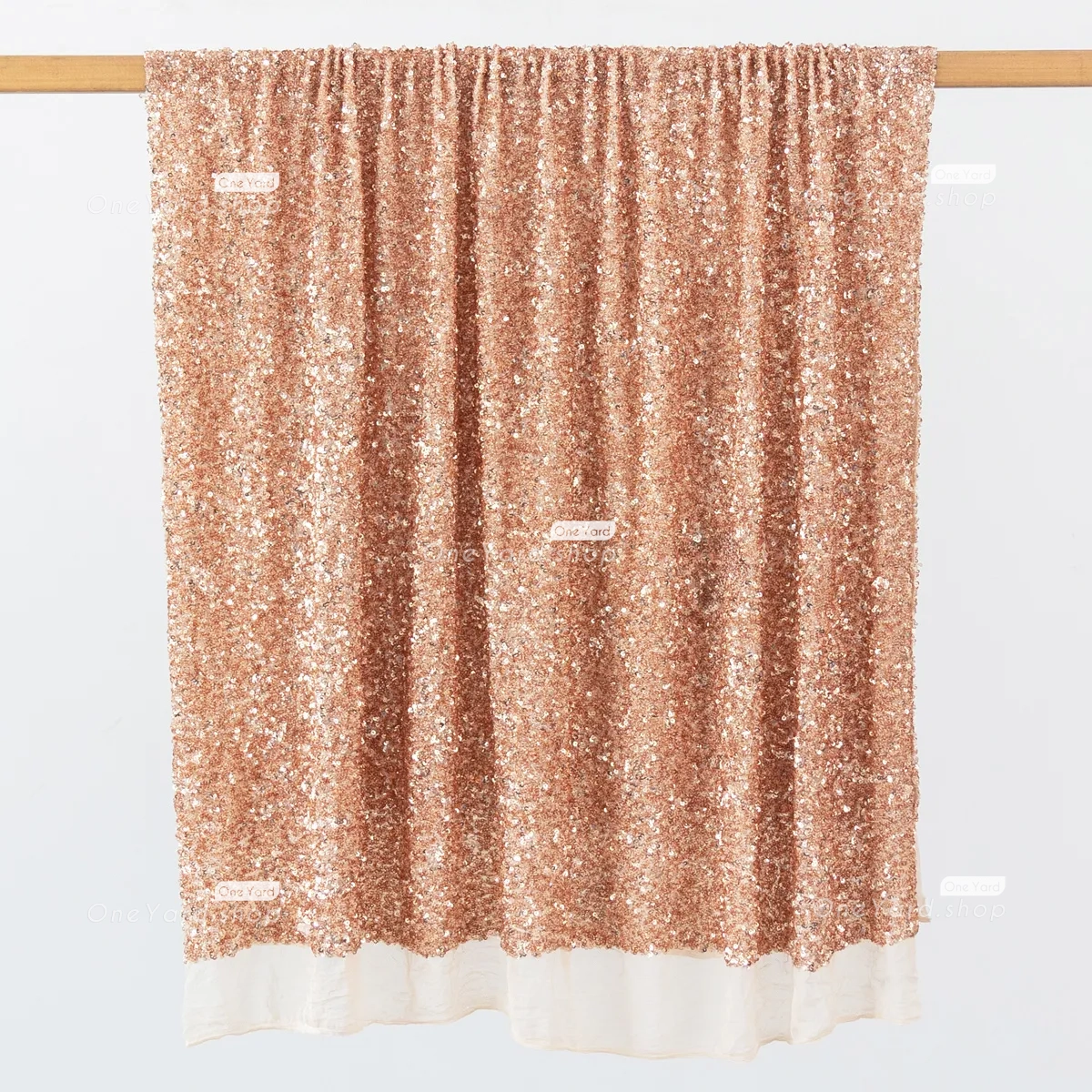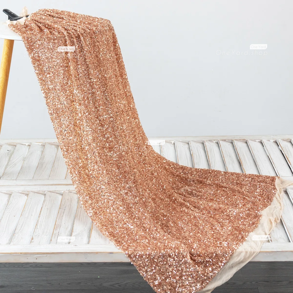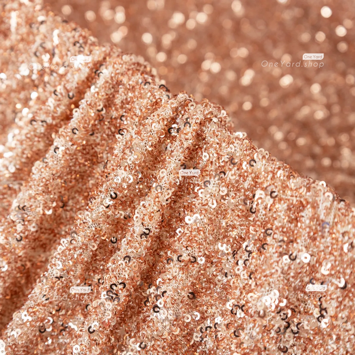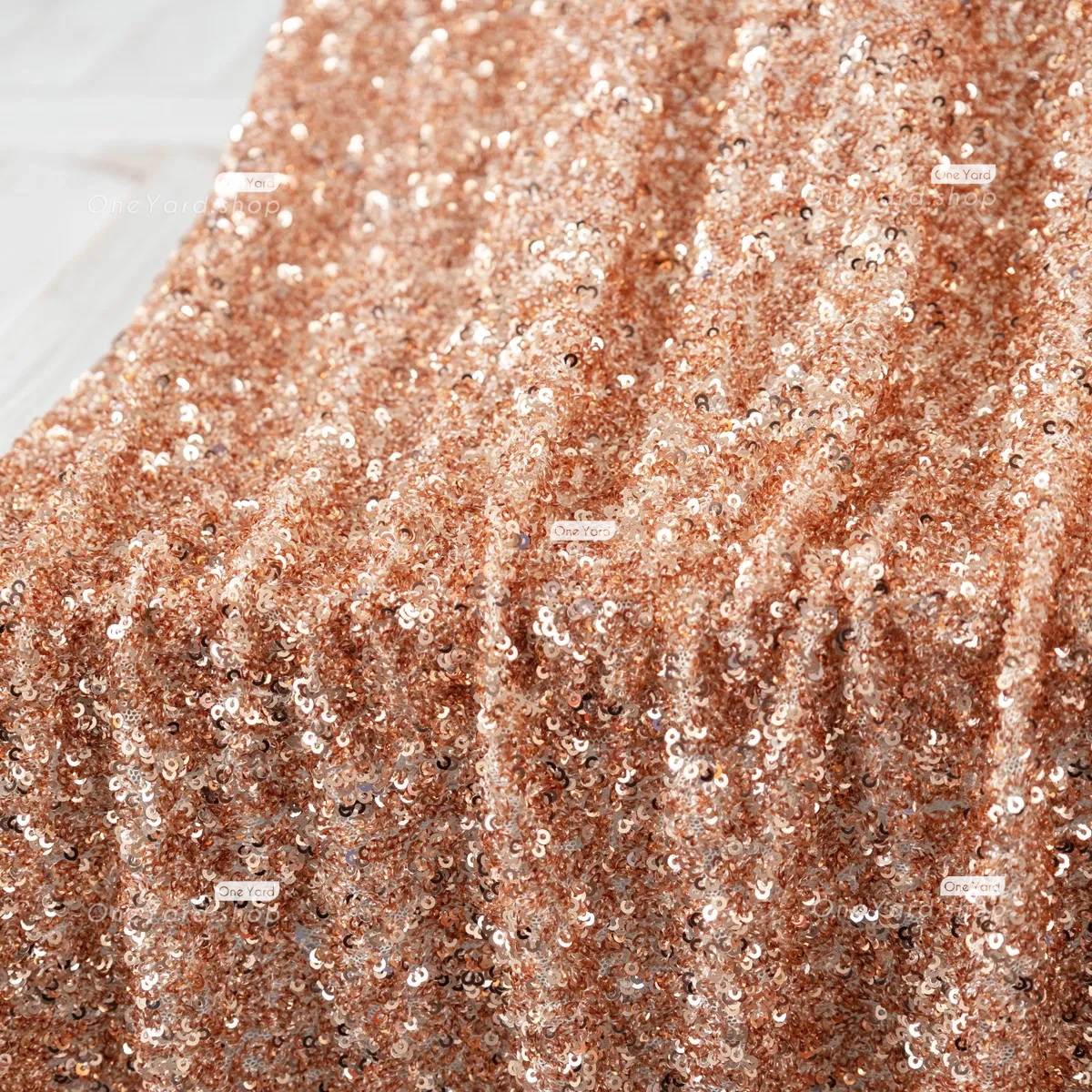 This high-density whiskey color micro sequin fabric combines the best of both worlds: the delicate stretch of tulle and the captivating sparkle of sequins. The sequins are meticulously sewn onto a lightweight stretch mesh nylon backing, creating a textured look and feel. With its 2-way stretch, this fabric drapes beautifully and is ideal for various glamorous creations, including gowns, event tablecloths, overlays, and dancewear.